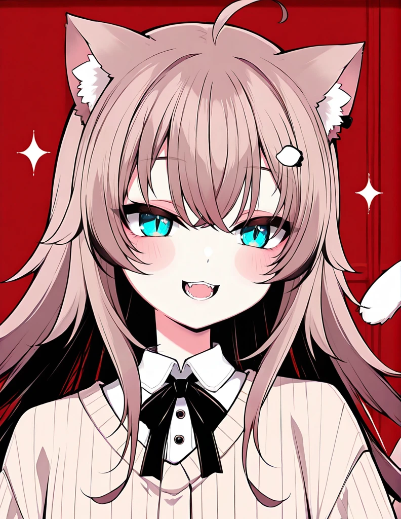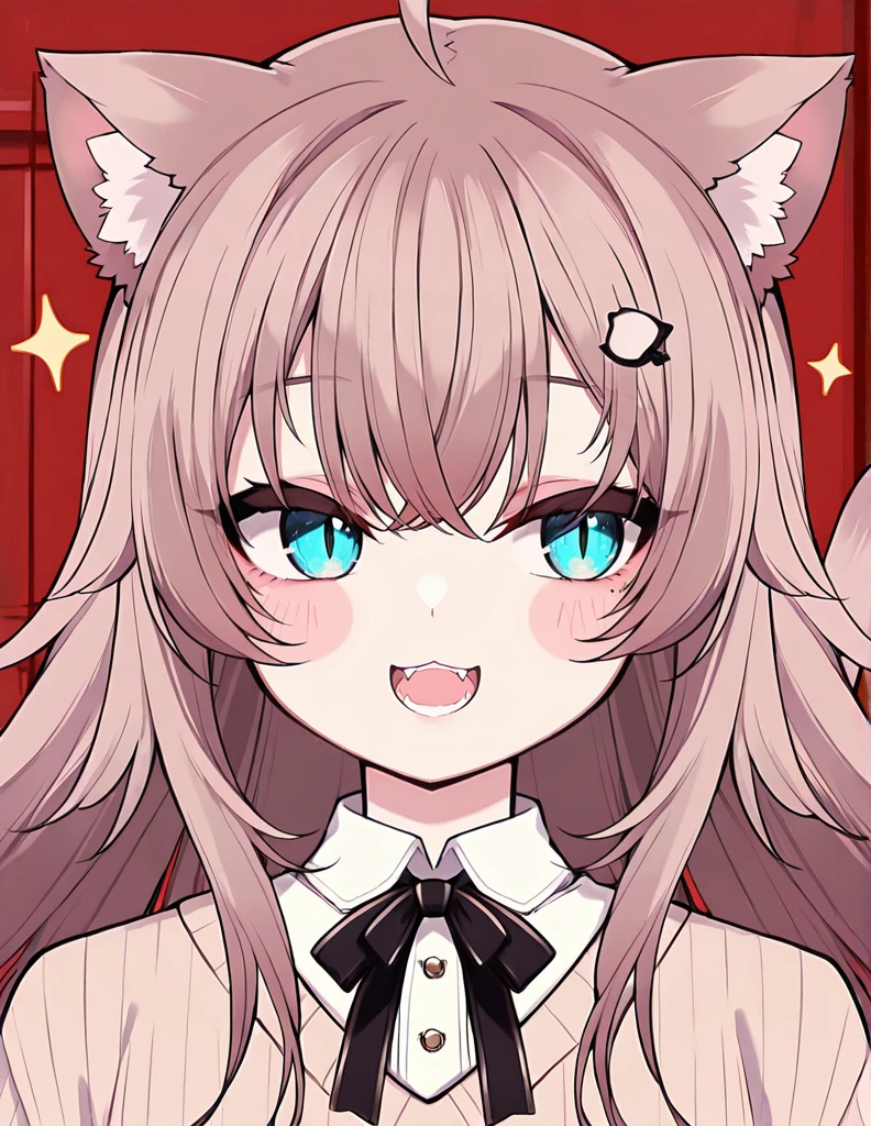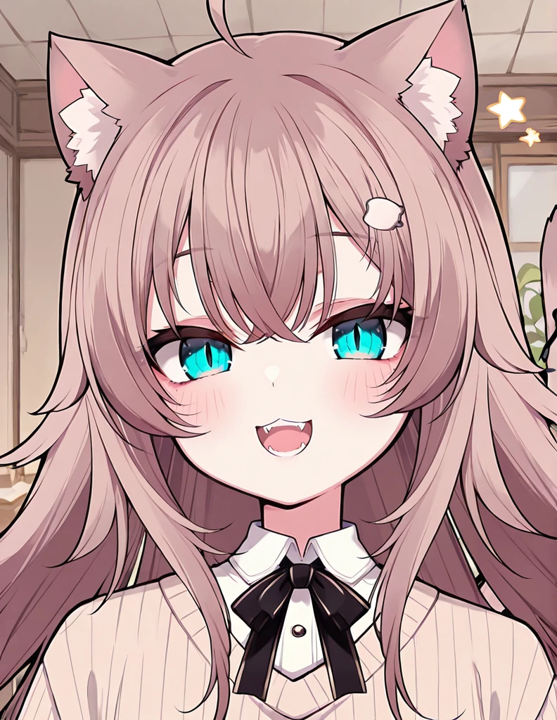 meowdem, 1girl, solo, long hair, blue eyes,brown hair, hair ornament, animal ears, hair between eyes, tail, ahoge, virtual youtuber, cat ears, animal ear fluff, aqua eyes,cat tail, light brown hair, cat girl, slit pupils, crossed bangs, , cat hair ornament,