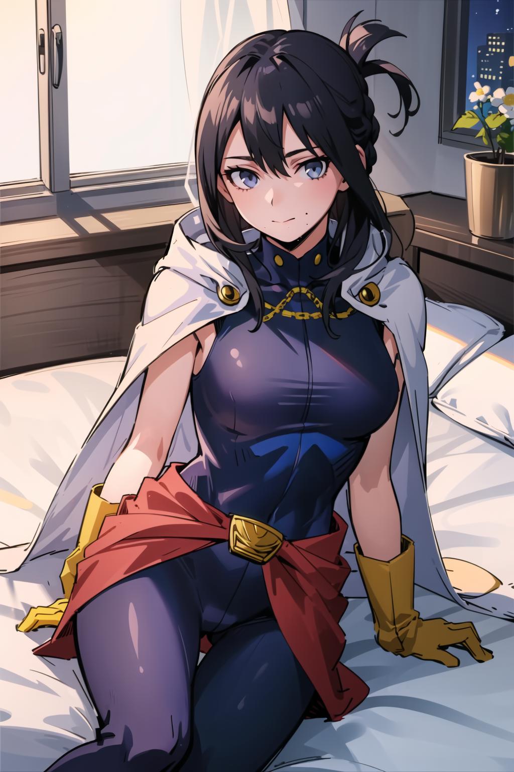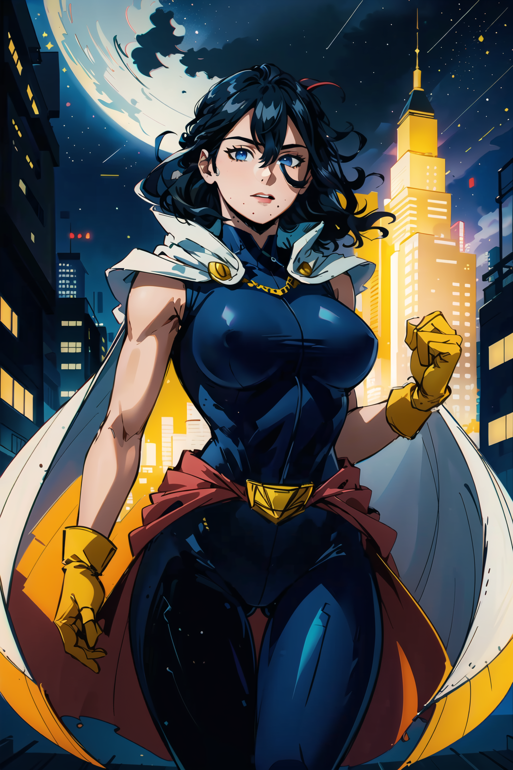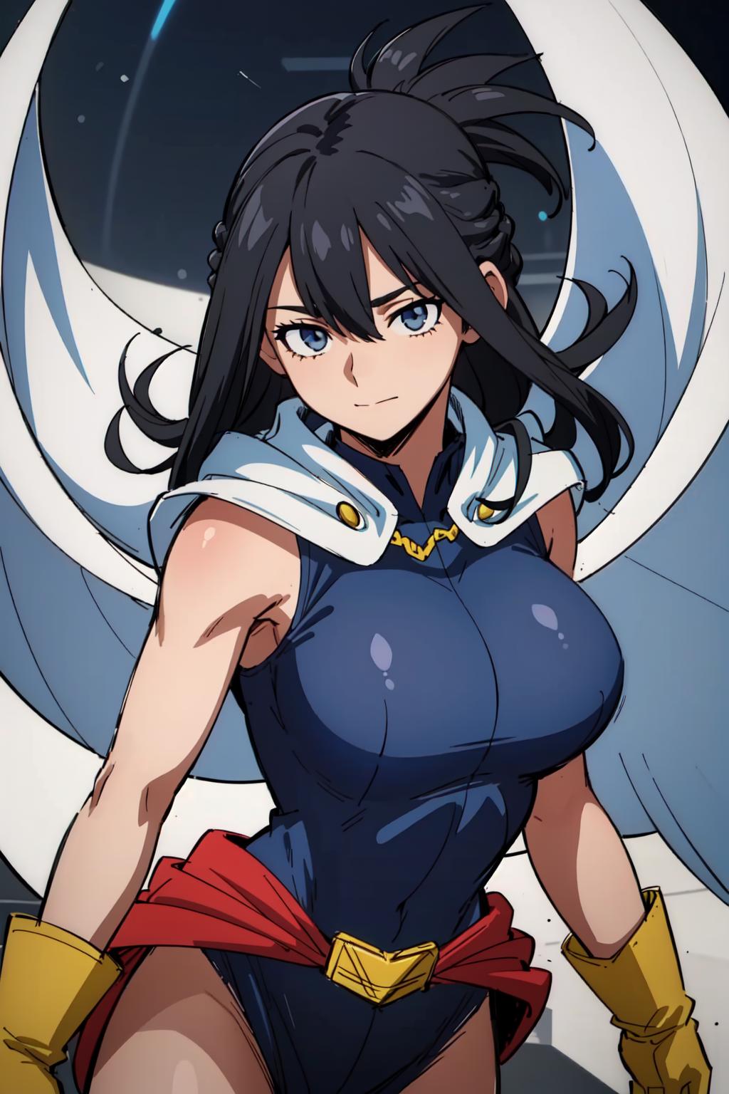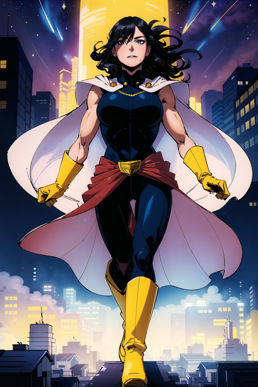 black hair, blue eyes, hair between eyes, sleeveless, red belt, white cape, yellow gloves, whole bodysuit, yellow footwearSome Negatives that may help: