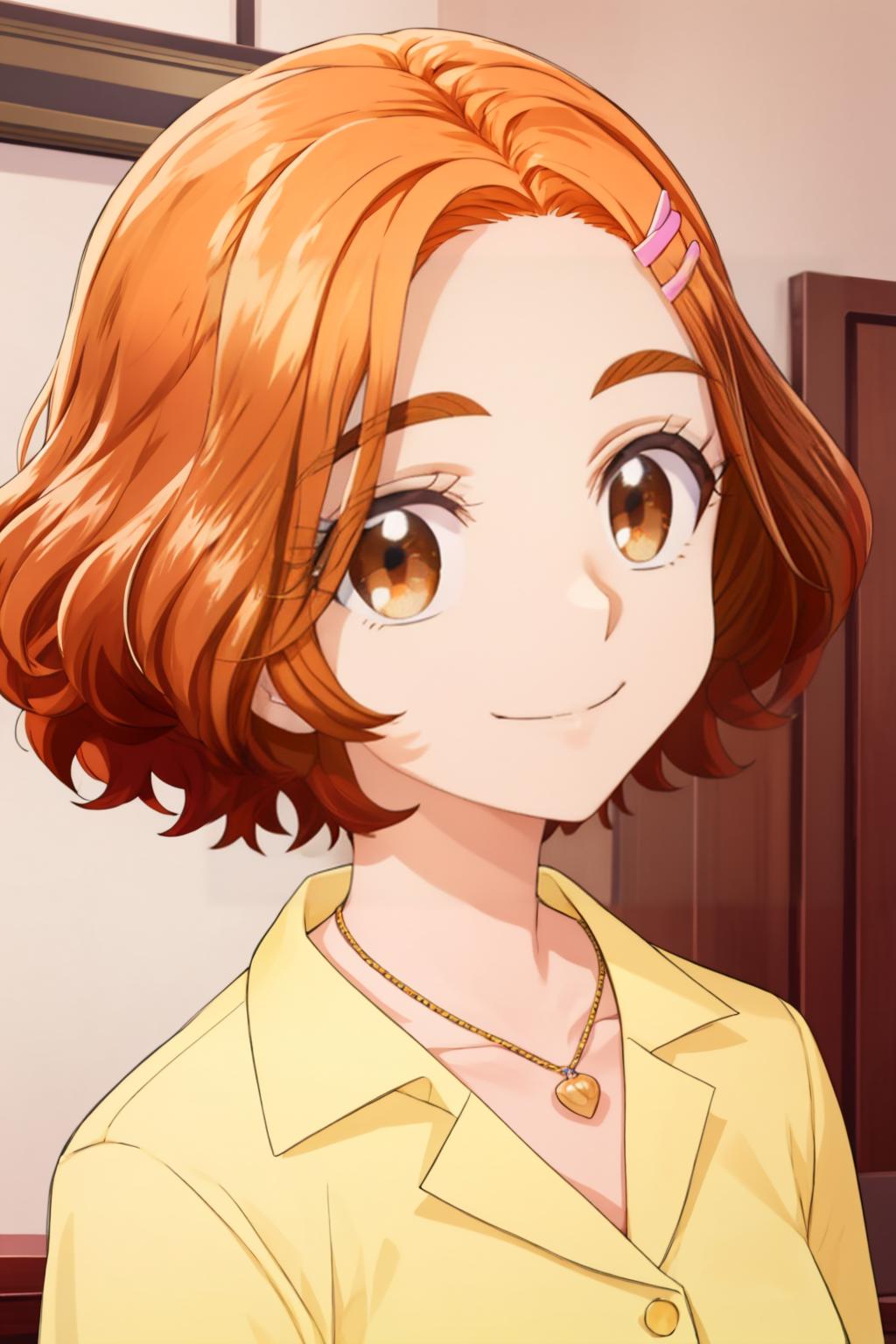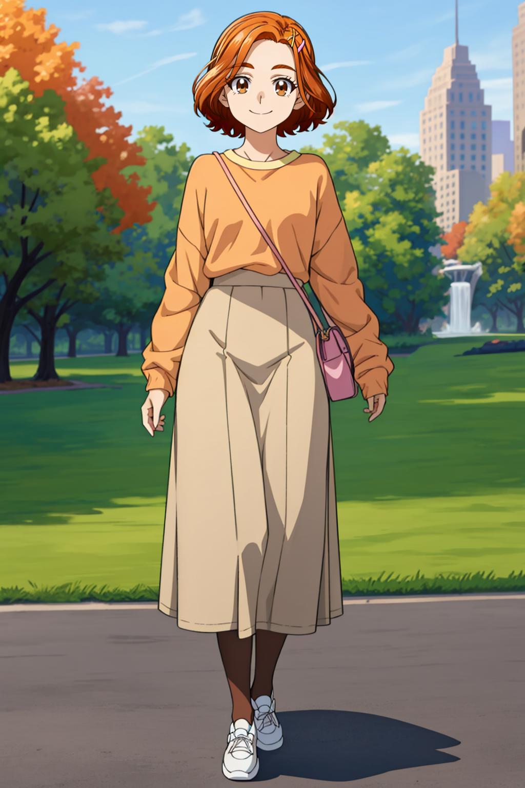 Outfit3: orange long sleeves, khaki skirt, long skirt, pantyhose, brown and white shoes, short hair, hairclip