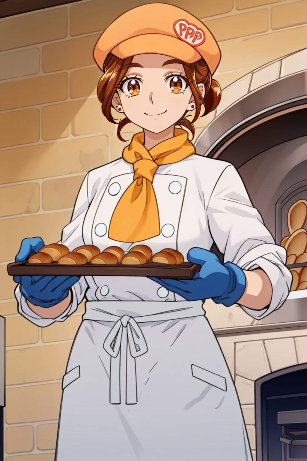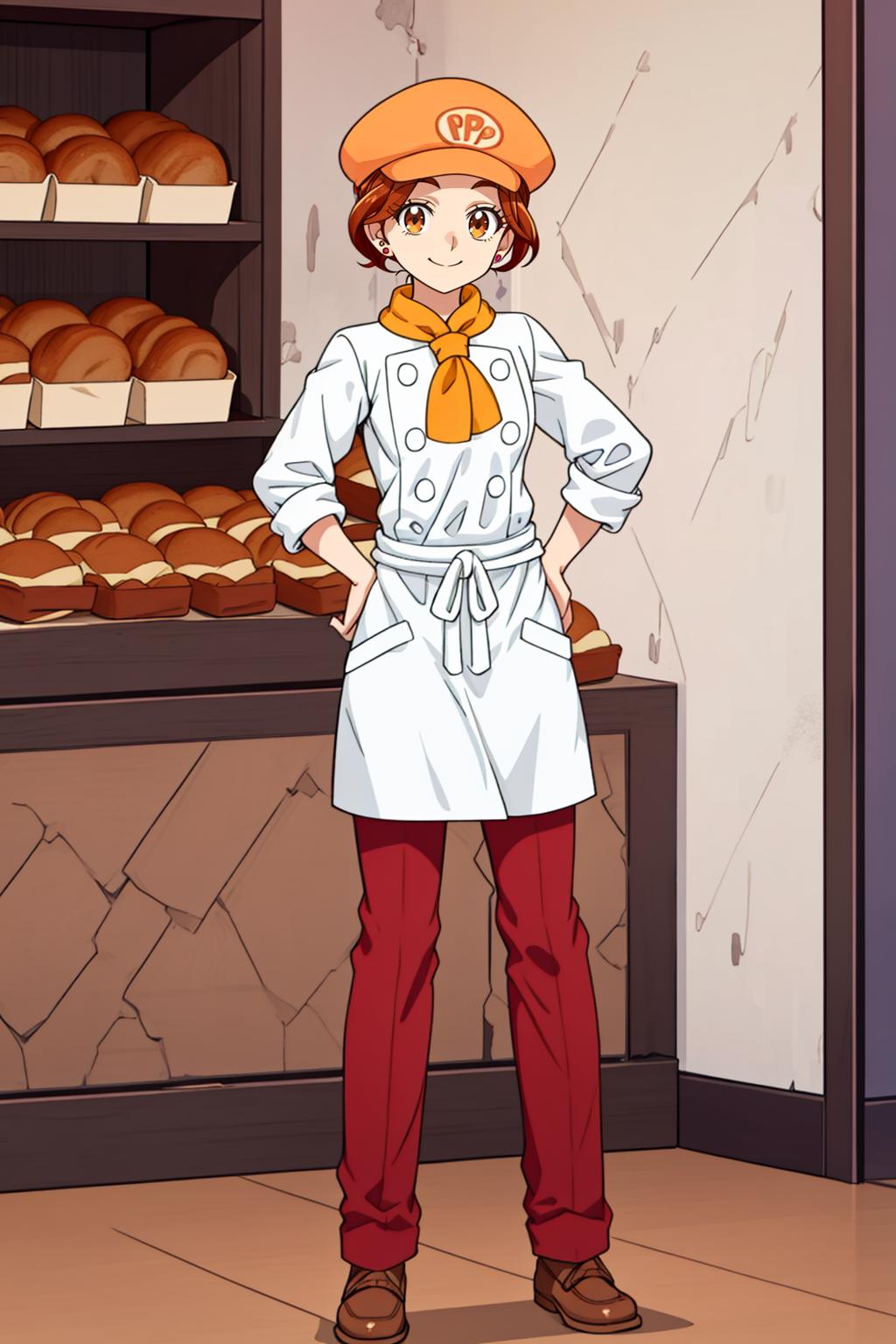 Outfit2: orange cabbie hat, yellow neckerchief, chef coat, waist apron, red pants, brown shoes, earrings, ponytail