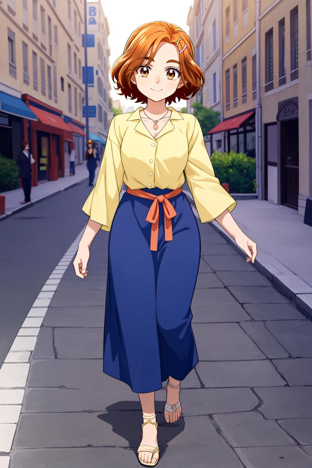 Outfit1: yellow shirt, blue skirt, long skirt, pink sash belt, necklace, yellow sandals, earrings, short hair, hairclip