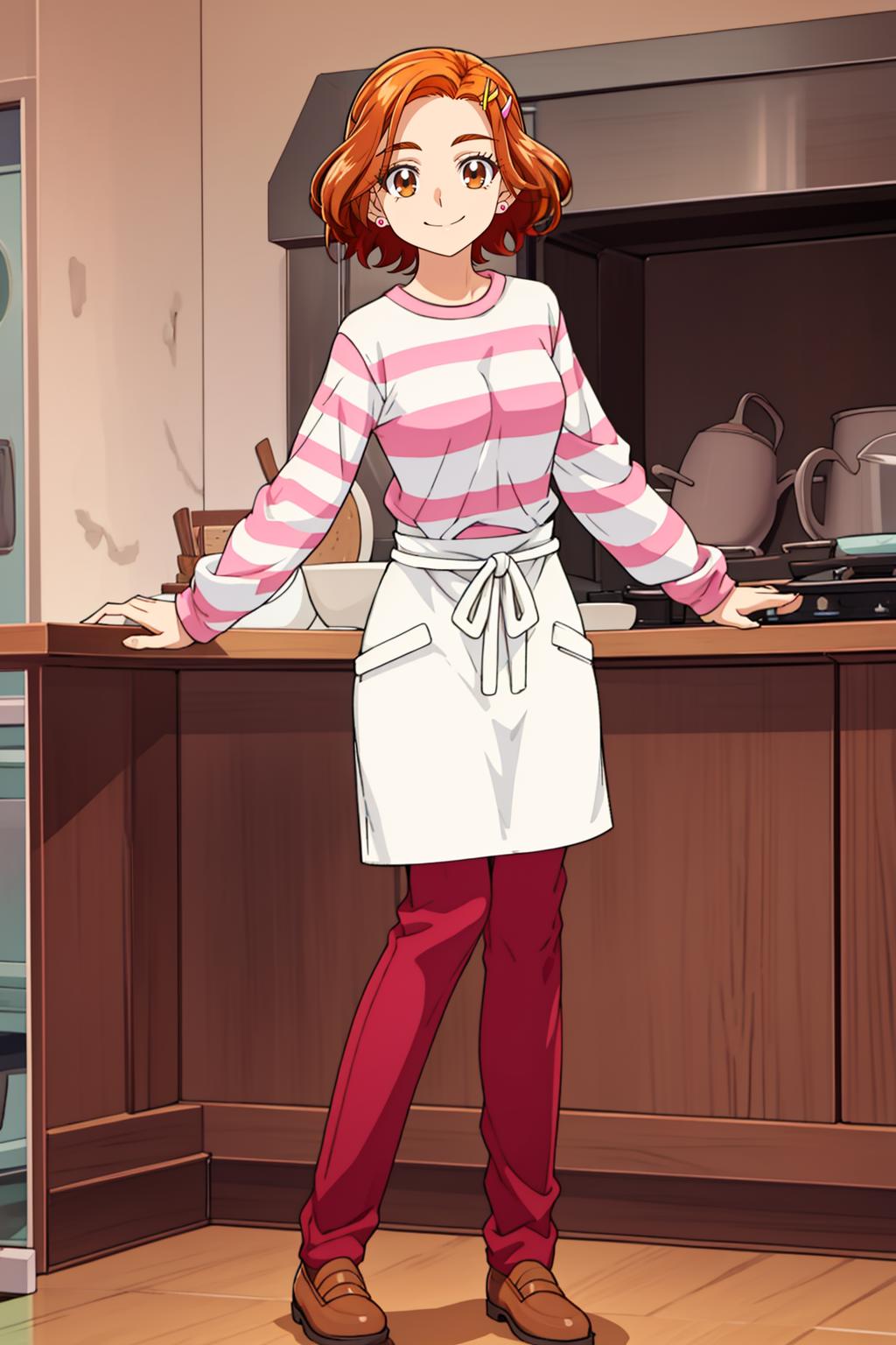 Outfit2.5: pink striped shirt, waist apron, red pants, brown shoes, earrings, short hair, hairclip