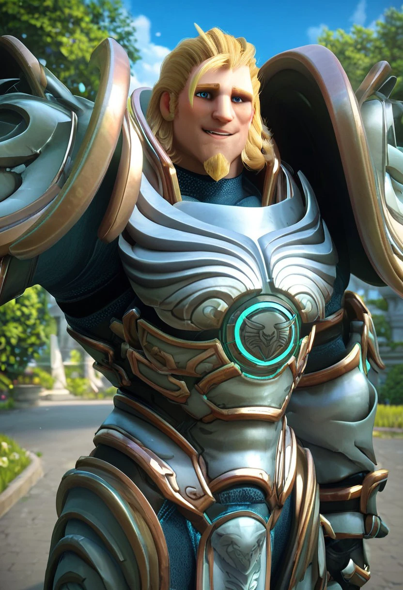 To generate his actual crusader outfit - reinhardt \(crusader\) \(overwatch\), 1boy, medium hair, blonde hair, goatee, blue eyes, armor, pauldron