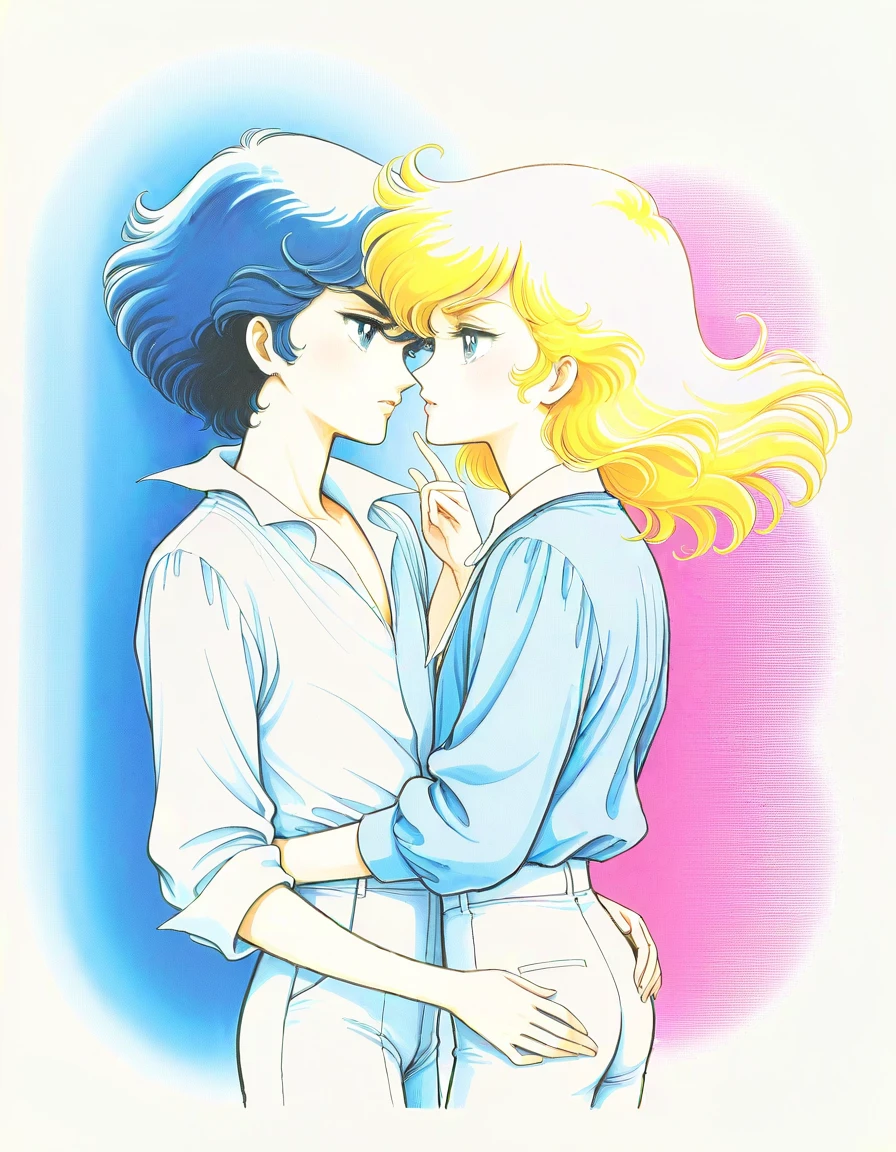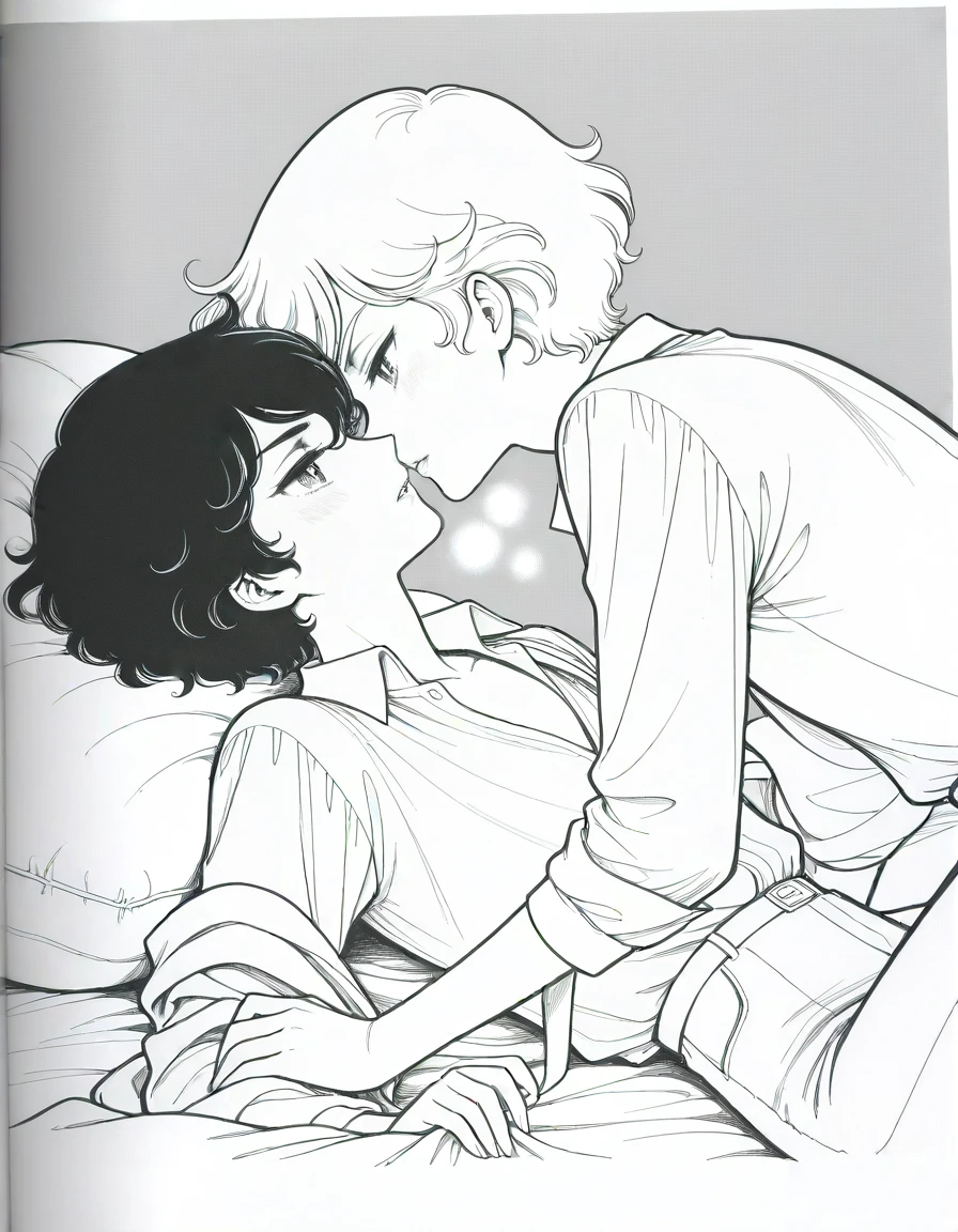 竹宮恵子, takemiya keito, androgynous, traditional media, 1970s \(style\), 1boy,2boys, yaoi, bl,aoi, { greyscale, monochrome,| partially colored,|halftone ,| watercolor \(medium\), | soft color| pastel colors, }
