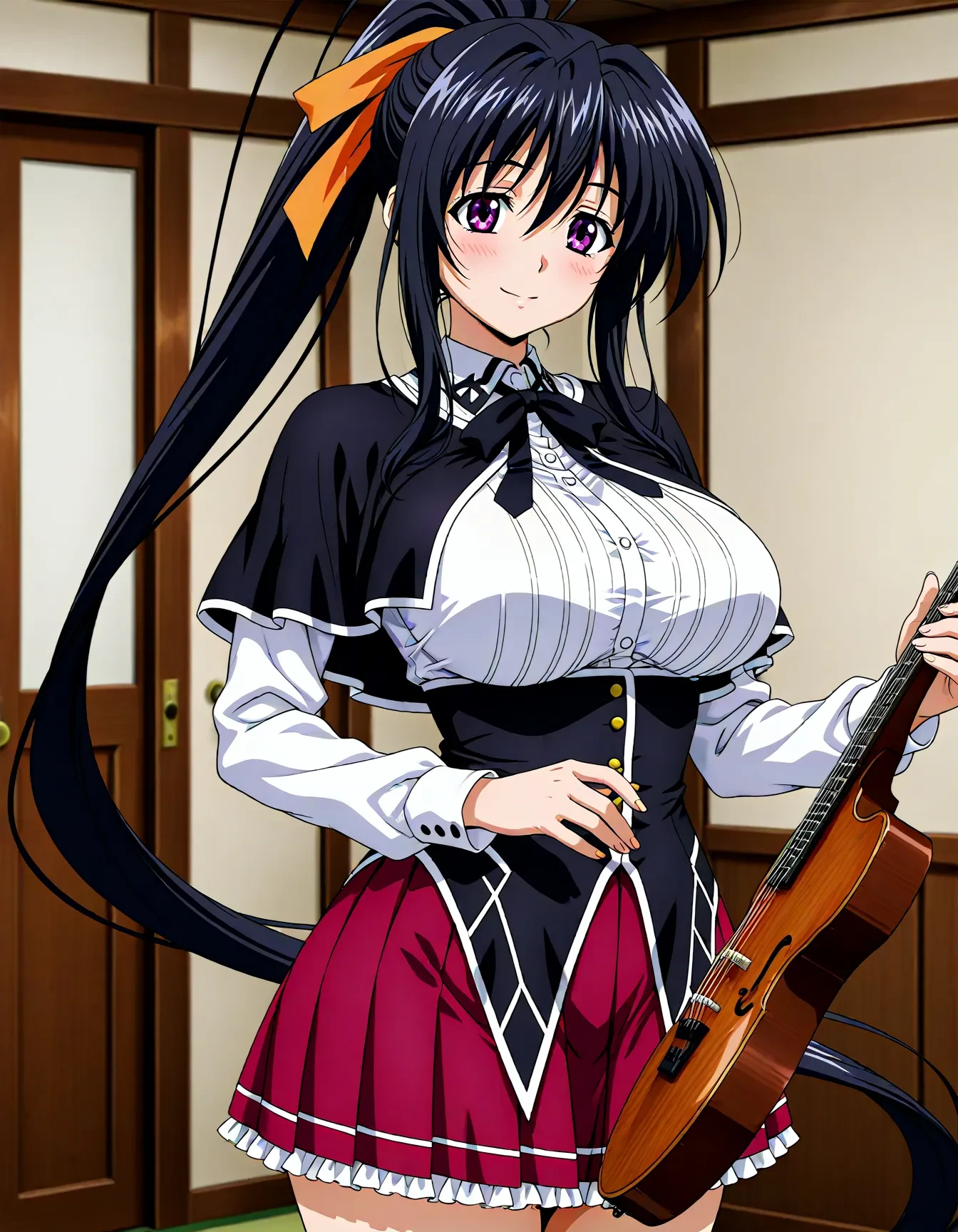 kuoh academy school uniform, black corset, collared shirt,black ribbon, black bowtie, red skirt, pleated skirt, frills, black capelet, long sleeves, black socks, brown shoes