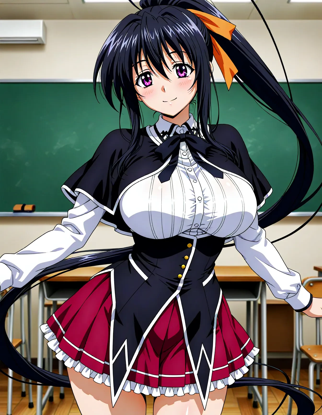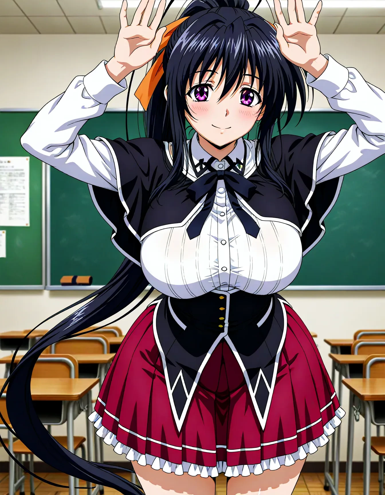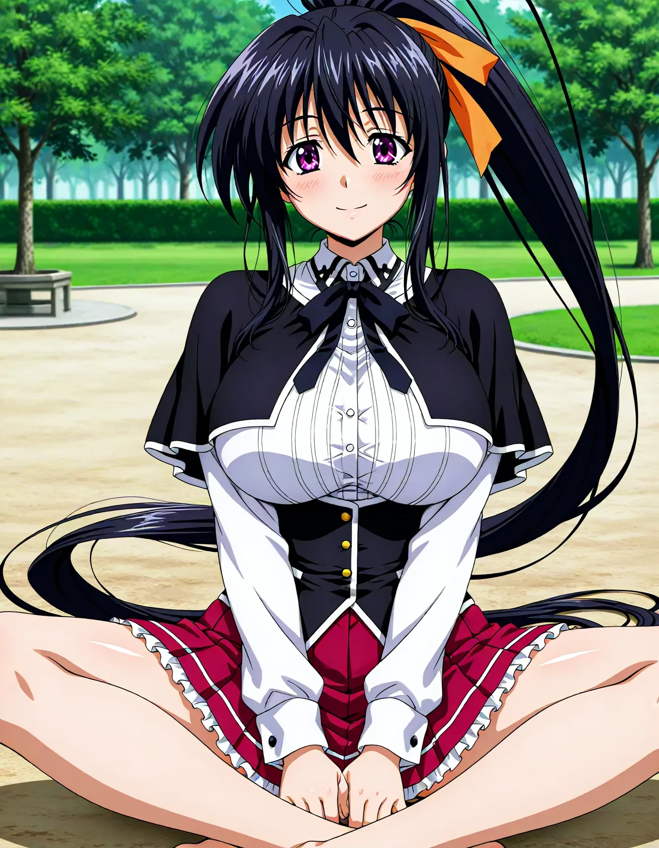 himejima akeno, purple eyes, ponytail, absurdly long hair, orange ribbon, hair ribbon