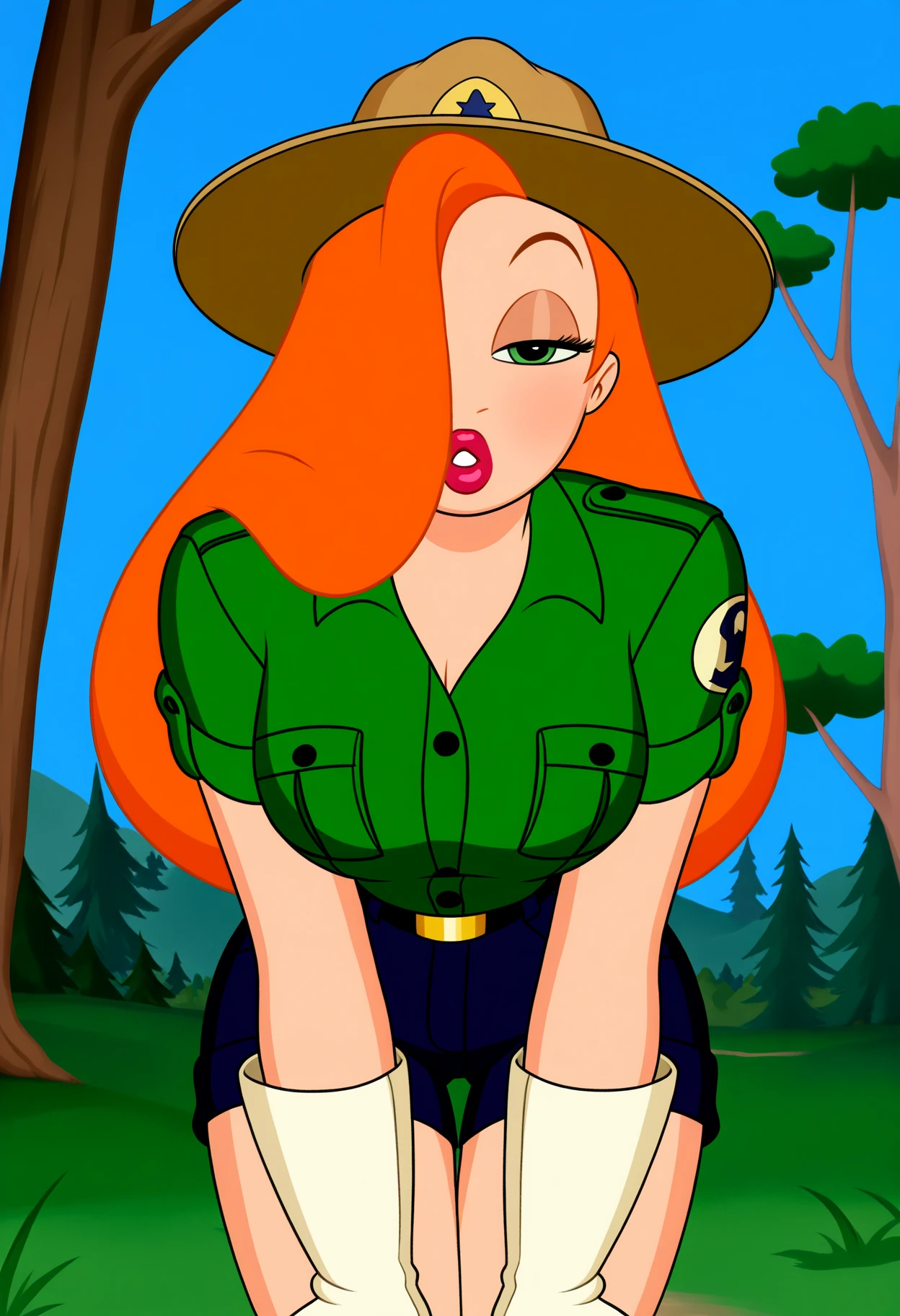 Park ranger prompts : jessicaranger, hat, green shirt, short sleeves, shorts, belt, white gloves, ranger uniform