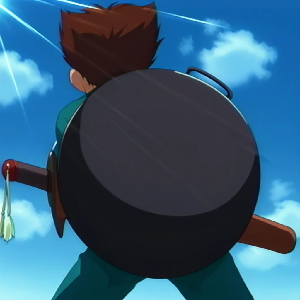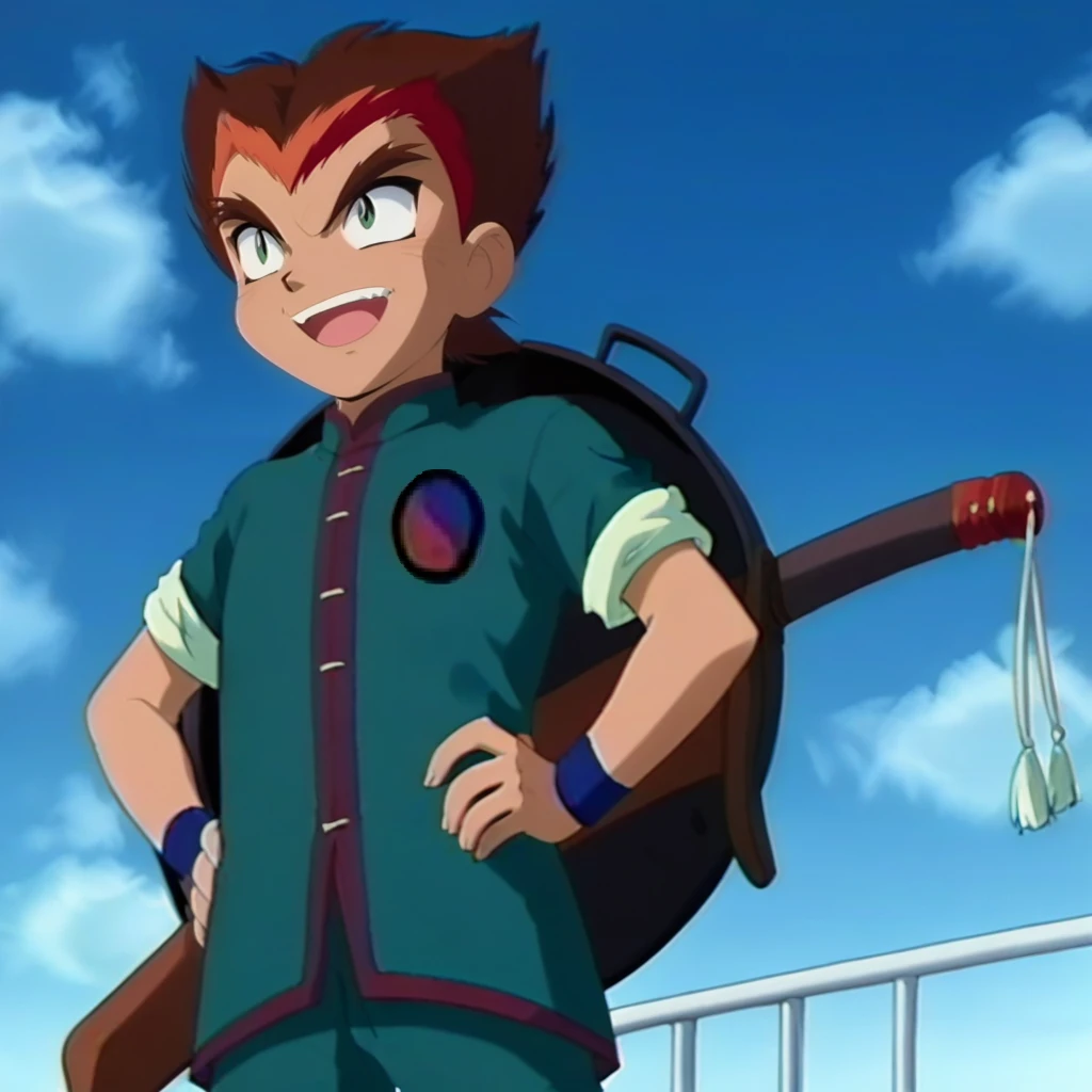 First Appearance: male, multicolored hair, three-tone hair, brown hair, orange hair, red hair, spiked hair, green eyes, thick eyebrows, whisker markings, Chinese clothes, short sleeves, blue wristbands, sword on back, sheathe, round shield on back, teal pants, black kung fu shoes