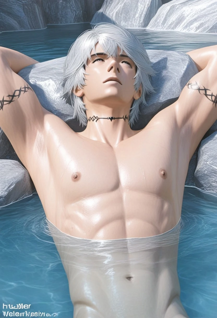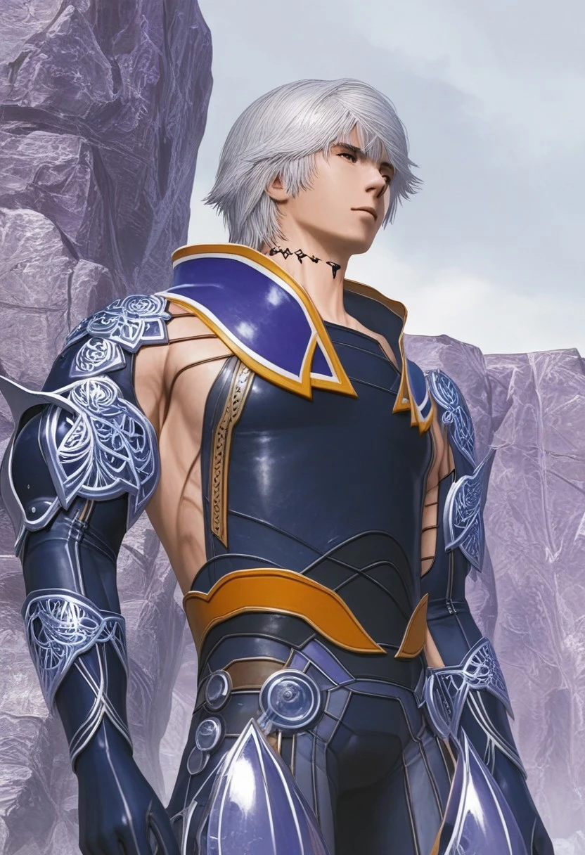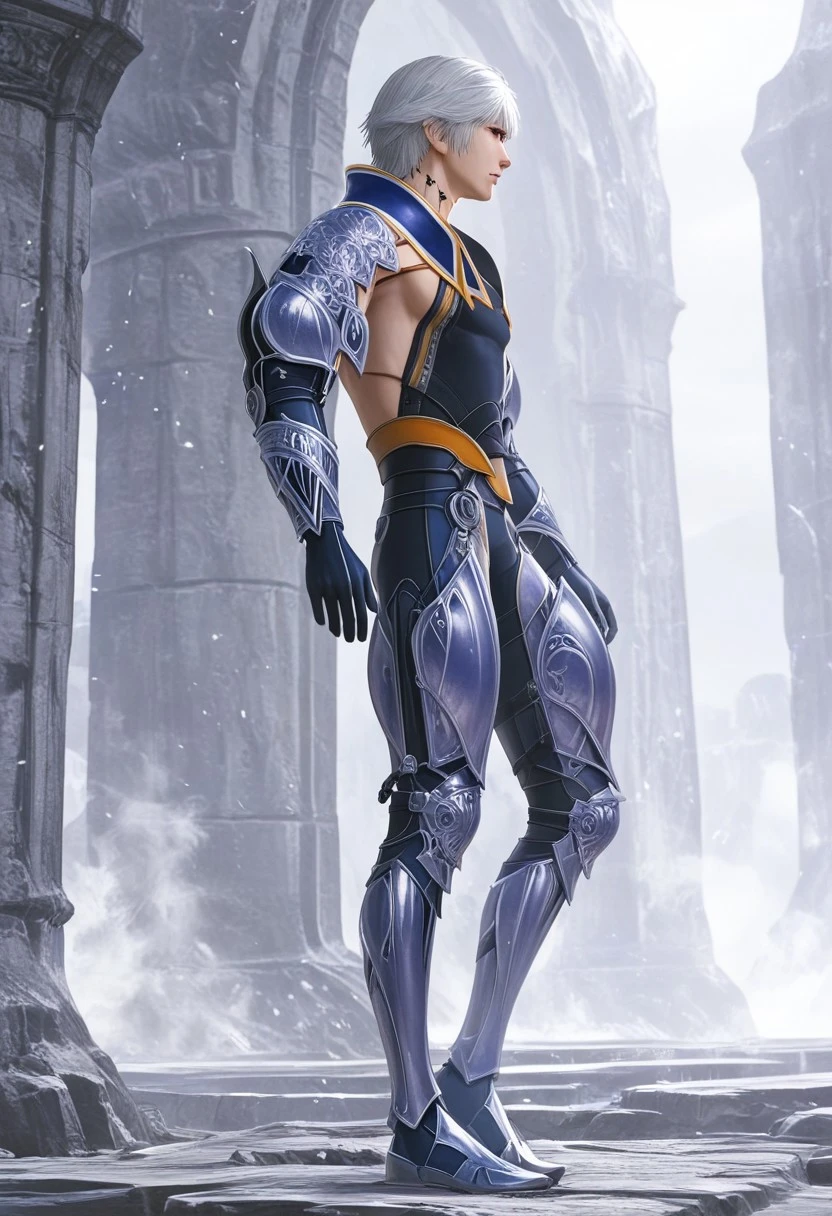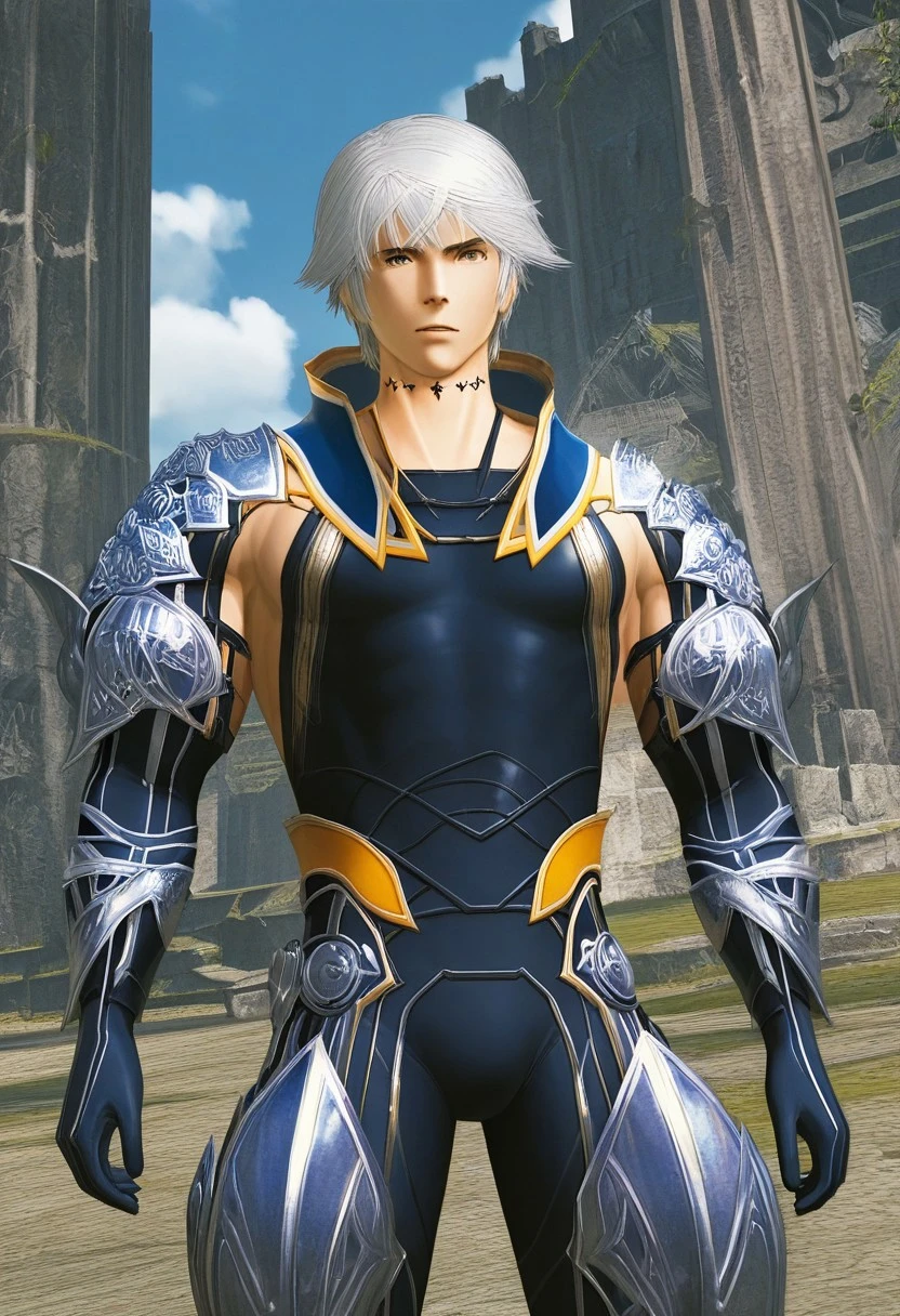 Wol, white-silver hair, hazel eyes, neck tattoo, arm tattoos, revealing outfit, sleeveless , backless outfit, back tattoos, detached collar, long elbow gloves, arm armor, finger armor, thigh armor, greaves, sabatons