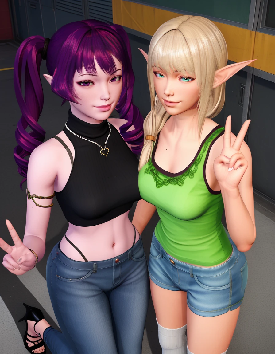 Normal Form: (a photo of RaeITR:1.2), lavender skin, colored skin, purple hair, multicolored hair, drill hair, twin drills, bangs, long hair, purple eyes, pointy ears, makeup, medium breasts, rae outfit