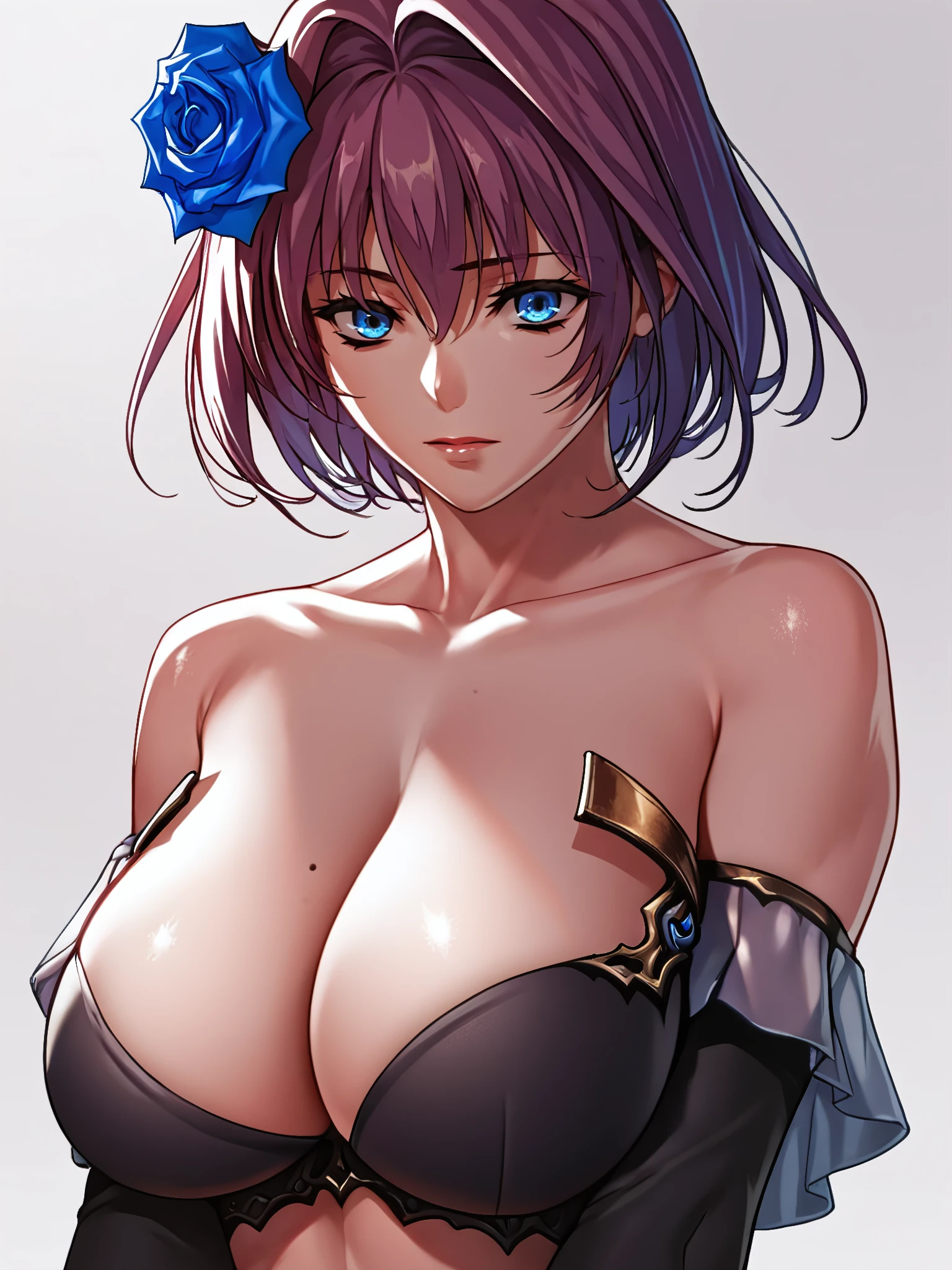 large breasts, black bikini, strapless, bridal sleeves, golden frame, blue rose in pink hair