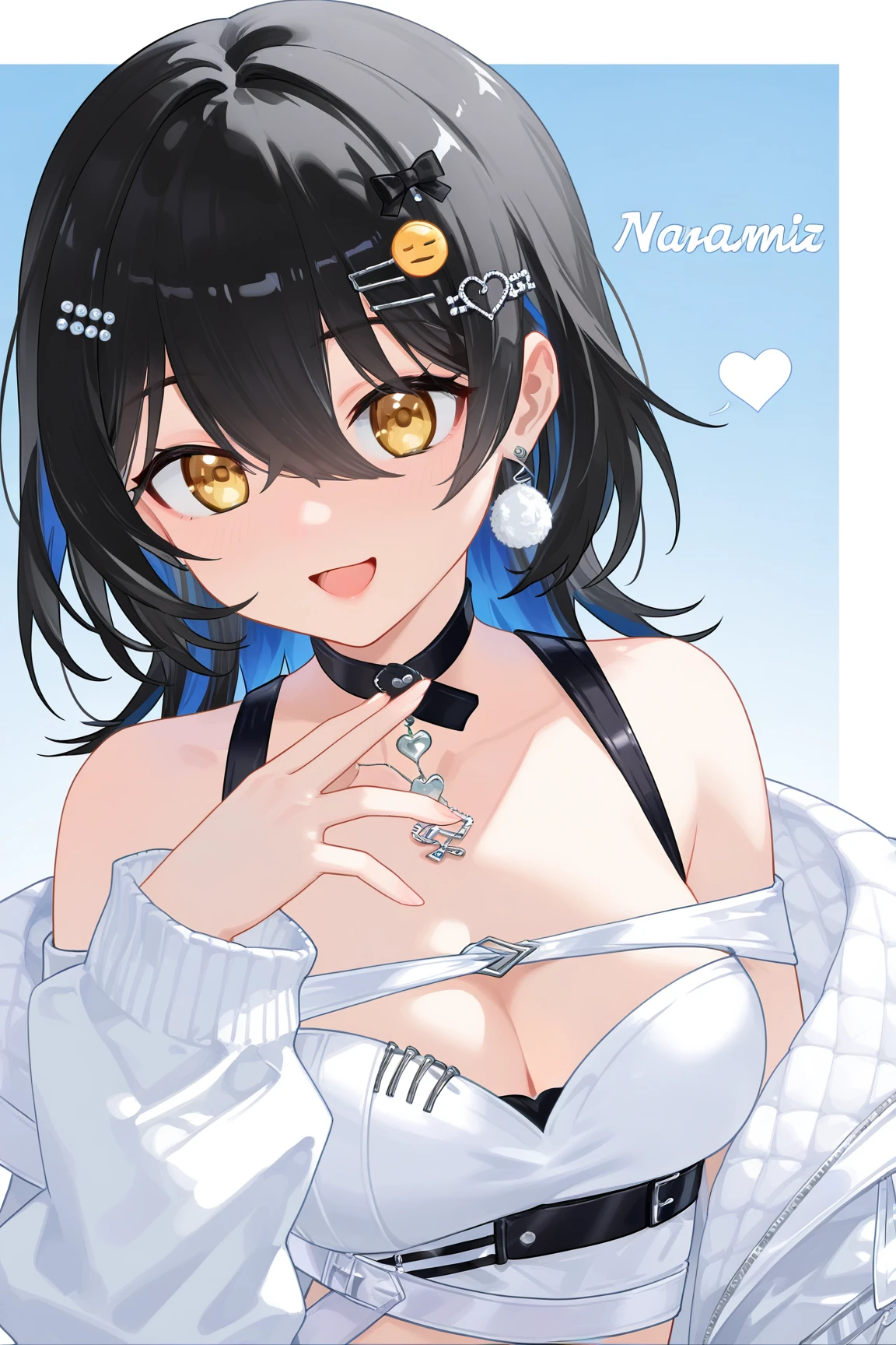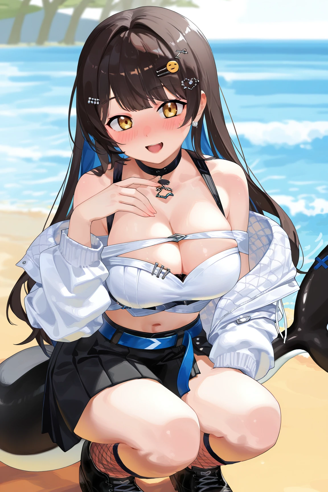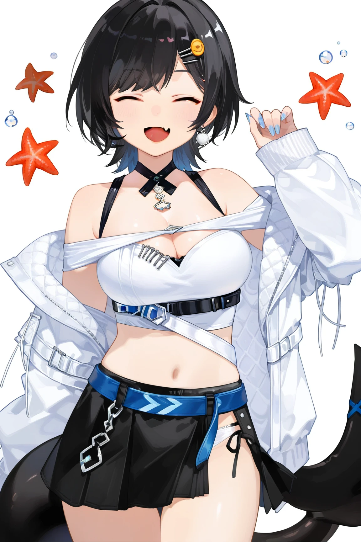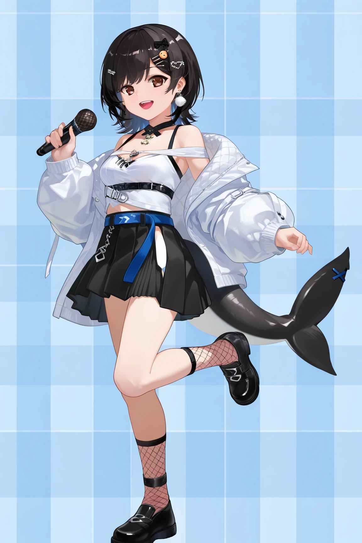 nanami \(virtuareal\) \(streetwear\), 1girl, solo, skirt, full body, black hair, jacket, black skirt, breasts, white jacket, black footwear, tail, boots, off shoulder, fish tail, hair ornament, fishnets,bare shoulders, socks, bag, jewelry, midriff, cleavage, multicolored hair, brown eyes, earrings, long sleeves, , crop top, fins, hairclip, choker, shirt, miniskirt, white shirt, , fishnet socks, colored inner hair, blue hair, belt, navel