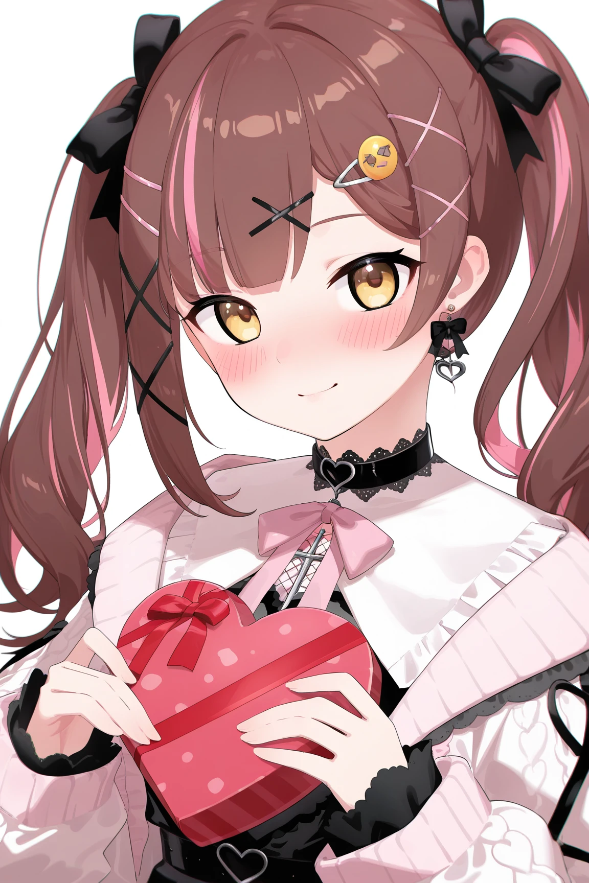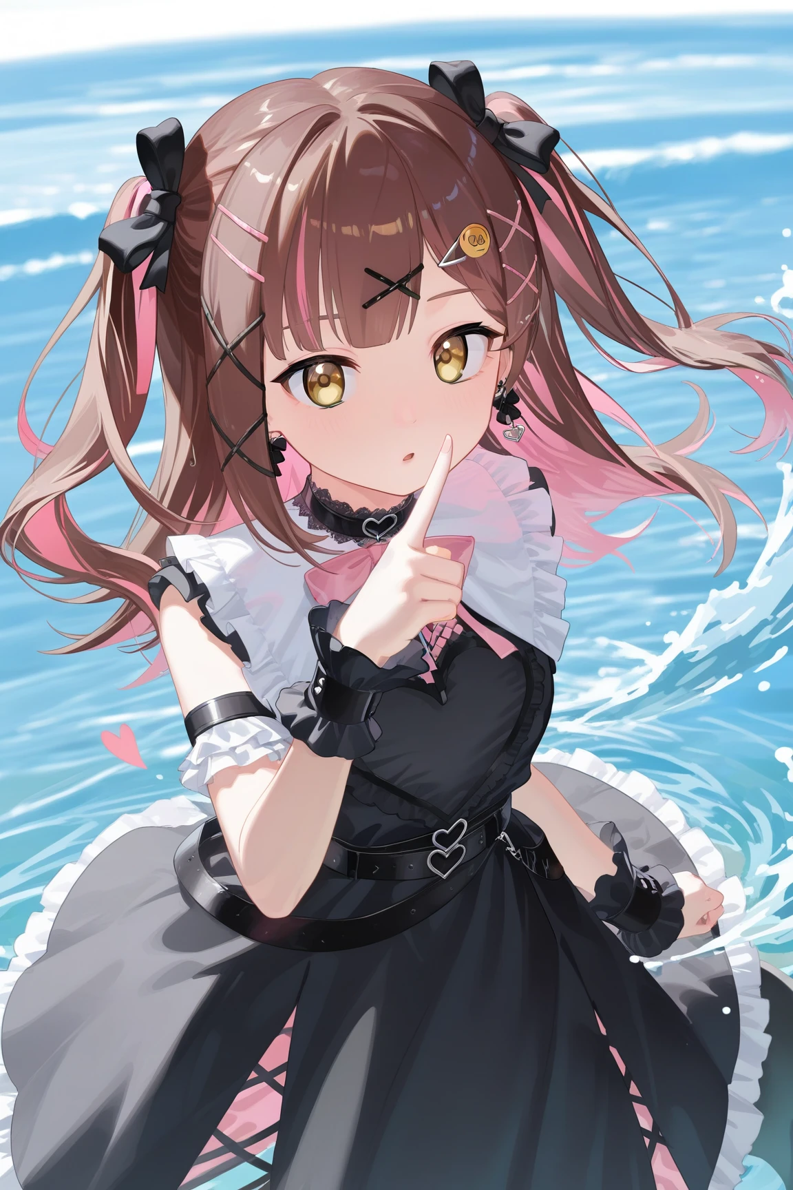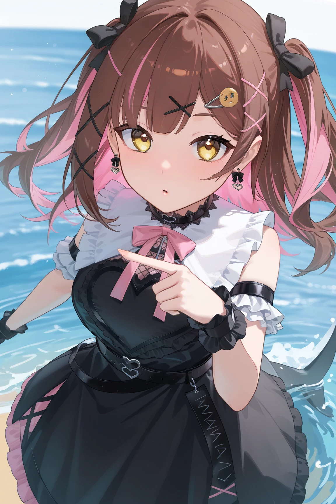nanami \(virtuareal\) \(jirai kei\), 1girl, solo, twintails, thighhighs, dress, brown hair, black footwear, jirai kei, hair ornament, black dress, socks, looking at viewer, asymmetrical legwear, virtual youtuber, thigh strap, single thighhigh, yellow eyes, hairclip, frills, fishnet socks, fishnets, ribbon, bow, standing, long hair