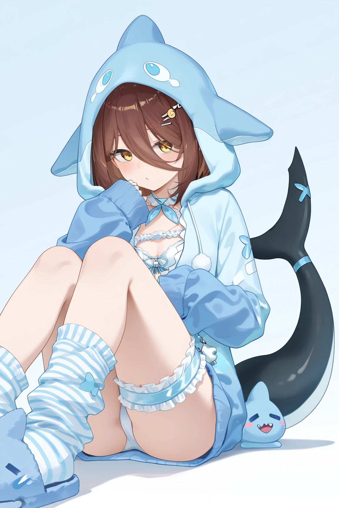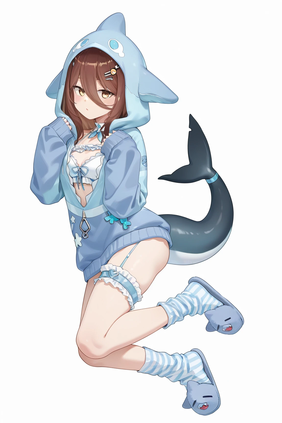 nanami \(virtuareal\) \(pyjamas\), 1girl, yellow eyes, brown hair, virtual youtuber, hair clip, hair ornament, tail, hood, hair between eyes, slippers, fish tail, sleeves past wrists, swimsuit, bridal garter, shark tail, animal hood, bikini, shark tail, hoodie, socks, blue hoodie,thigh strap,striped socks, fins