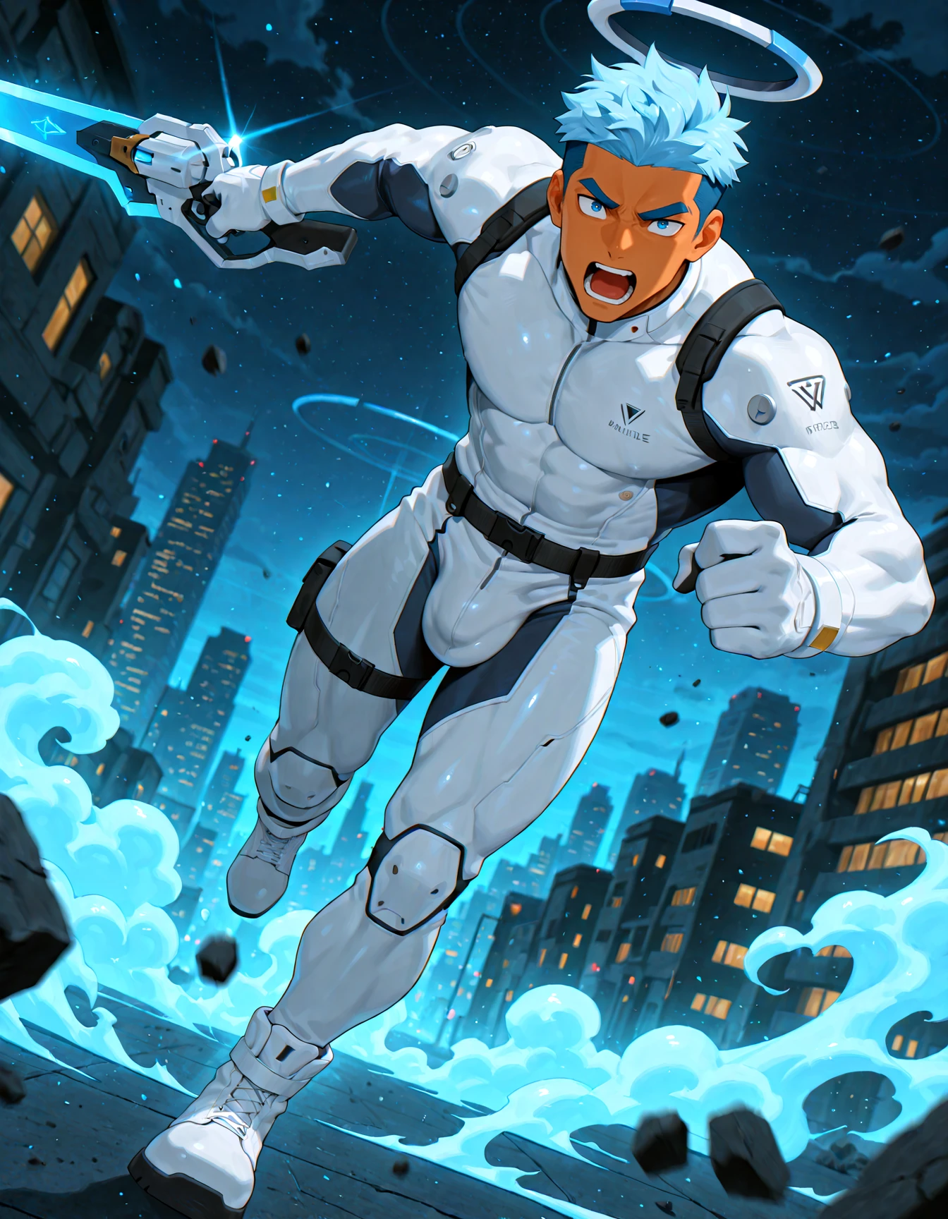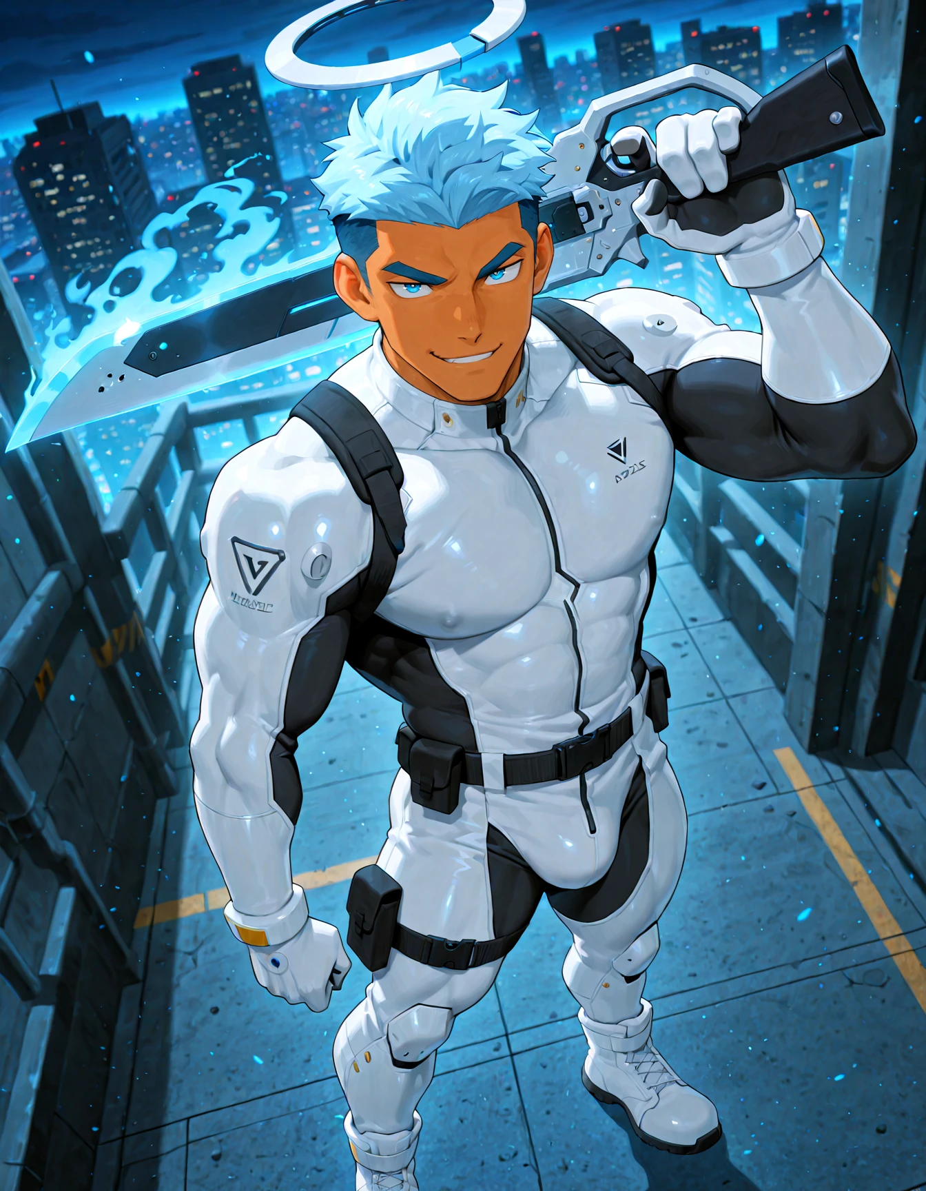 tan skin, halo, blue hair, blue undercut hair, blue eyes, thick blue eyebrows, white combat bodysuit, white combat boots, white gloves, combat beltFor his Gunblade, Hakuba: (results may differ tho)