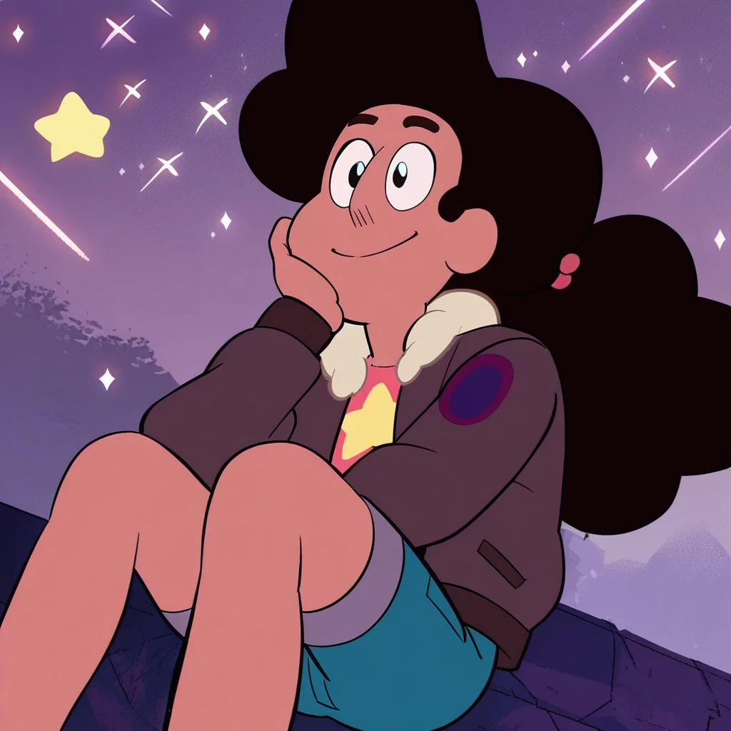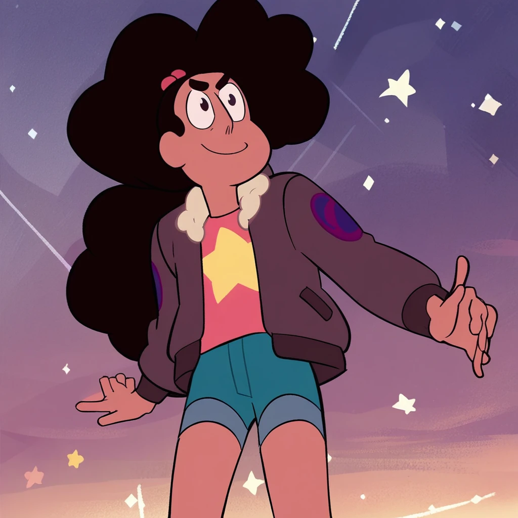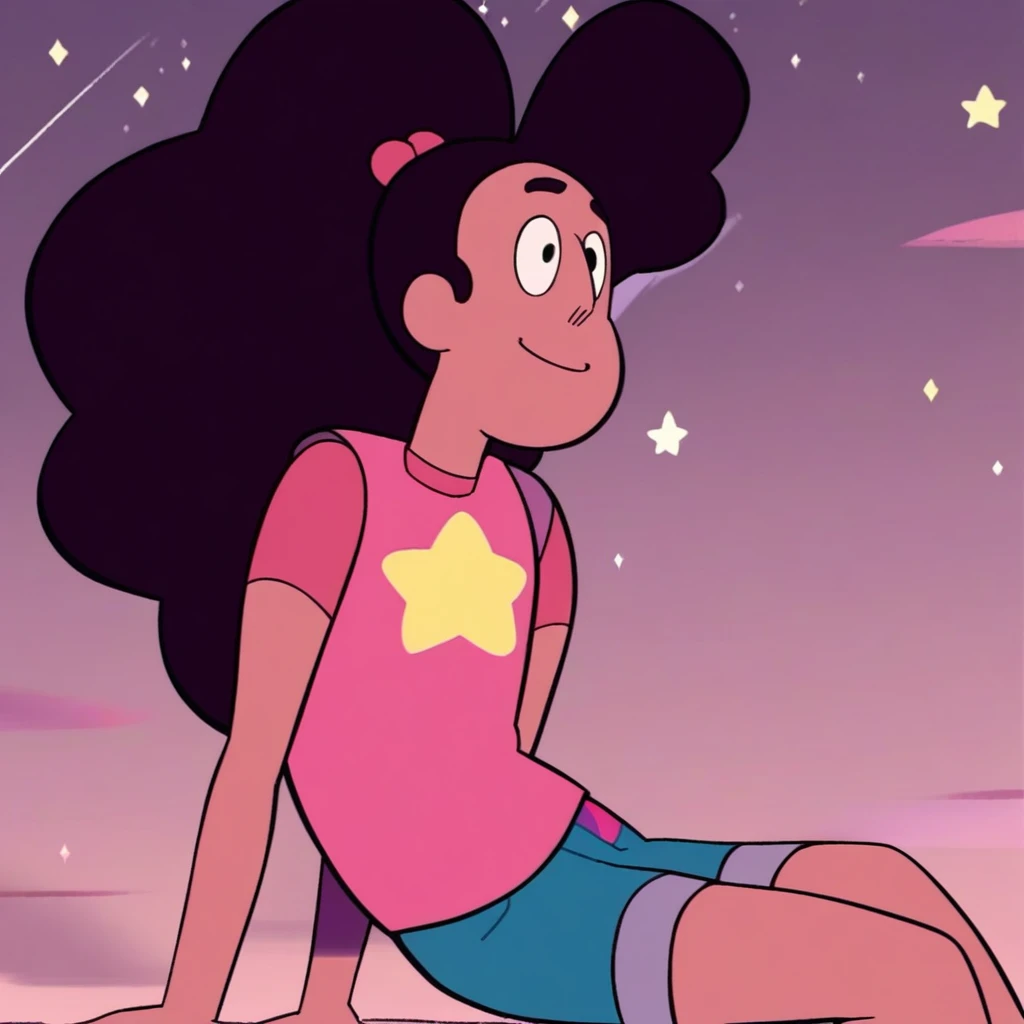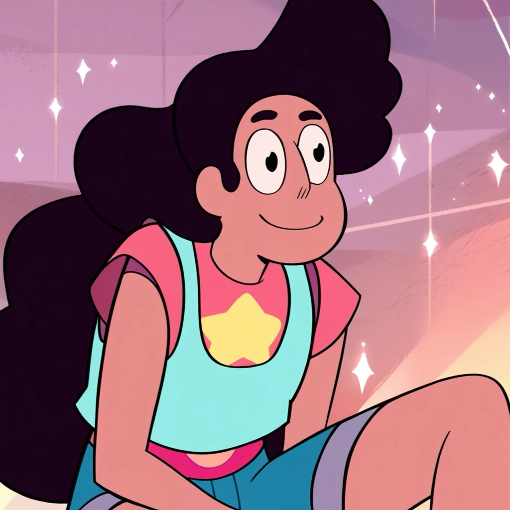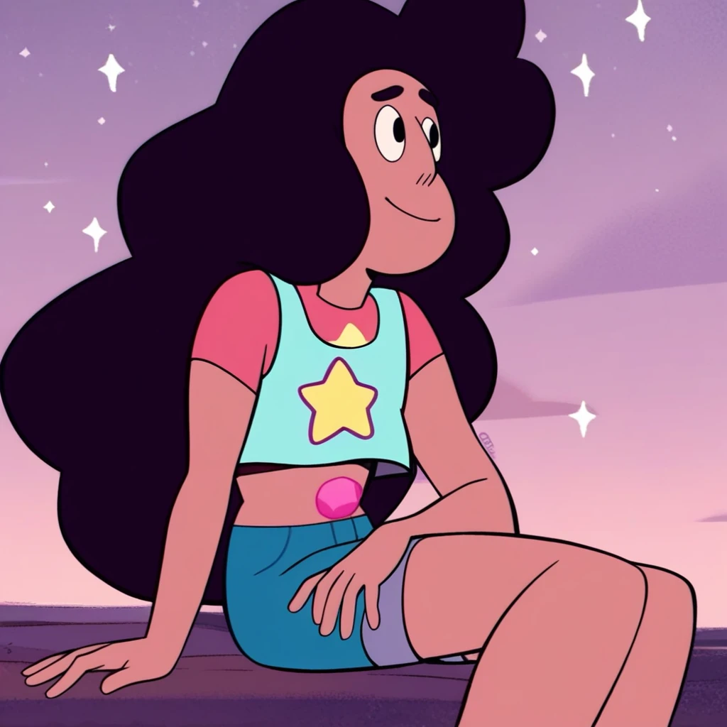 stevonnie, dark skin, dark hair, long hair, puffy hair, shirt, tank-top, midriff, navel gem, shorts, bare legs, barefoot,