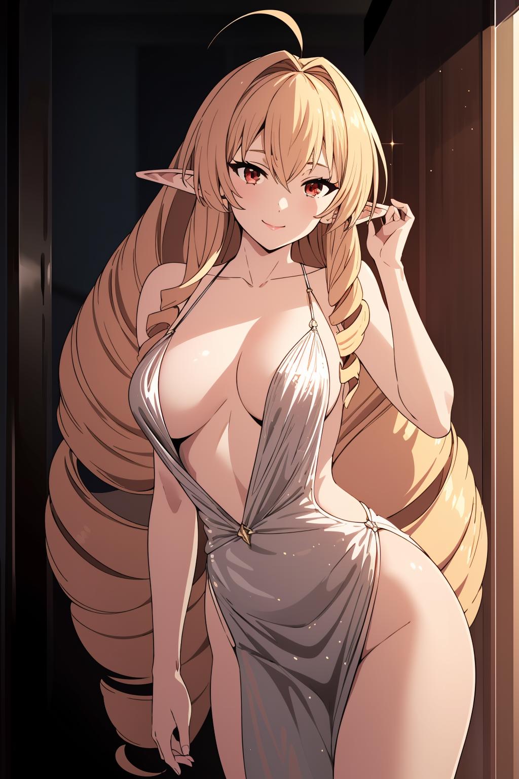 1girl,blonde hair,solo, very long hair,pointy ears,twin drills,red eyes,solo,ahoge,elf,drill hair,hair between eyes,bangs,hair intakes,hair behind ear