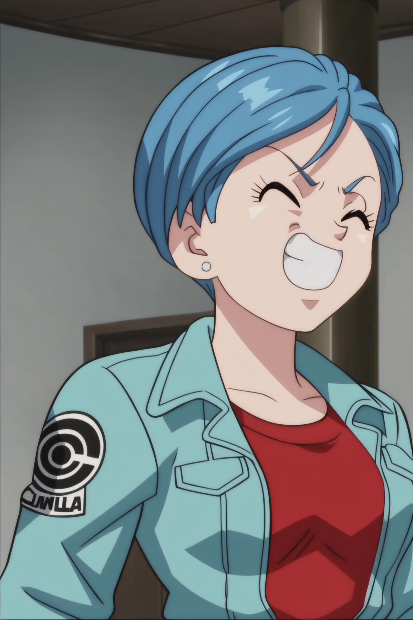 bulma, short hair, blue eyes, blue hair,