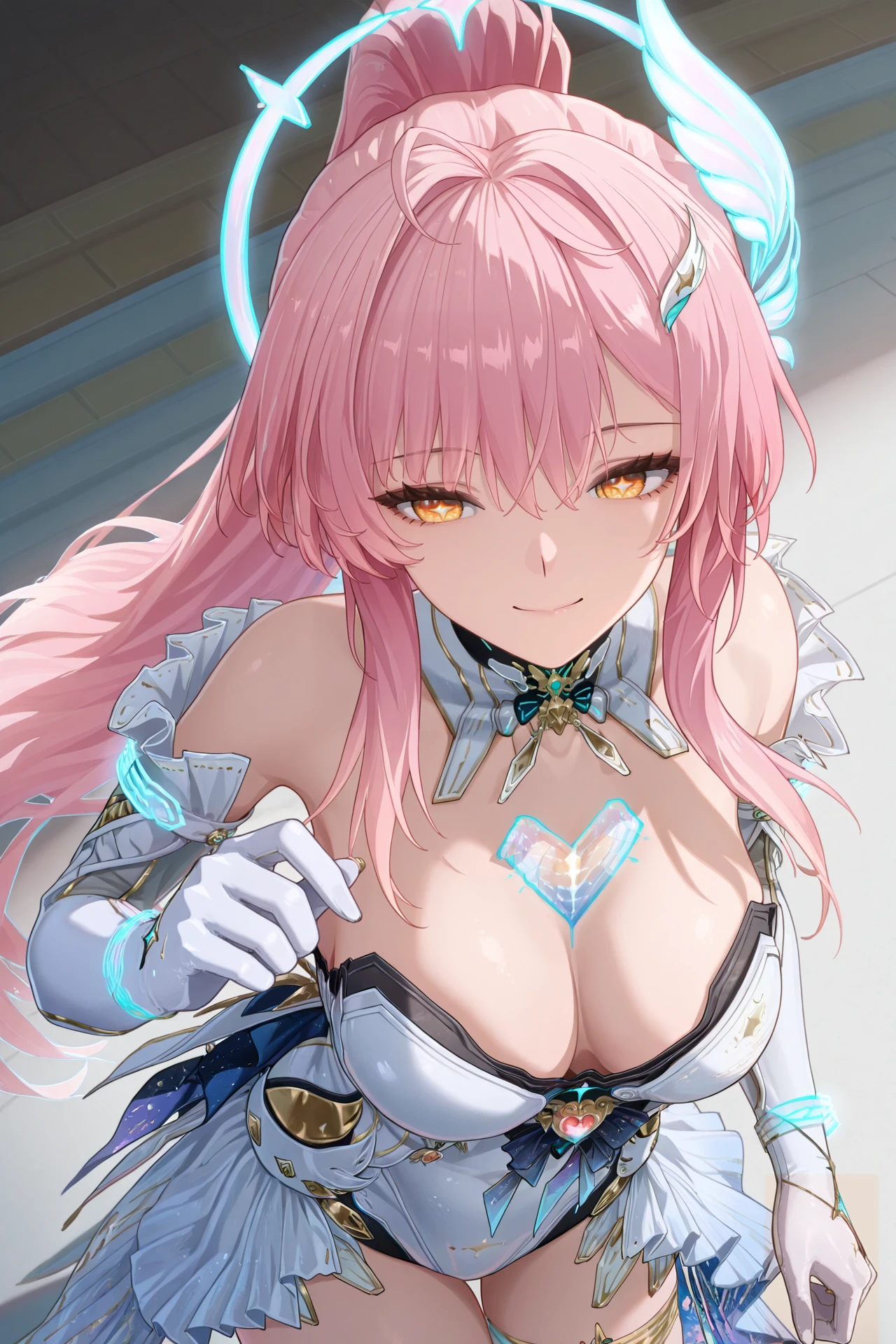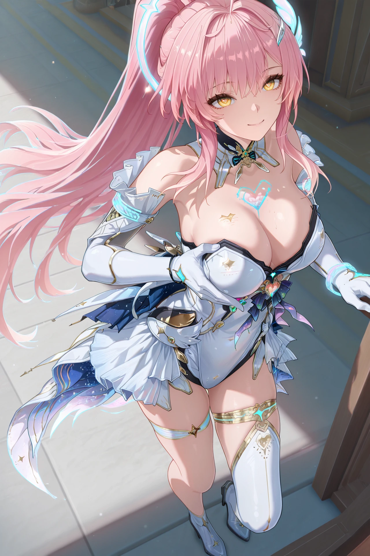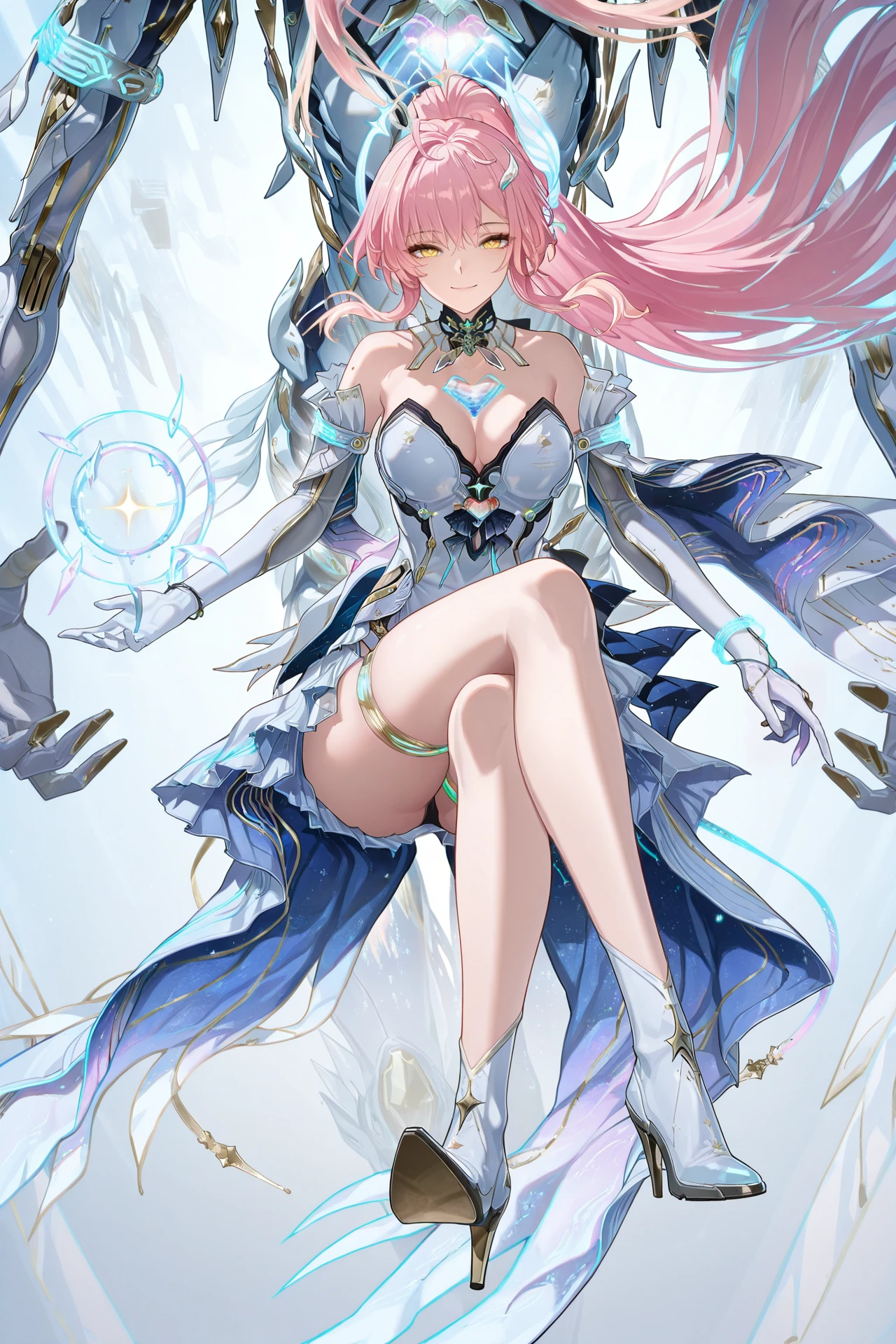 Aemeath (Wuthering Waves), 1girl, , pink hair, solo, gloves, long hair, cleavage, ponytail, smile, dress, uneven thigh highs, high heels