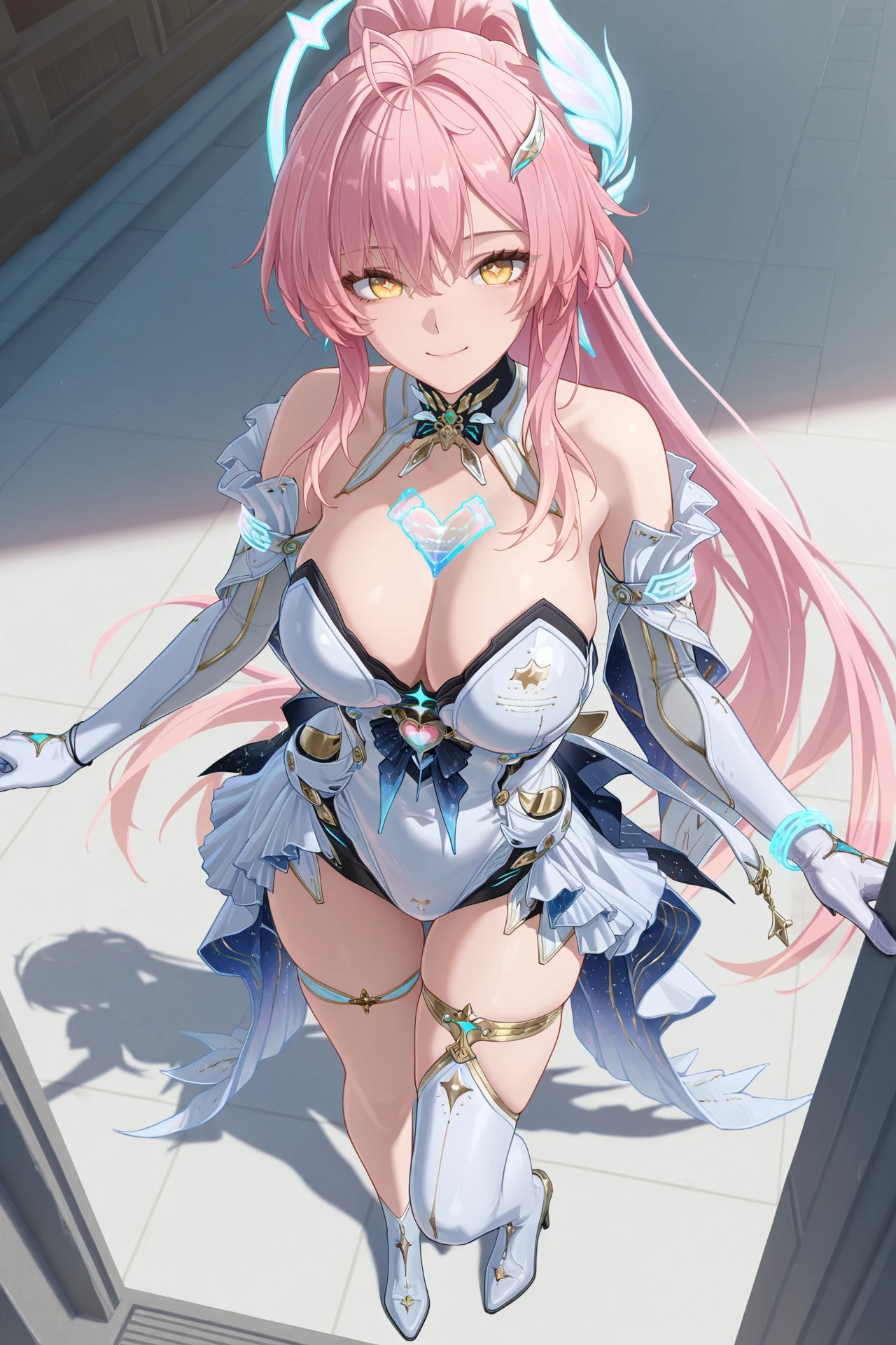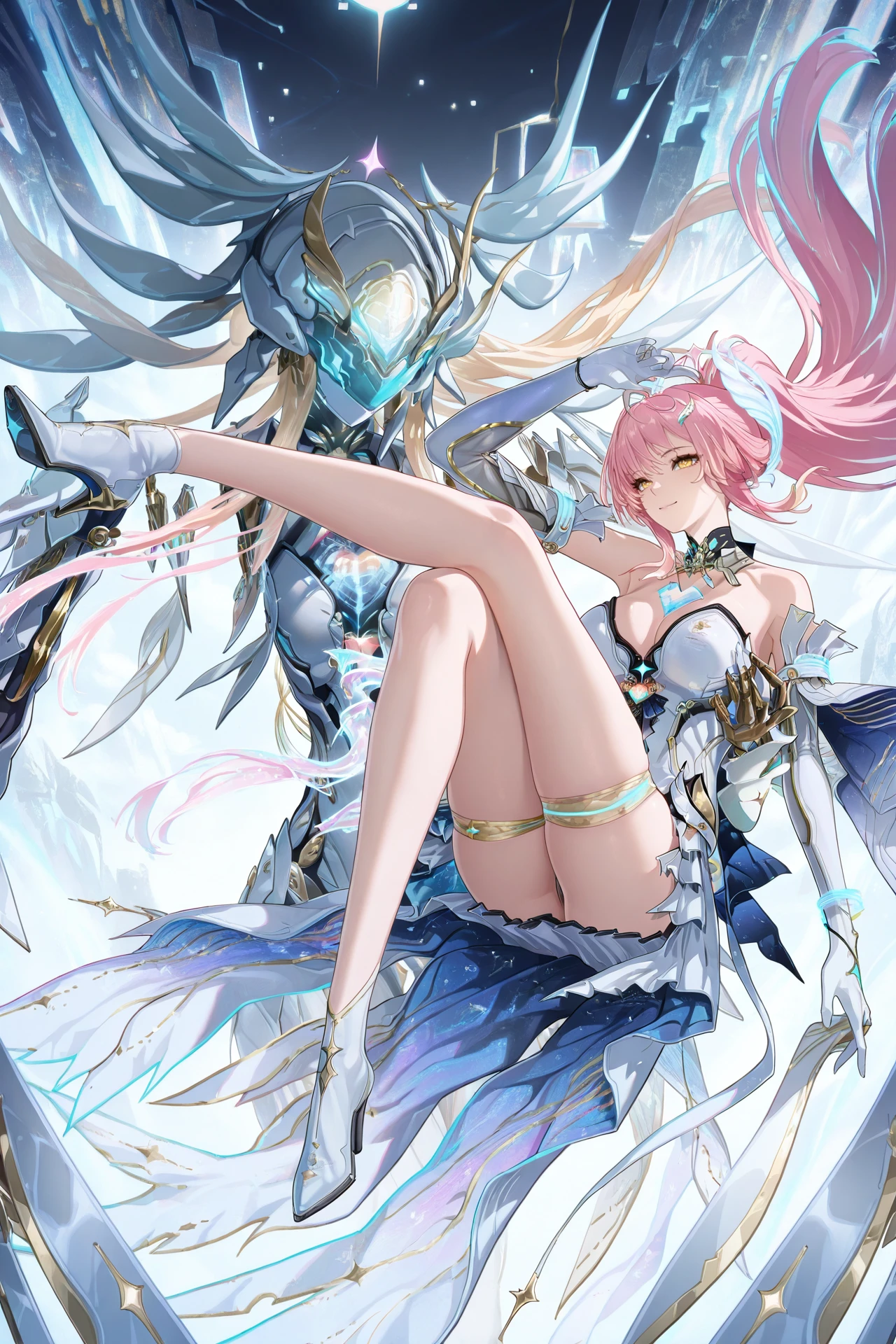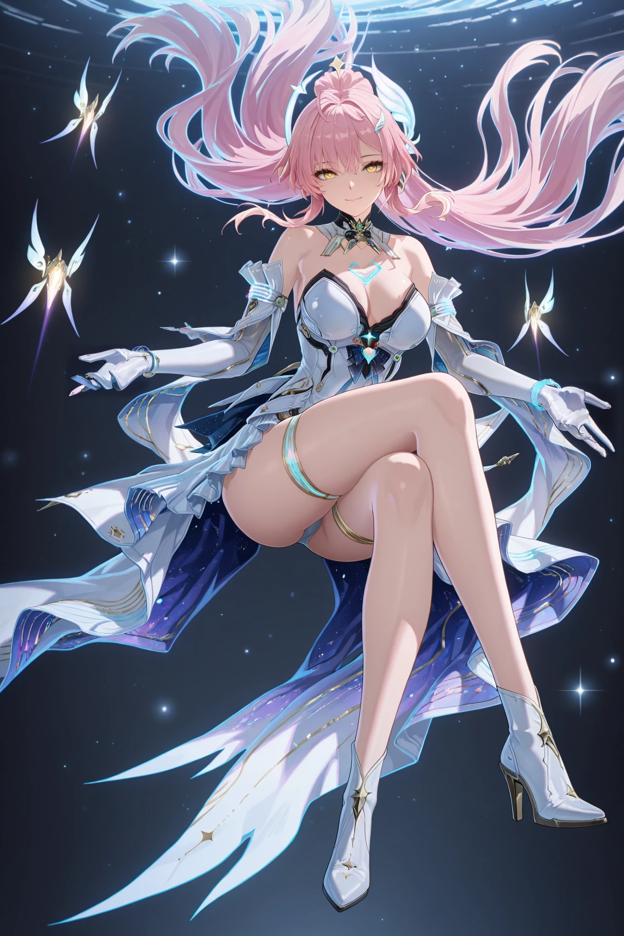 Aemeath (Wuthering Waves), 1girl, , pink hair, solo, gloves, long hair, cleavage, ponytail, smile, dress, uneven thigh highs, high heels