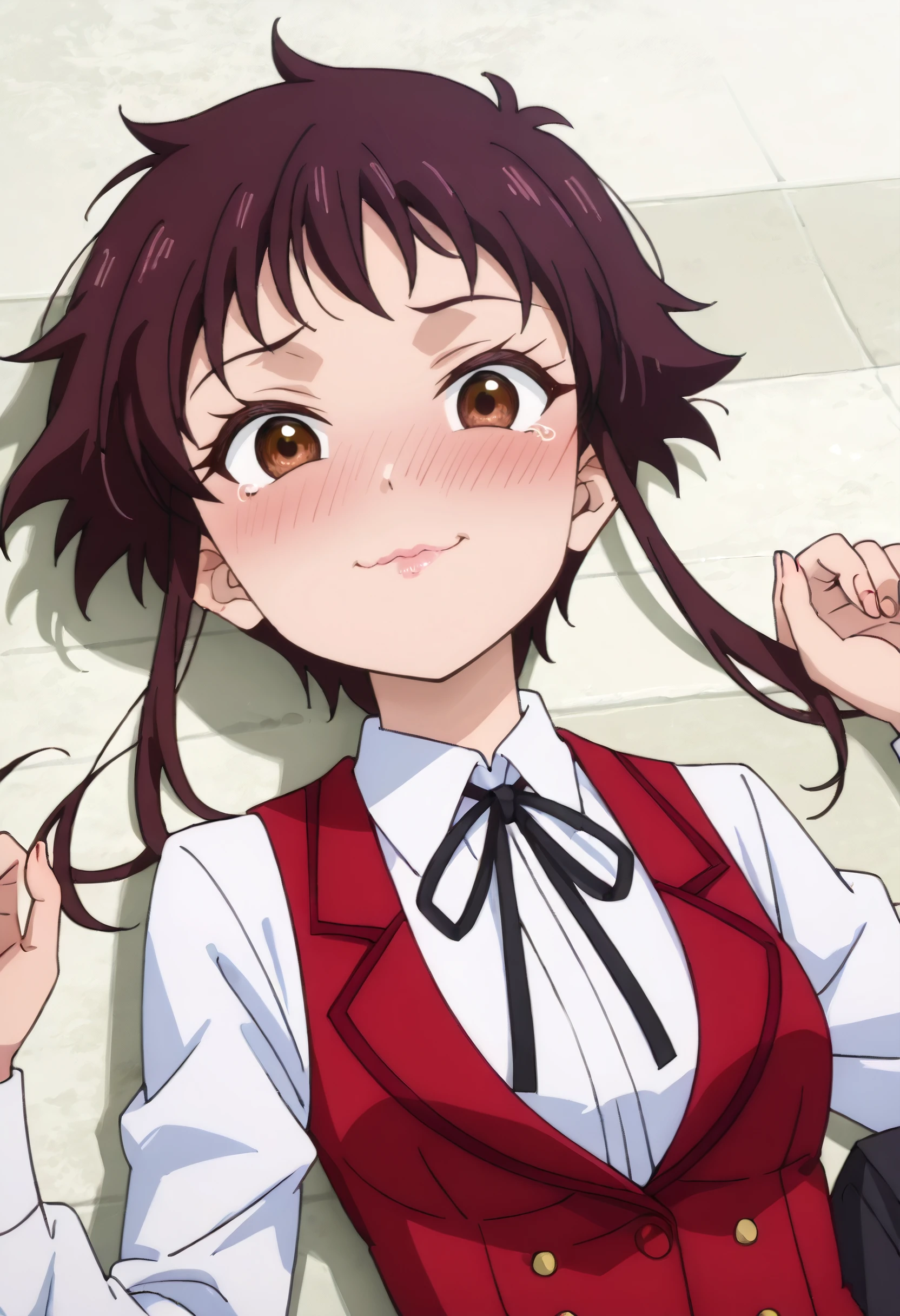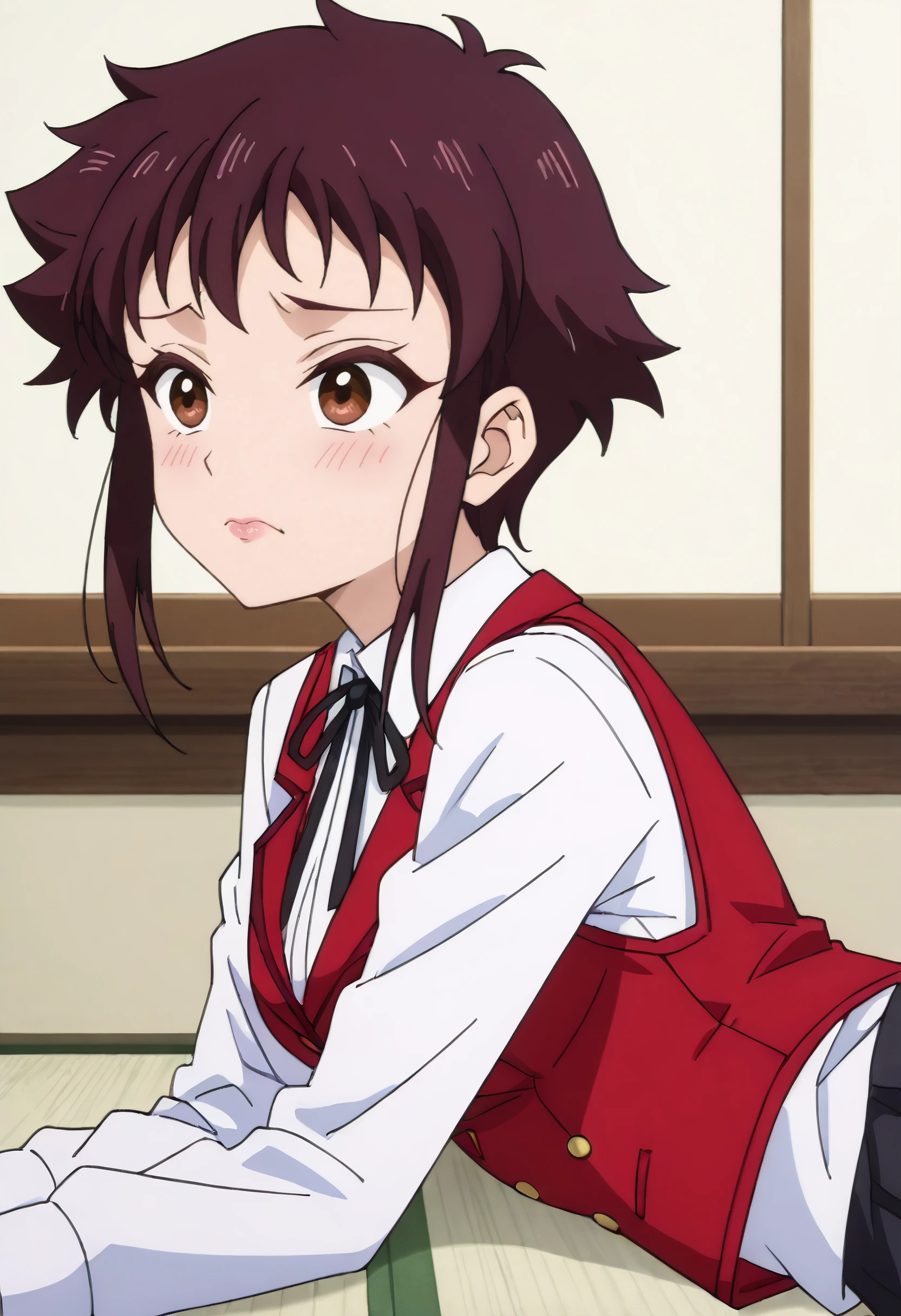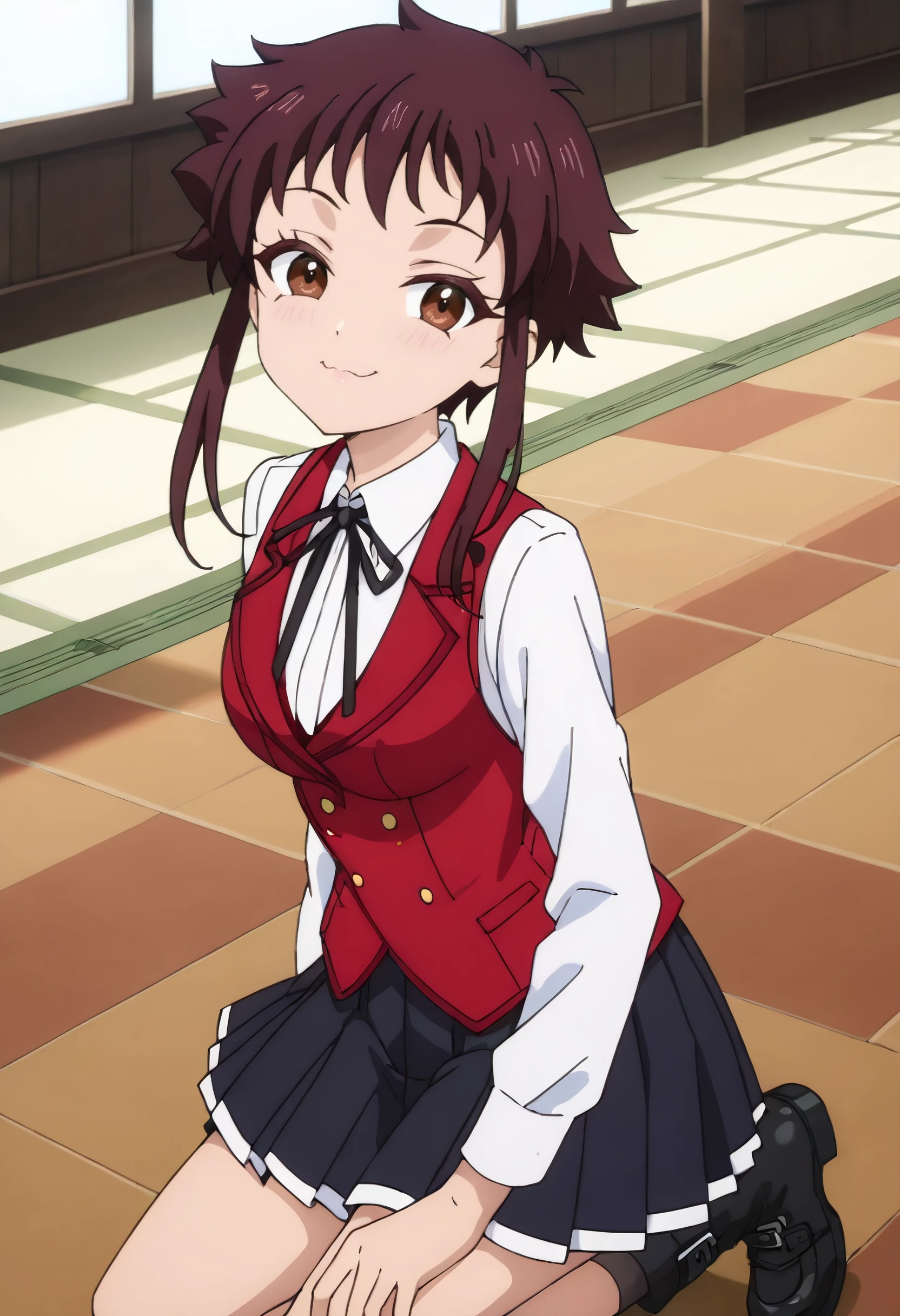 LakisSchoolA, school uniform, vest, white shirt, black ribbon, ribbon, shirt, neck ribbon, red vest, short hair with long locks, long sleeves, skirt, pleated skirt, black skirt, collared shirt, boots, black footwear, miniskirt, dress shirt, wing collar,