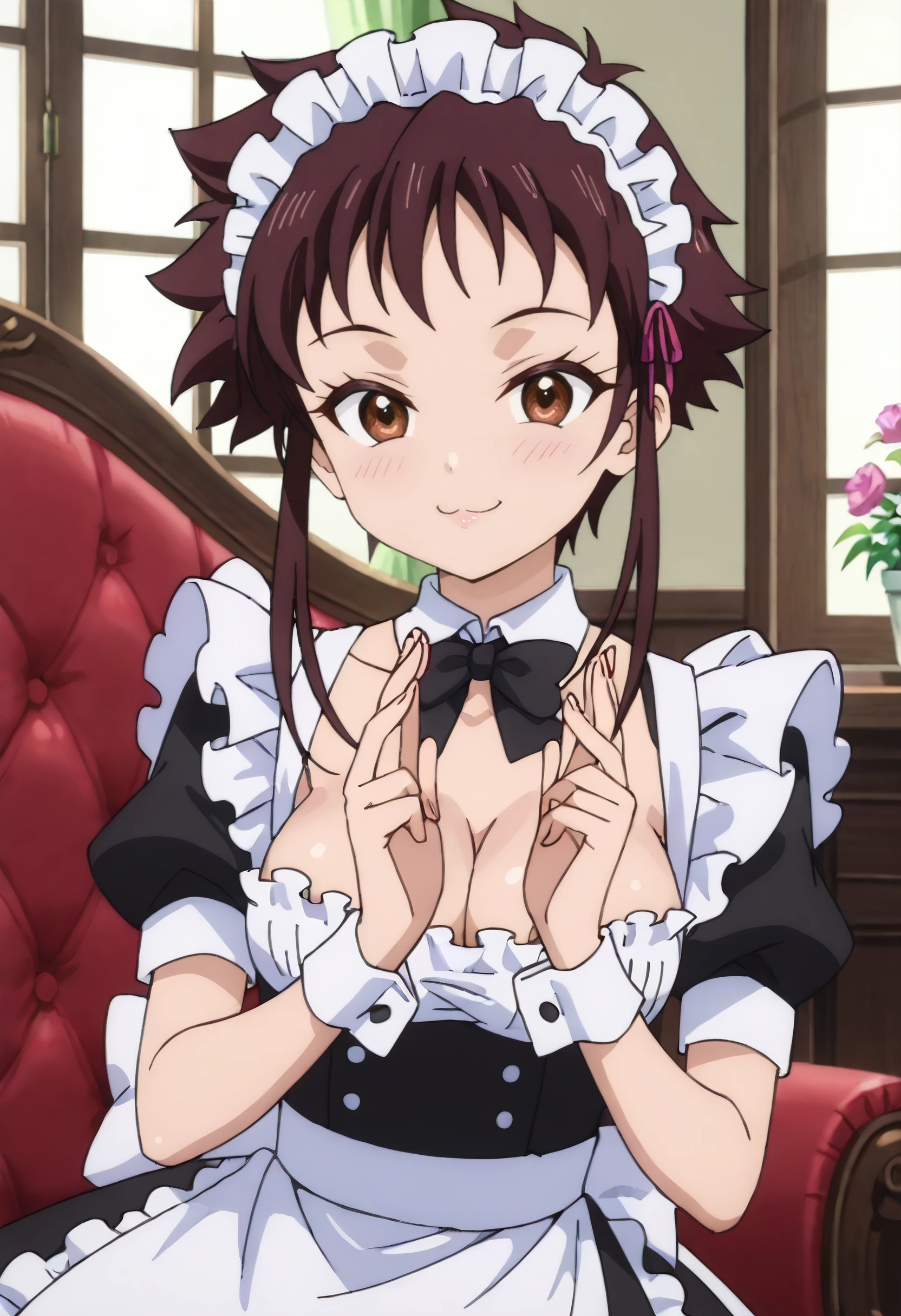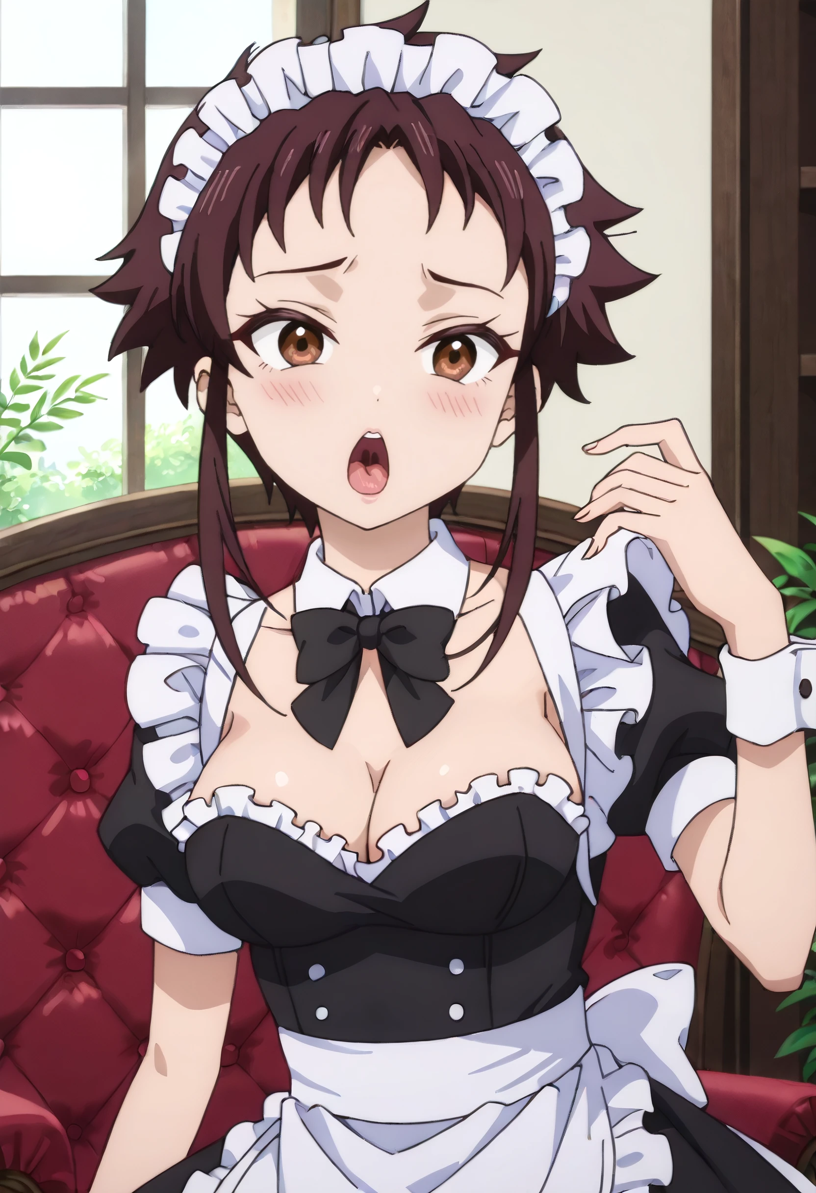 LakisMaid, maid headdress, maid, bow, enmaided, detached collar, black bow, bowtie, black bowtie, apron, maid apron, white apron, cleavage, frills, black dress, frilled apron, dress, wrist cuffs, puffy sleeves, short sleeves, spiked hair, puffy short sleeves, frilled dress, short hair with long locks, white wrist cuffs,