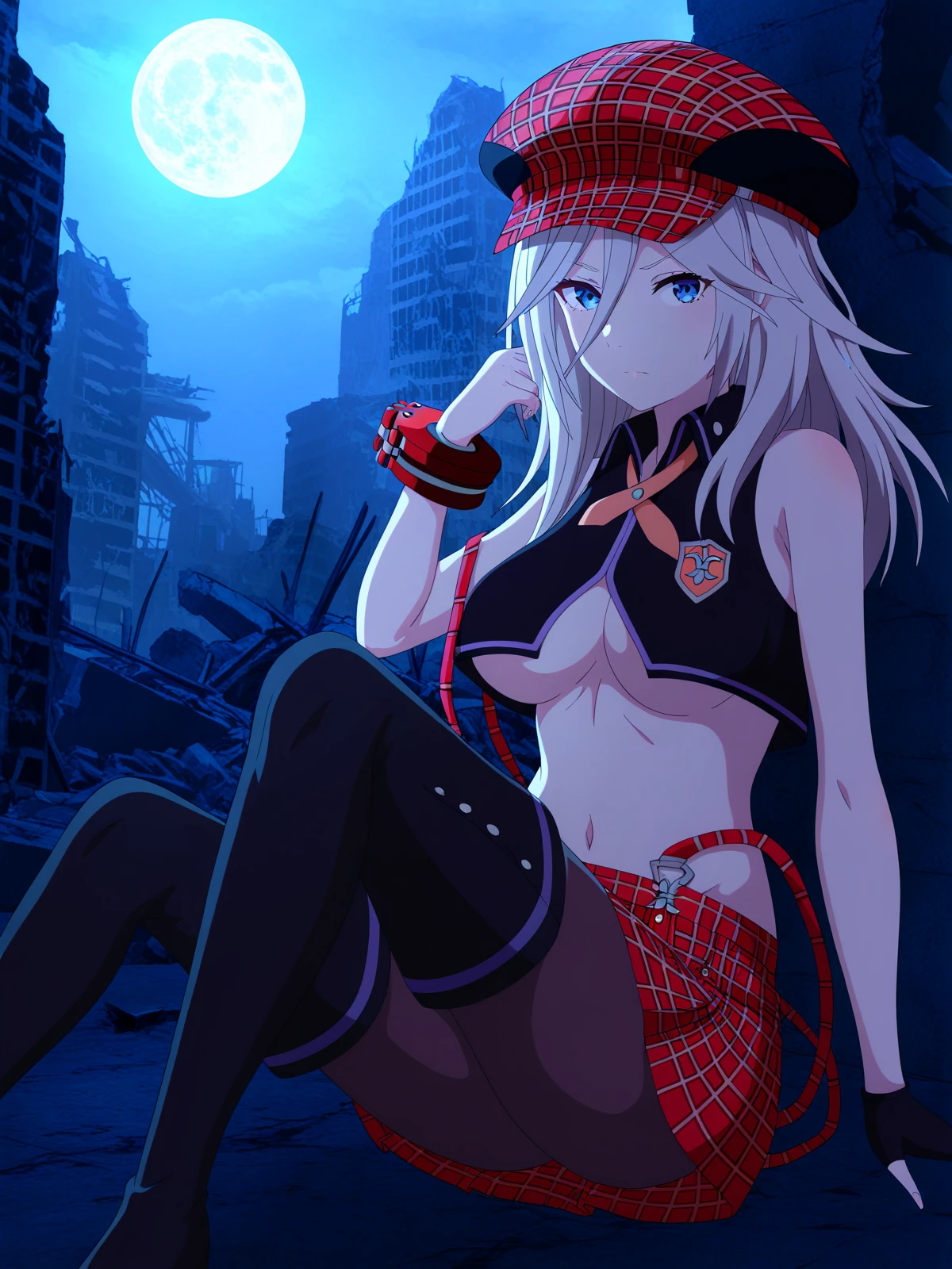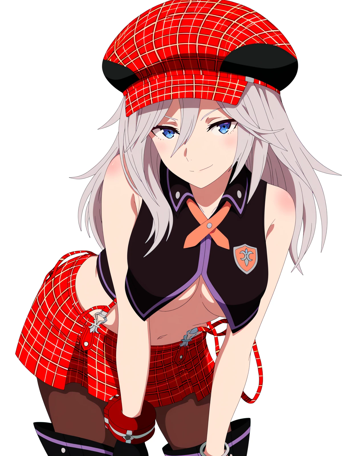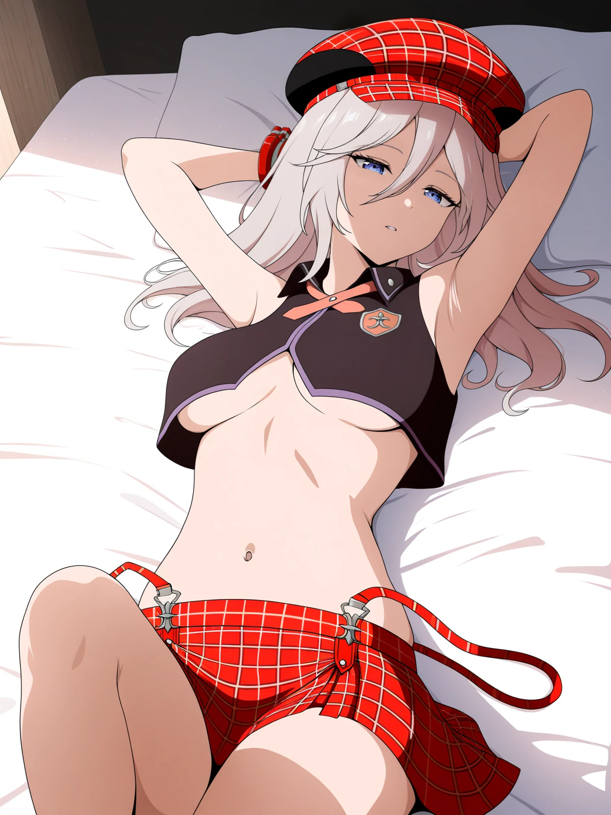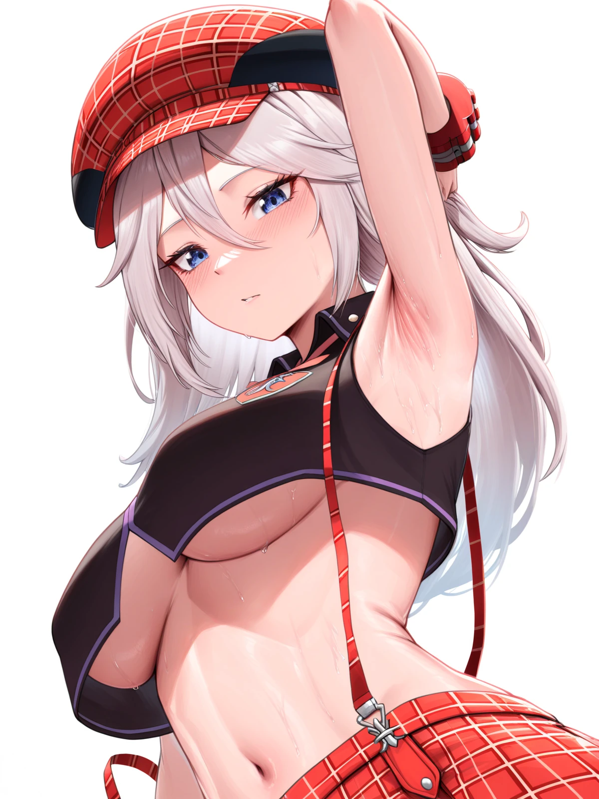 alisa ilinichina amiella, alisa ilinichina amiella \(god eater burst\), grey hair, long hair, blue eyes, plaid headwear, cabbie hat, black crop top, plaid skirt, suspender skirt, suspenders slip, midriff, underboob, bracelet, emblem, medium breastsCheck out my HuggingFace profile at http://huggingface.co/Doctor-Shotgun for a variety of image generation and LLM content!