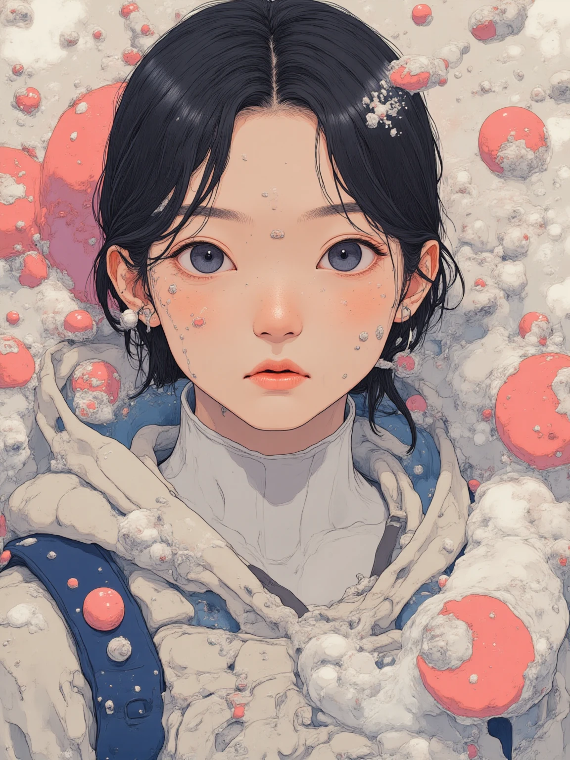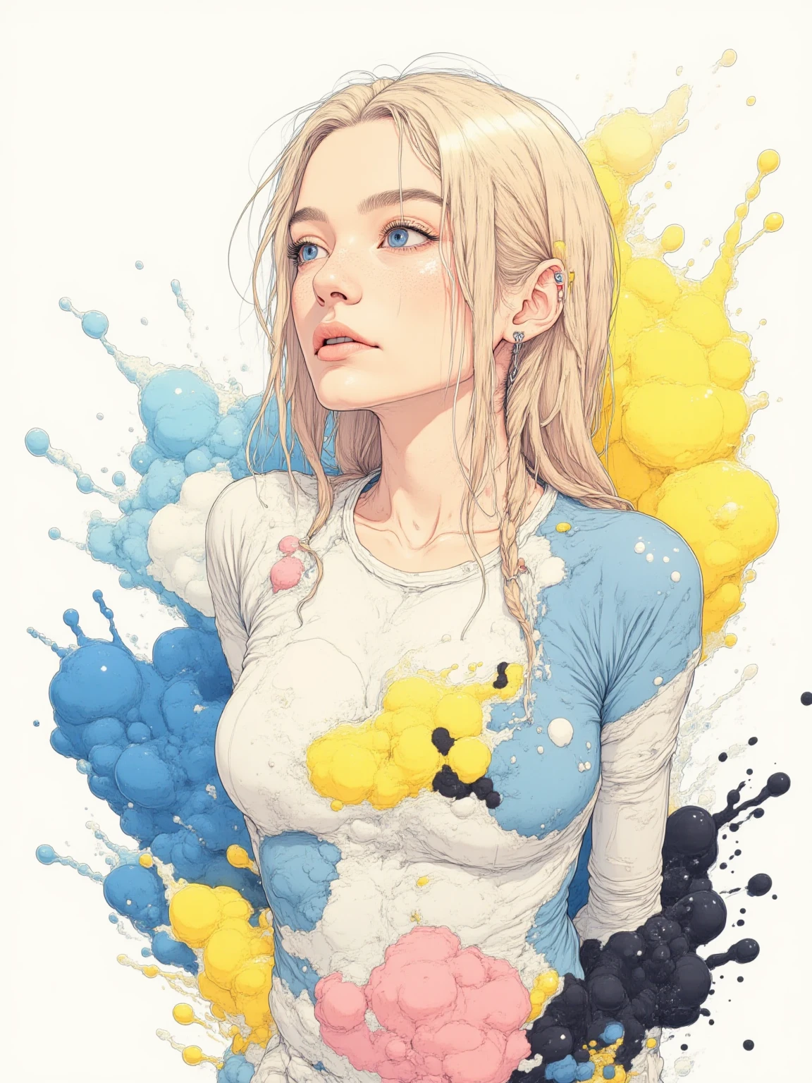 A close-up portrait of a woman with vibrant purple hair, blending the bold, graphic style of Andy Warhol's pop art with Richard Avedon's high-contrast minimalist photography. Her sharply detailed face features striking, defined lines and a piercing gaze, exuding confidence and charisma. The composition emphasizes vivid colors, with her purple hair contrasting against a bright, monochromatic background. The lighting highlights every detail of her expression, capturing an iconic fusion of classic pop art and contemporary culture, evoking a timeless yet modern aesthetic.