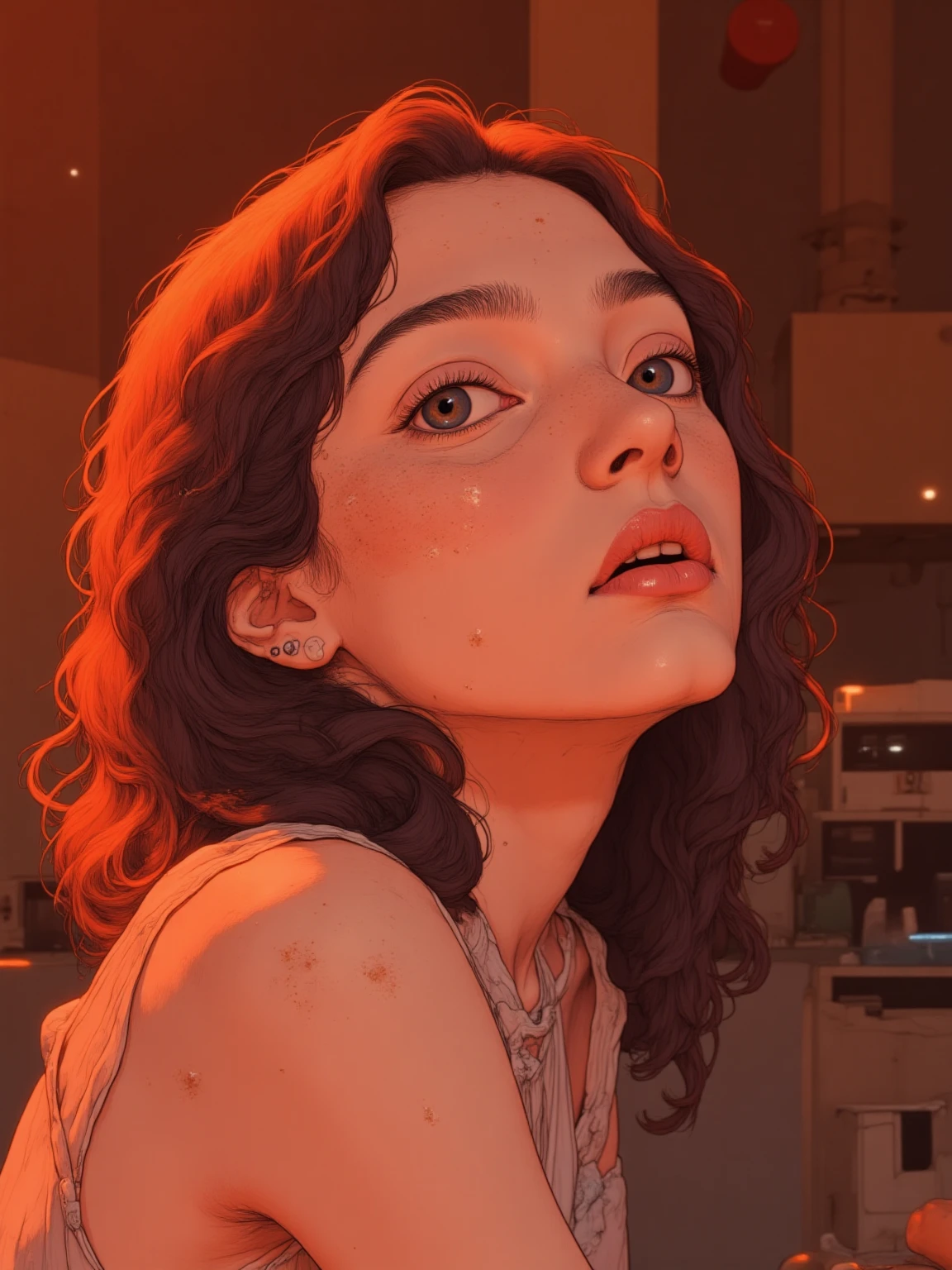 Design a photorealistic portrait of a woman with dark makeup and makeup art, set in a dark concept art style. Cowboy Shot, She is a gothic maiden shaman, blending dark fantasy with realism to create a hyperdetailed fantasy character. The portrait captures a cyberpunk angry gorgeous druid, with a fantasy concept art style. It depicts a female necromancer, influenced by Stefan Gesell's work, in a cyberpunk horror style. The dark fantasy character design should be in 4K concept art and hyper realism. Use detailed and vague sentences to emphasize the FLUX on her breasts, ensuring they are the central focus with intricate details and shadows