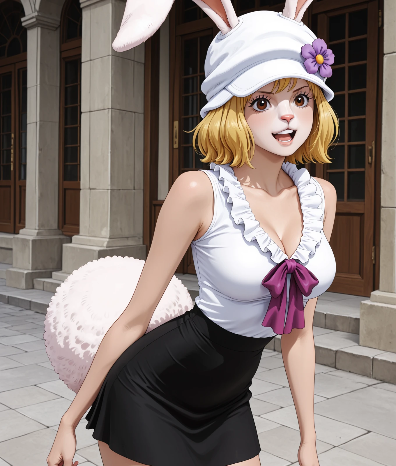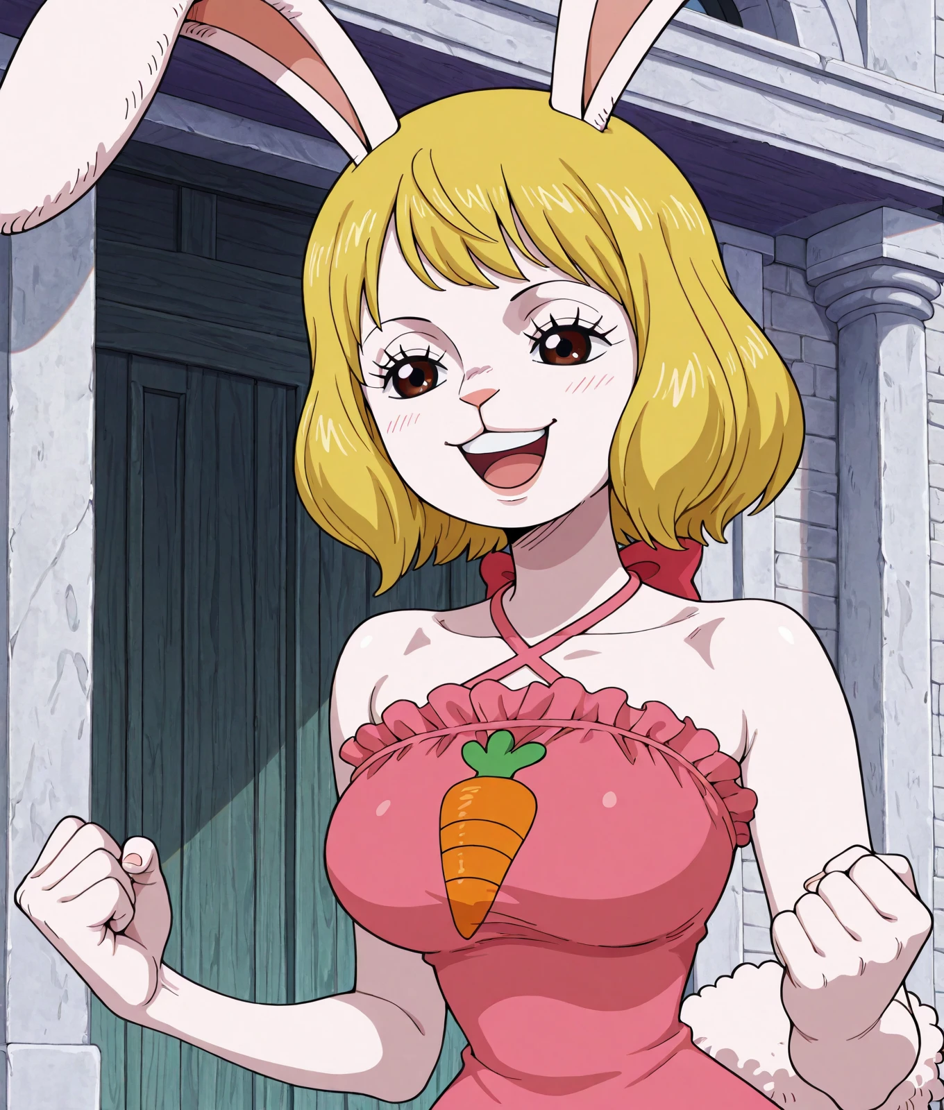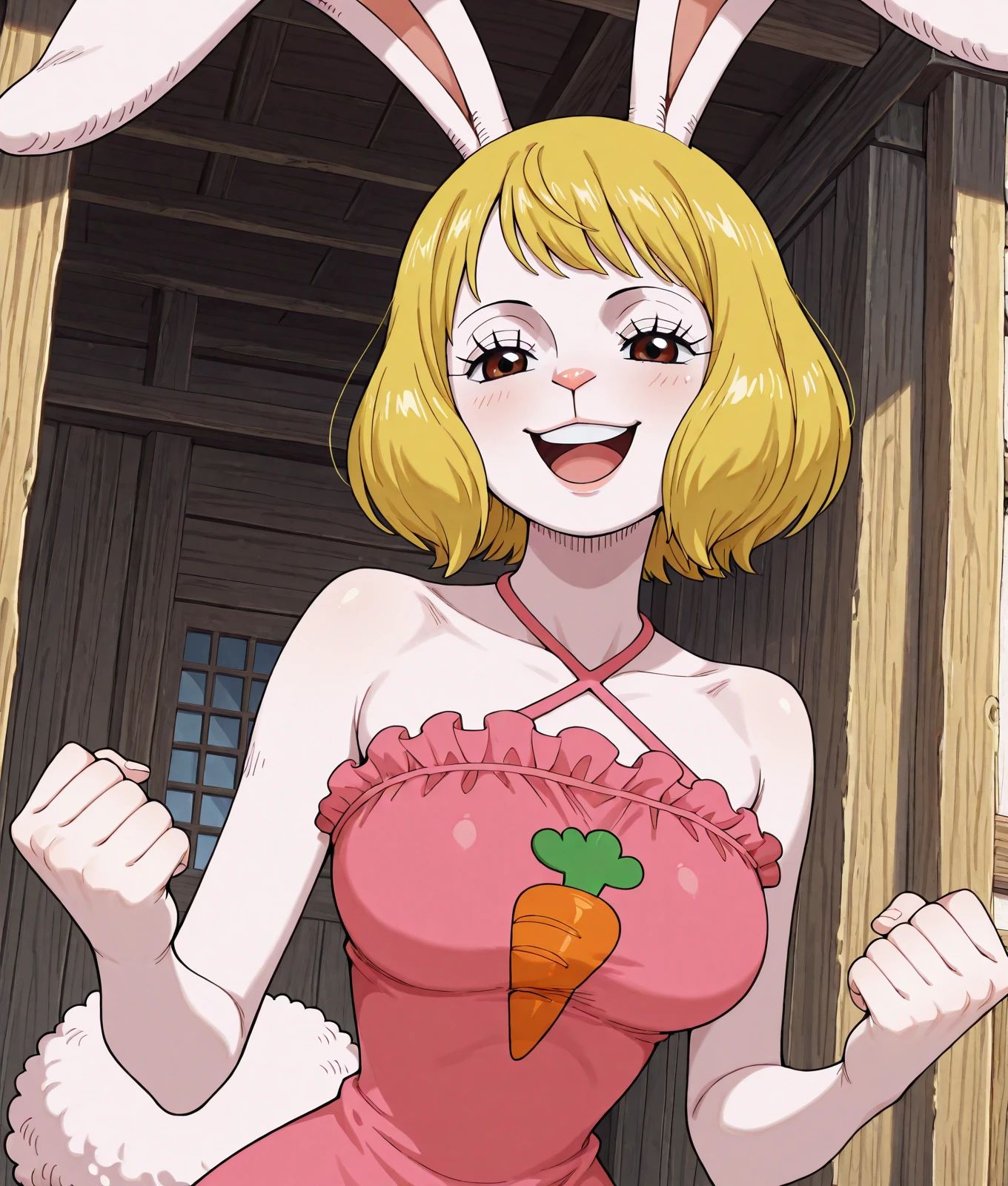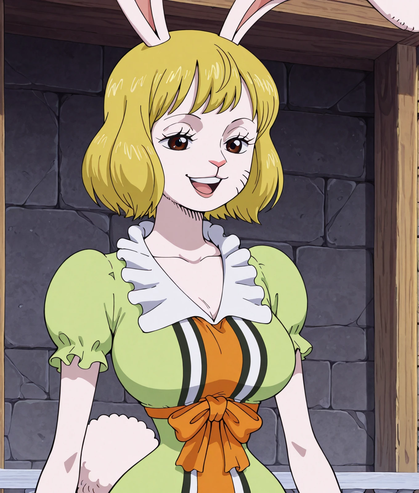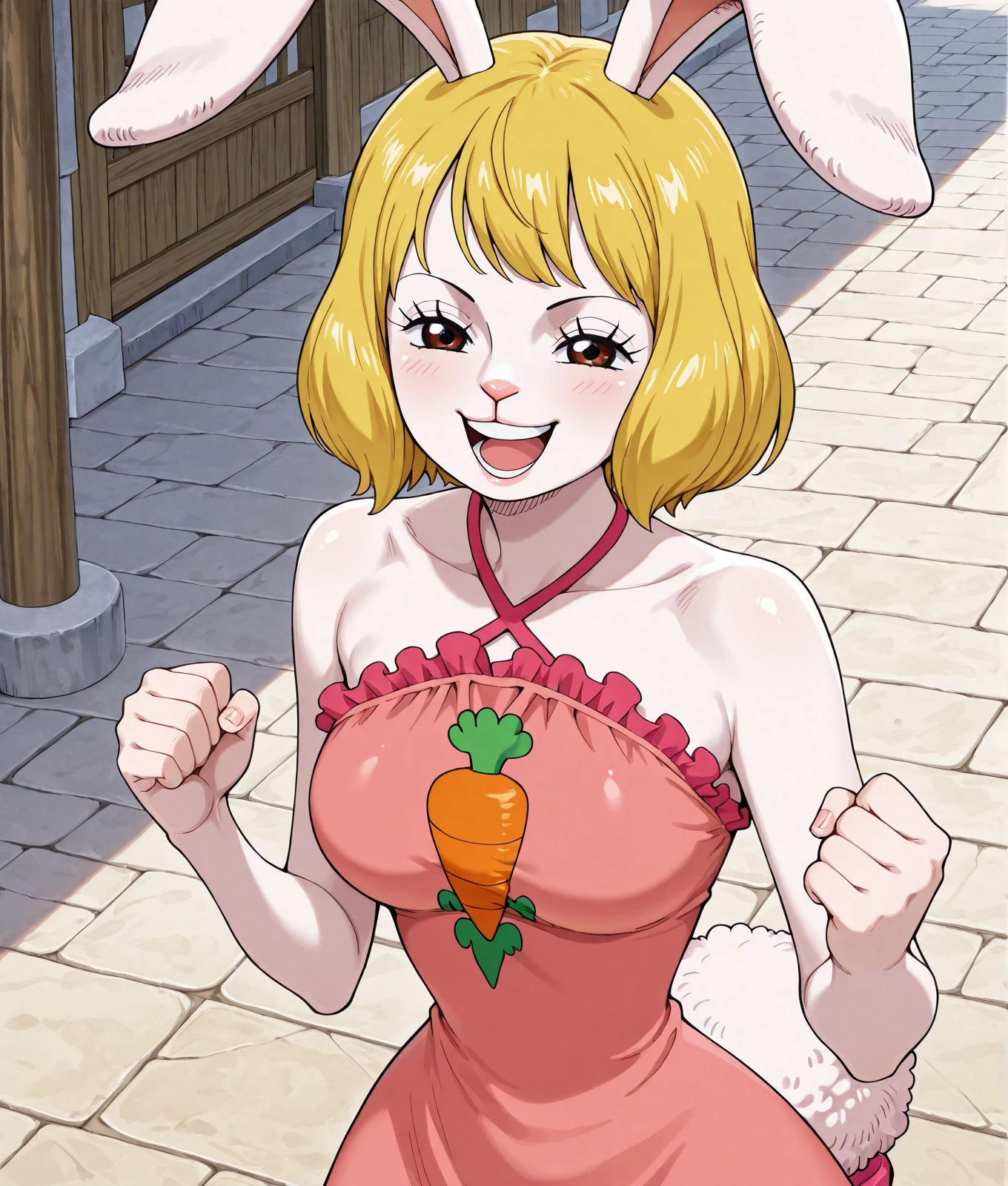 carrot (one piece), blonde hair, white fur, medium hair, flat color, rabbit girl, rabbit ears, toon (style), 1girl, brown eyes, rabbit tail, large tail,