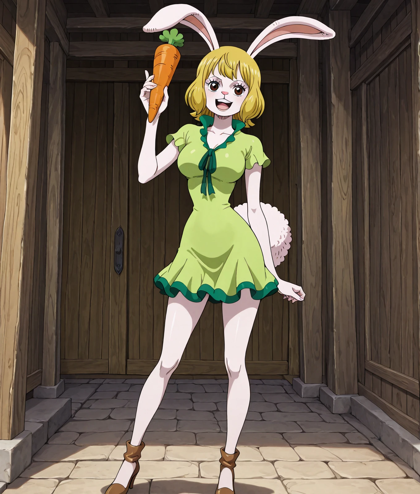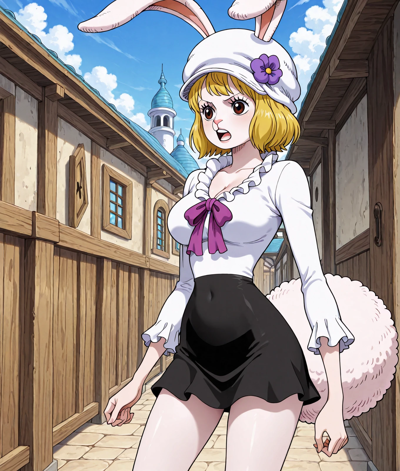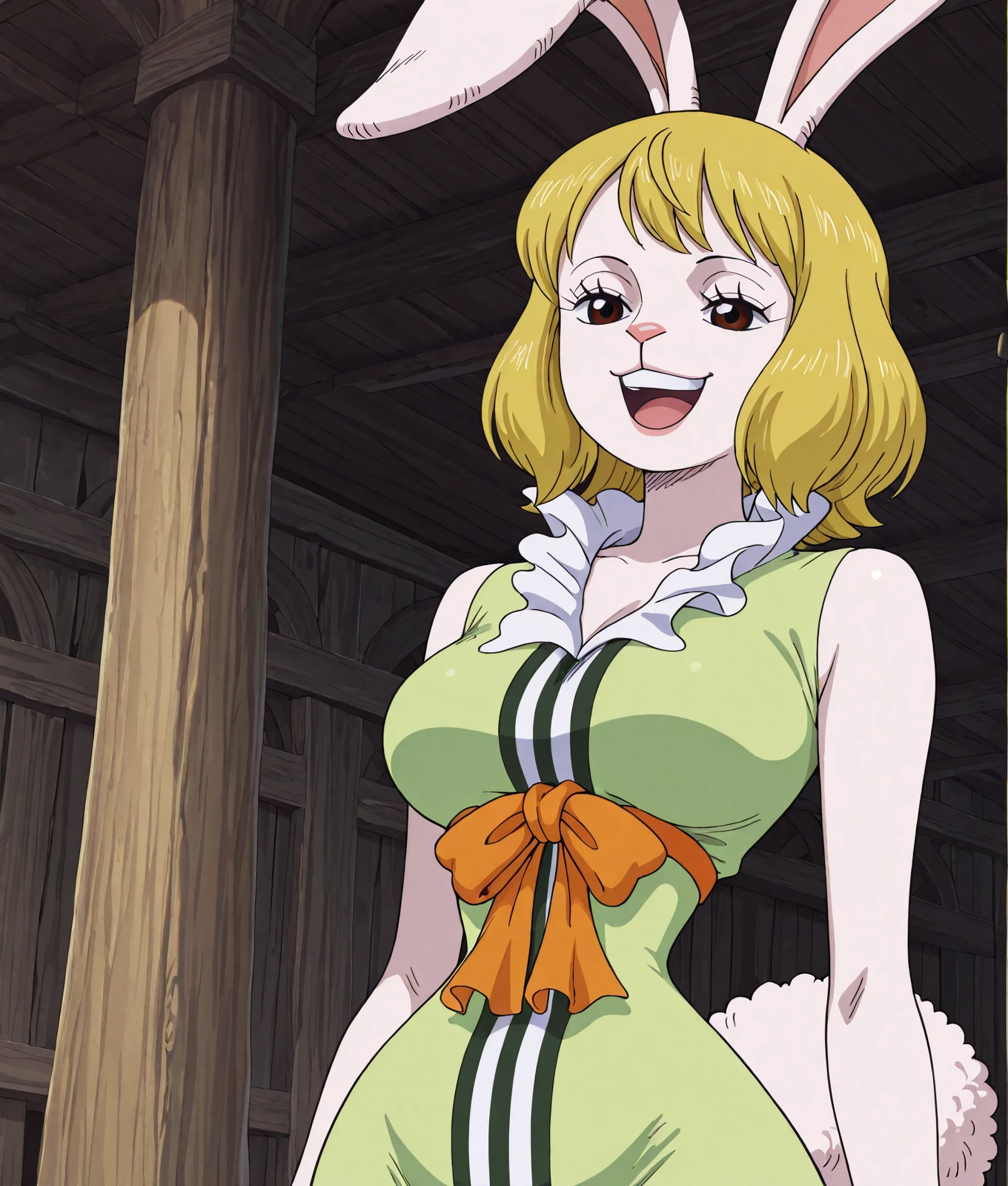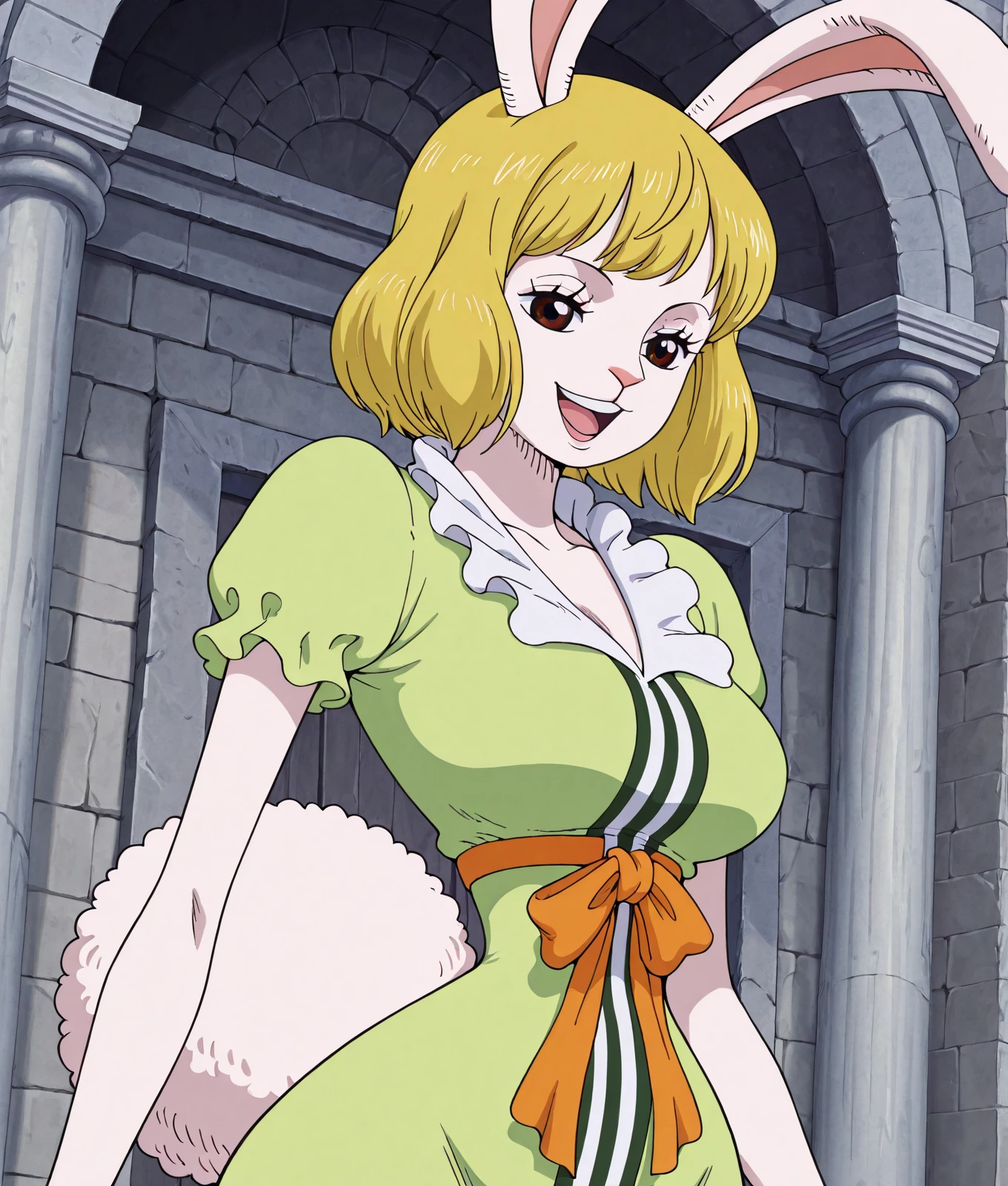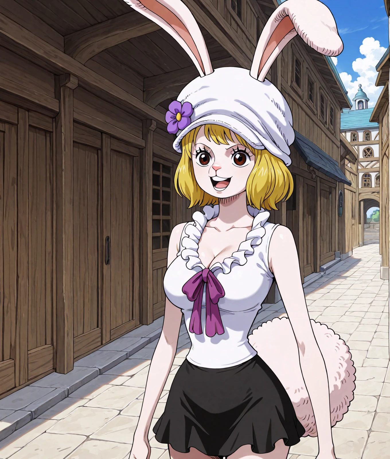 carrot (one piece), blonde hair, white fur, medium hair, flat color, rabbit girl, rabbit ears, toon (style), 1girl, brown eyes, rabbit tail, large tail,