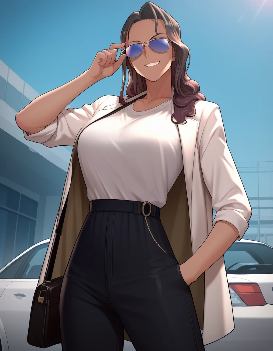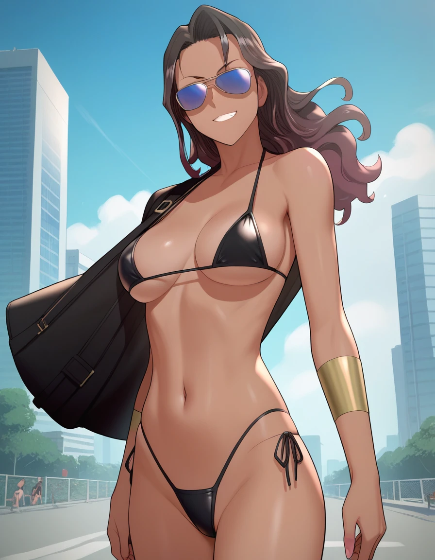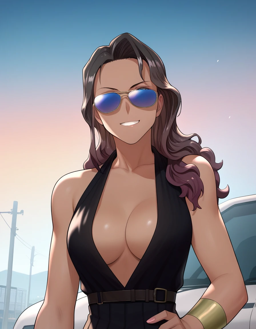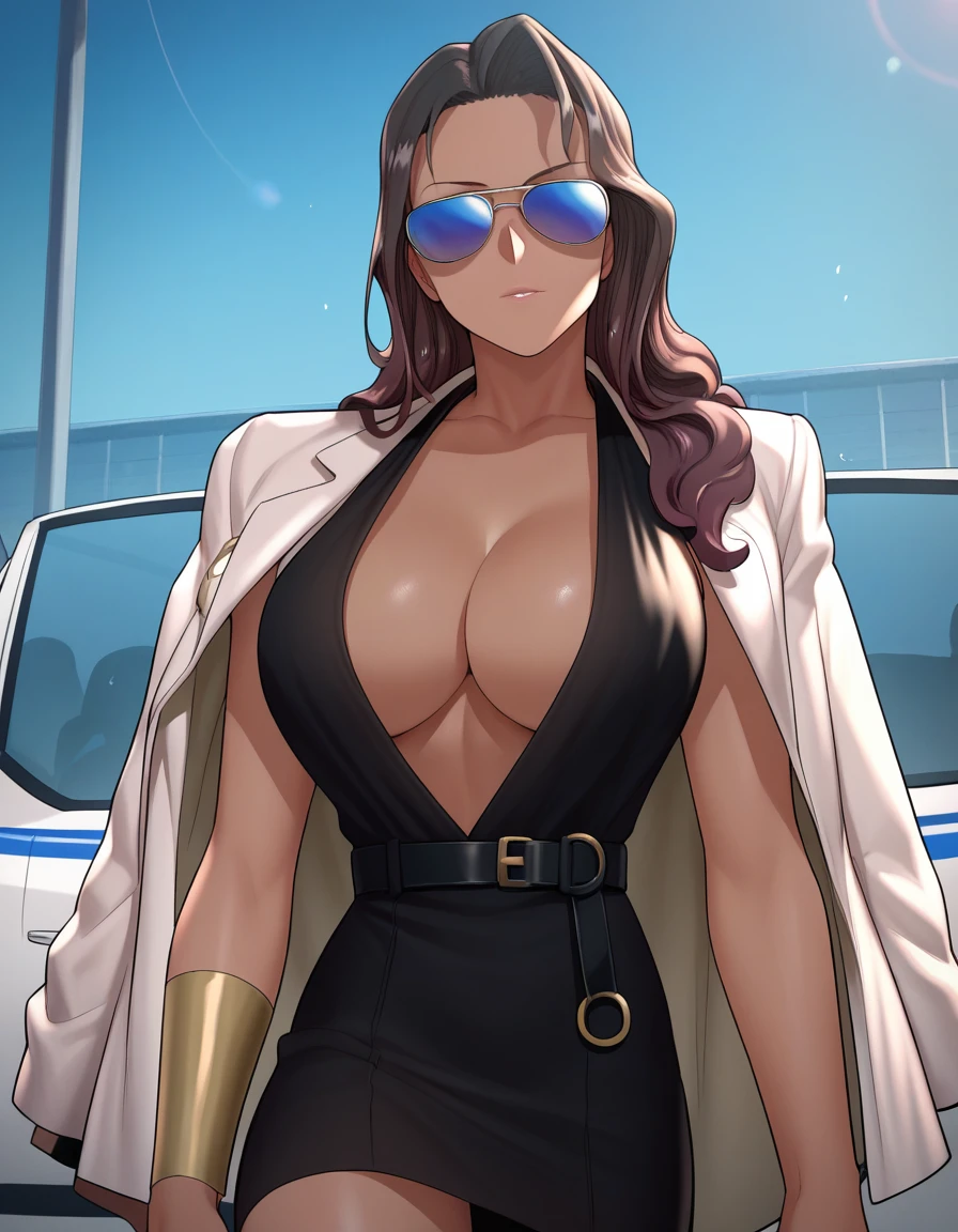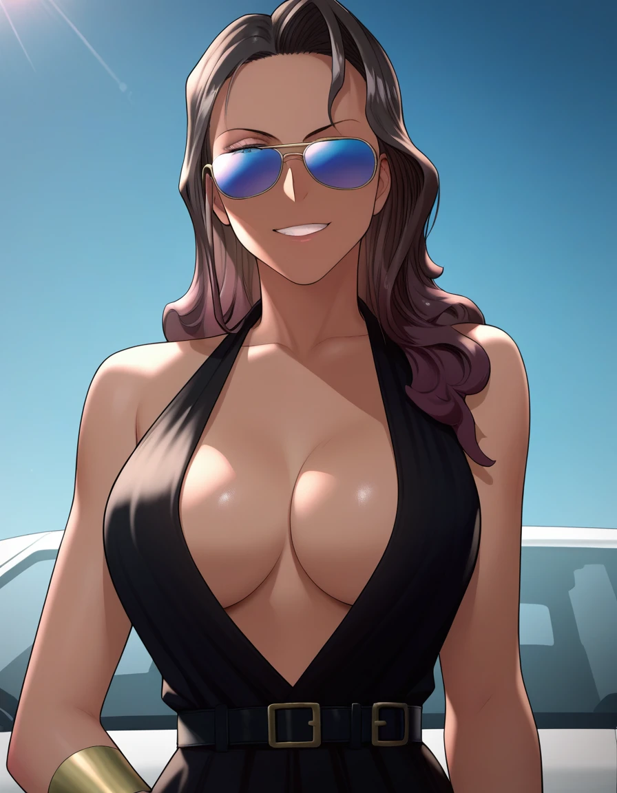 Outfit: black short sleeveless dress, plunging neckline, belt, sunglasses, bracelet