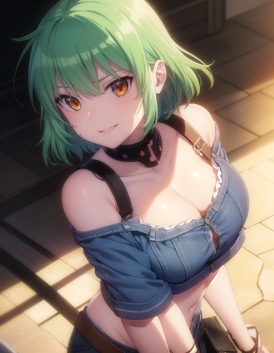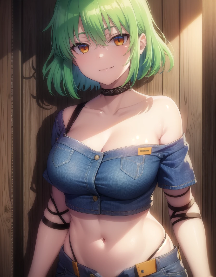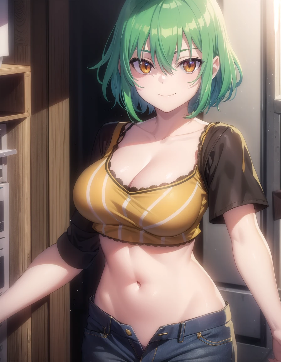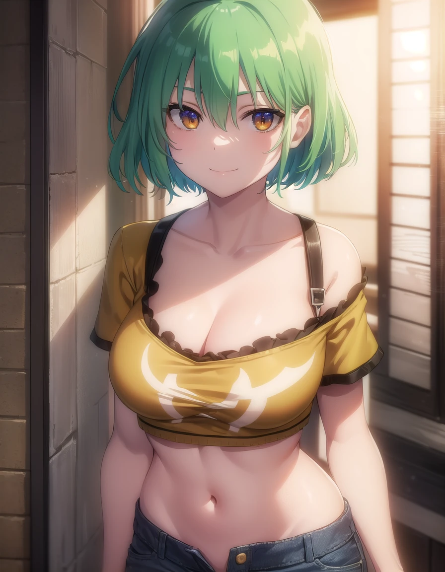 hikage, short hair, (yellow eyes:1.3), slit pupils, green hair,