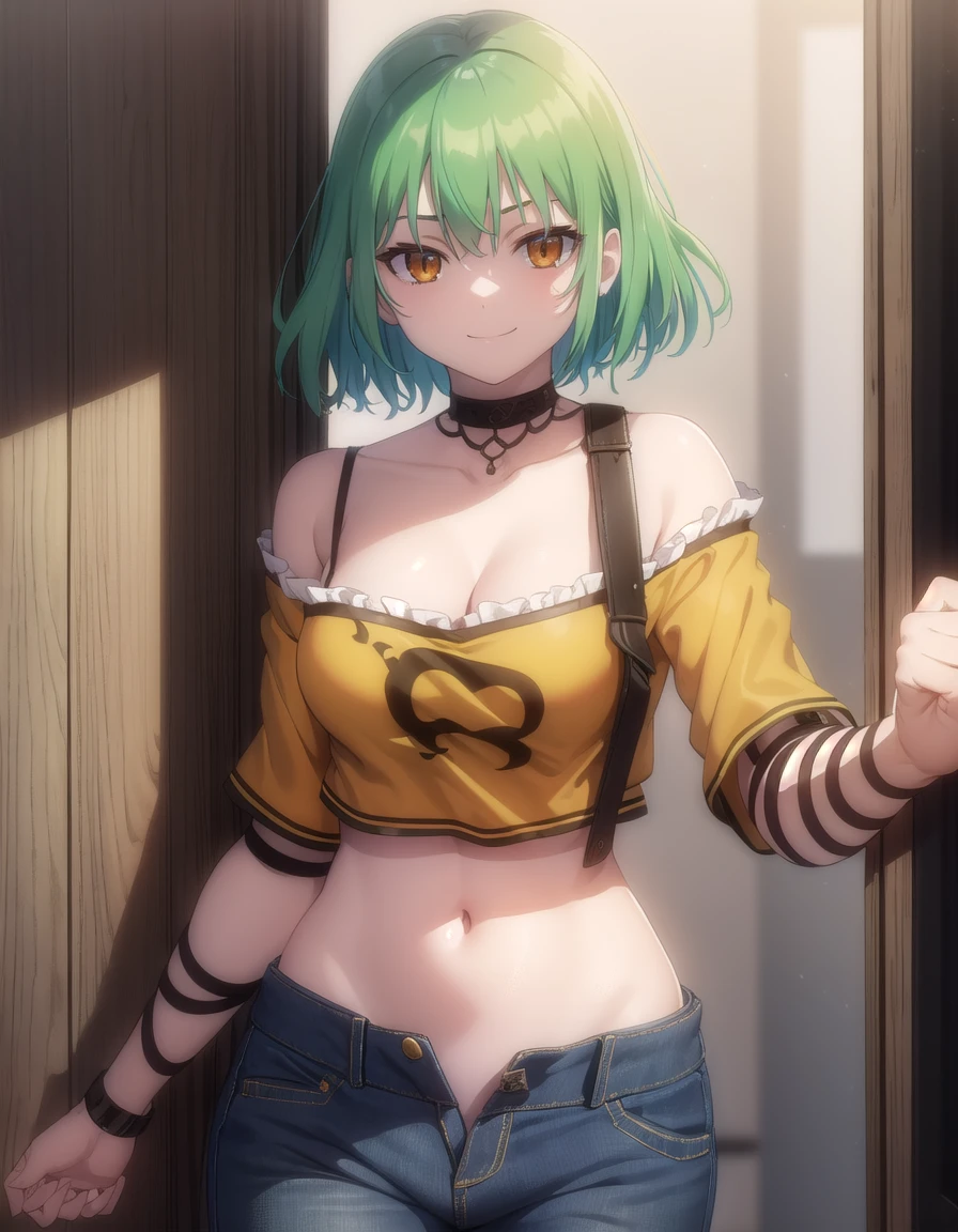 navel, midriff, pants, off shoulder, crop top, tattoo, denim, jeans, unzipped, open fly, cleavage, orange crop top,