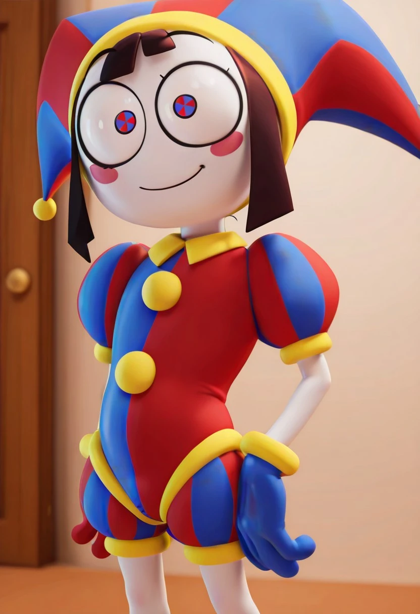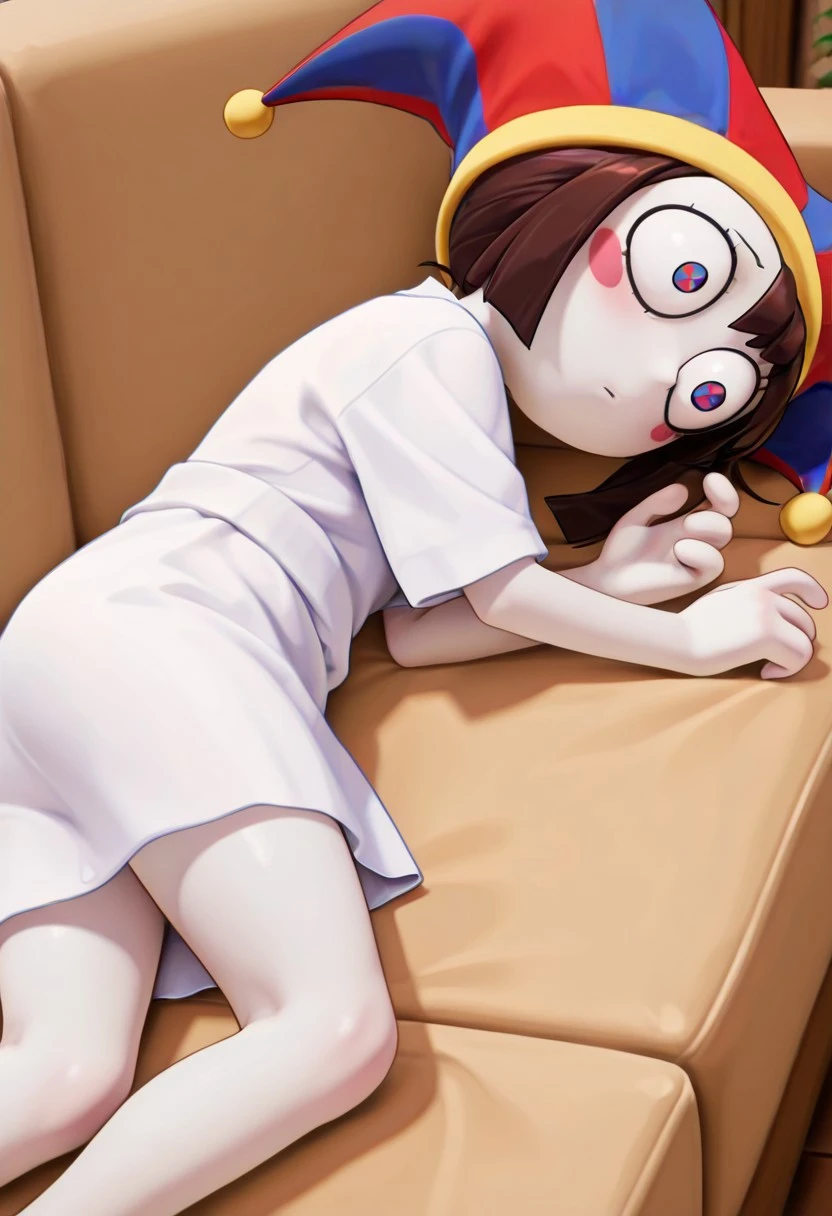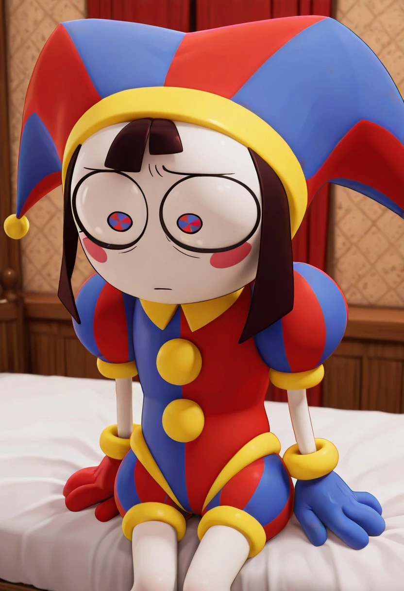 pomniv1,1girl,white skin, blush stickers, blue-red pupils, symbol-shaped pupils, brown hair,jester cap, short hair