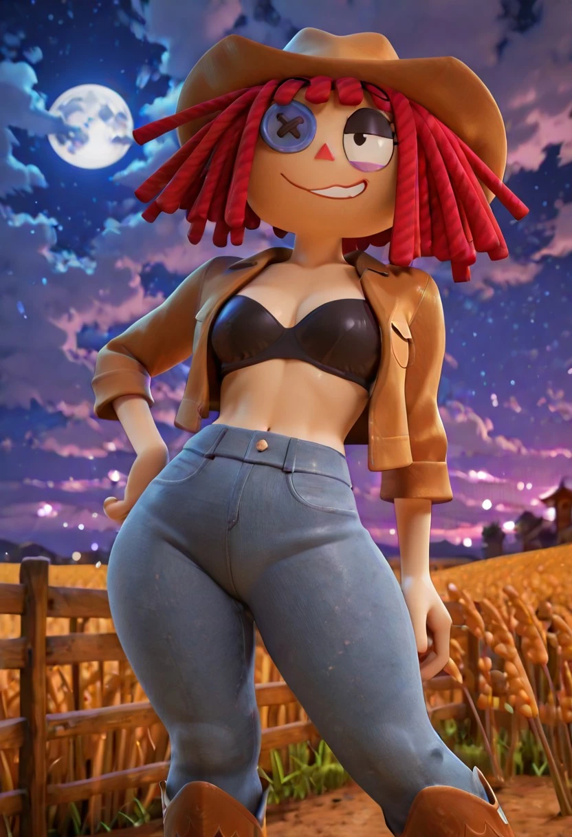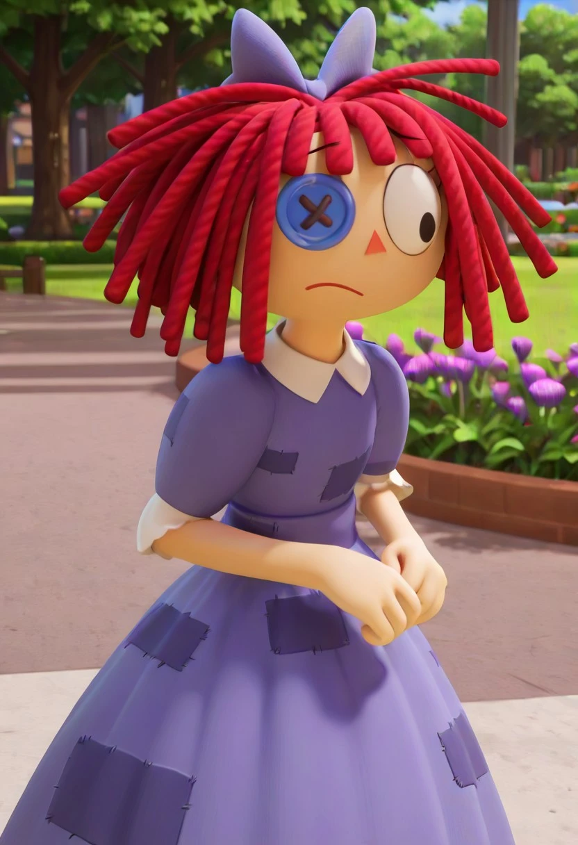 Ragathv1, 1girl,rag-doll,red yarn-like hair,red hair, flat orange triangular nose, purple bow in hair,a dark blue button as the right eye , black eyes, blue bow,