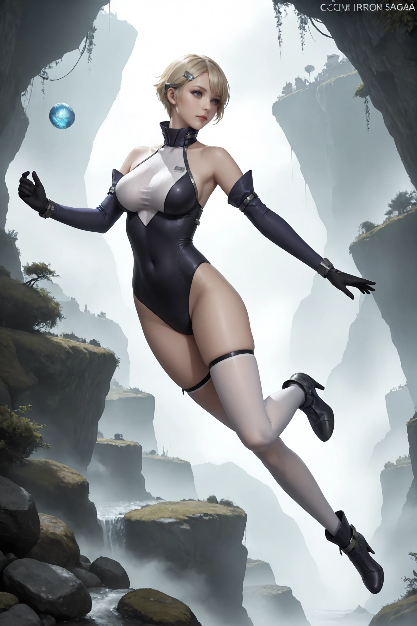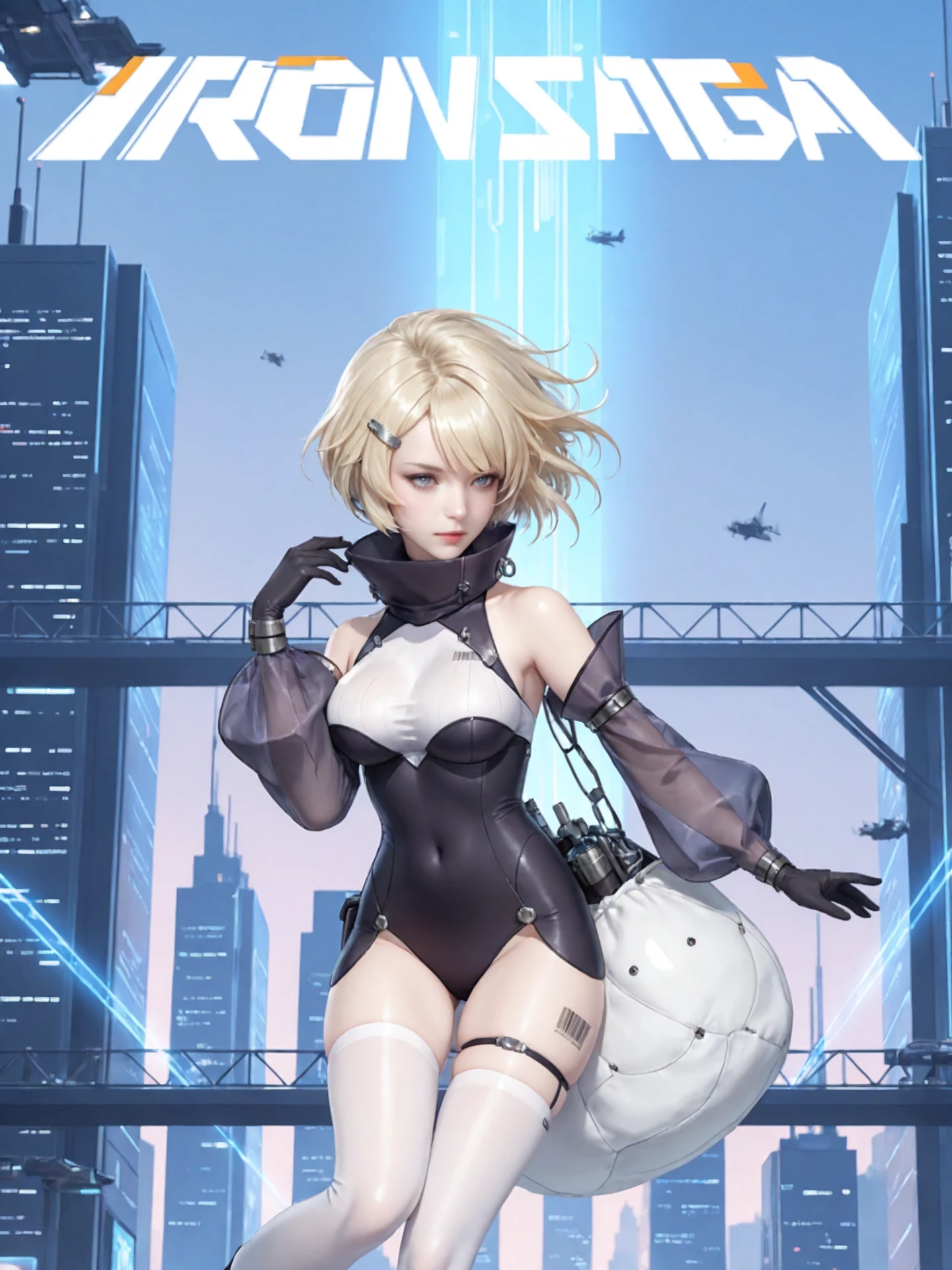 blonde_hair,short_hair,bangs,hair_ornament,hairclip, large_breasts,covered_navel,barcode,high_collar,covered_collarbone,bare_shoulders, halter_shirt,leotard,black_gloves,detached_sleeves,thigh_strap,white_thighhighs, ankle_boots,high_heels,
