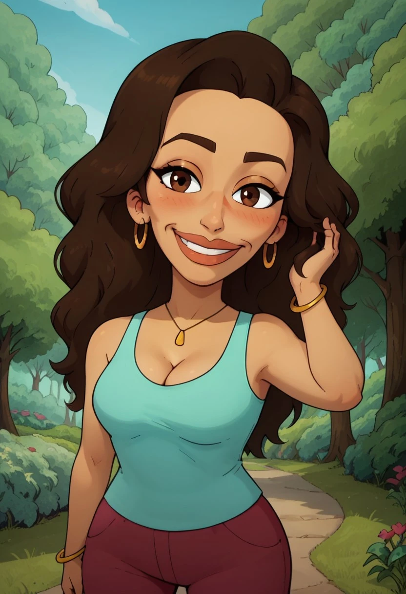 dark-skinned female, brown hair, long hair, brown eyes