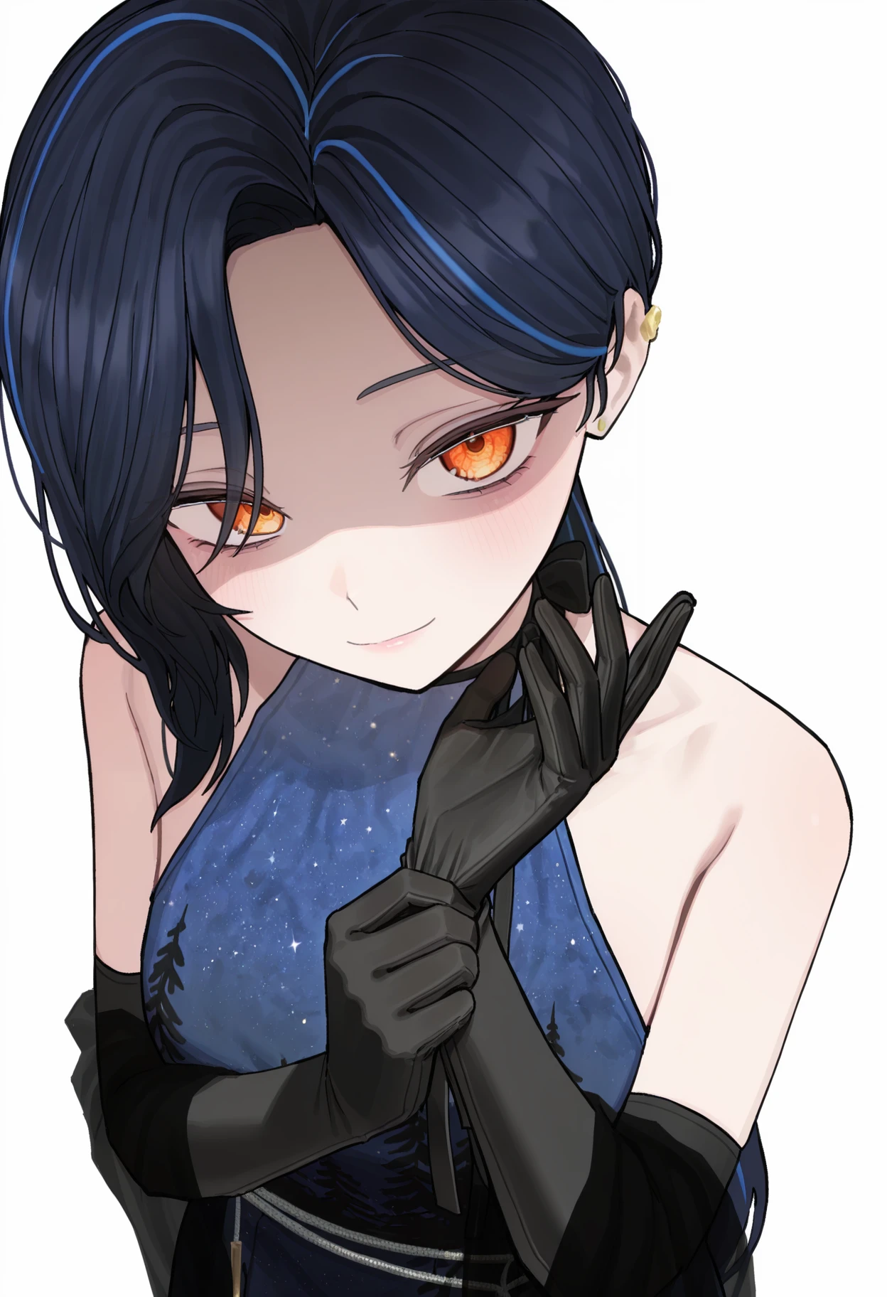• DRLP, orange eyes, dark blue hair, streaked hair, parted bangs, asymmetrical bangs, long hair, ponytail, butterfly ornament, stud earrings, ribbon choker, halterneck, sleeveless, blue dress, starry sky print, print dress, black dress, off-shoulder dress, backless dress, gradient dress, long dress, black shawl, black gloves, elbow gloves, belly chain, jewelry