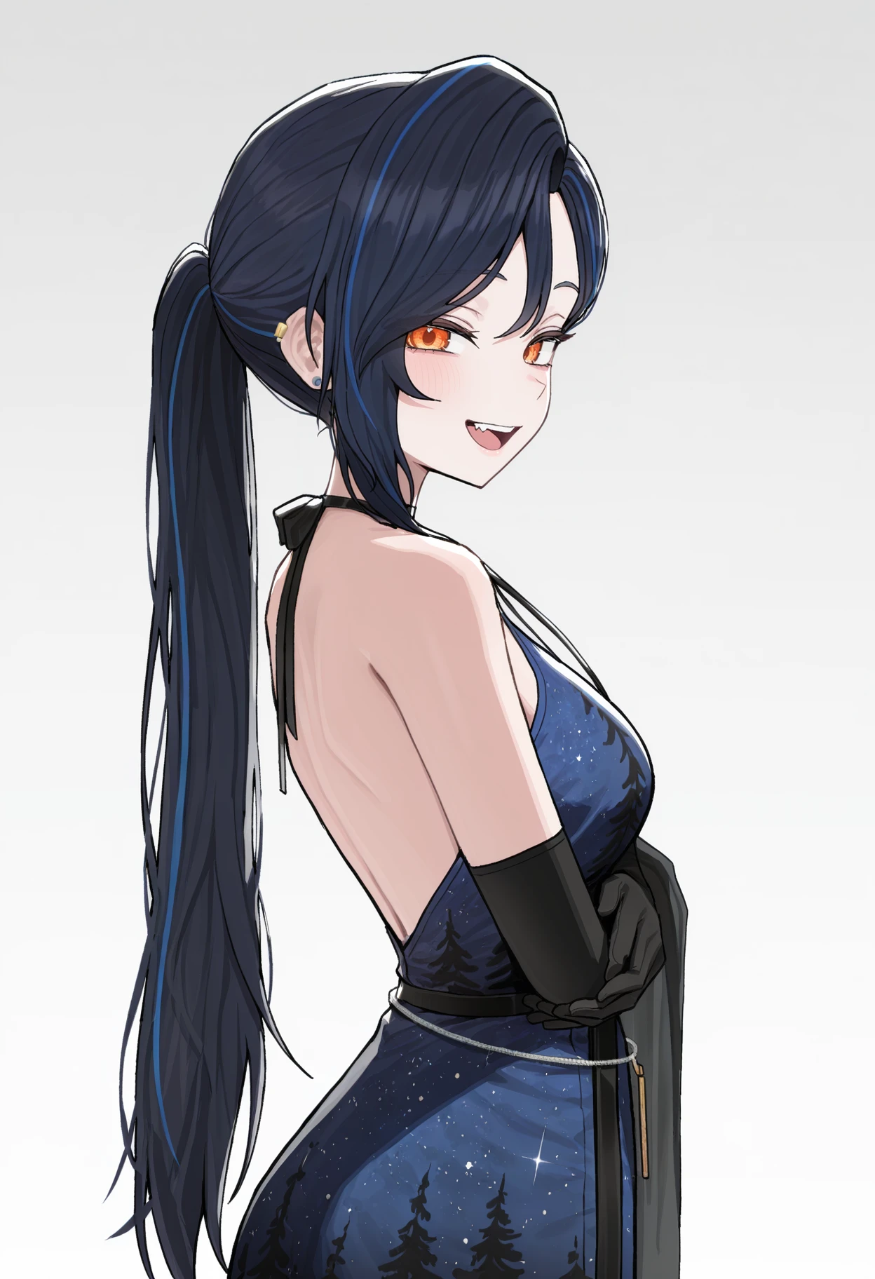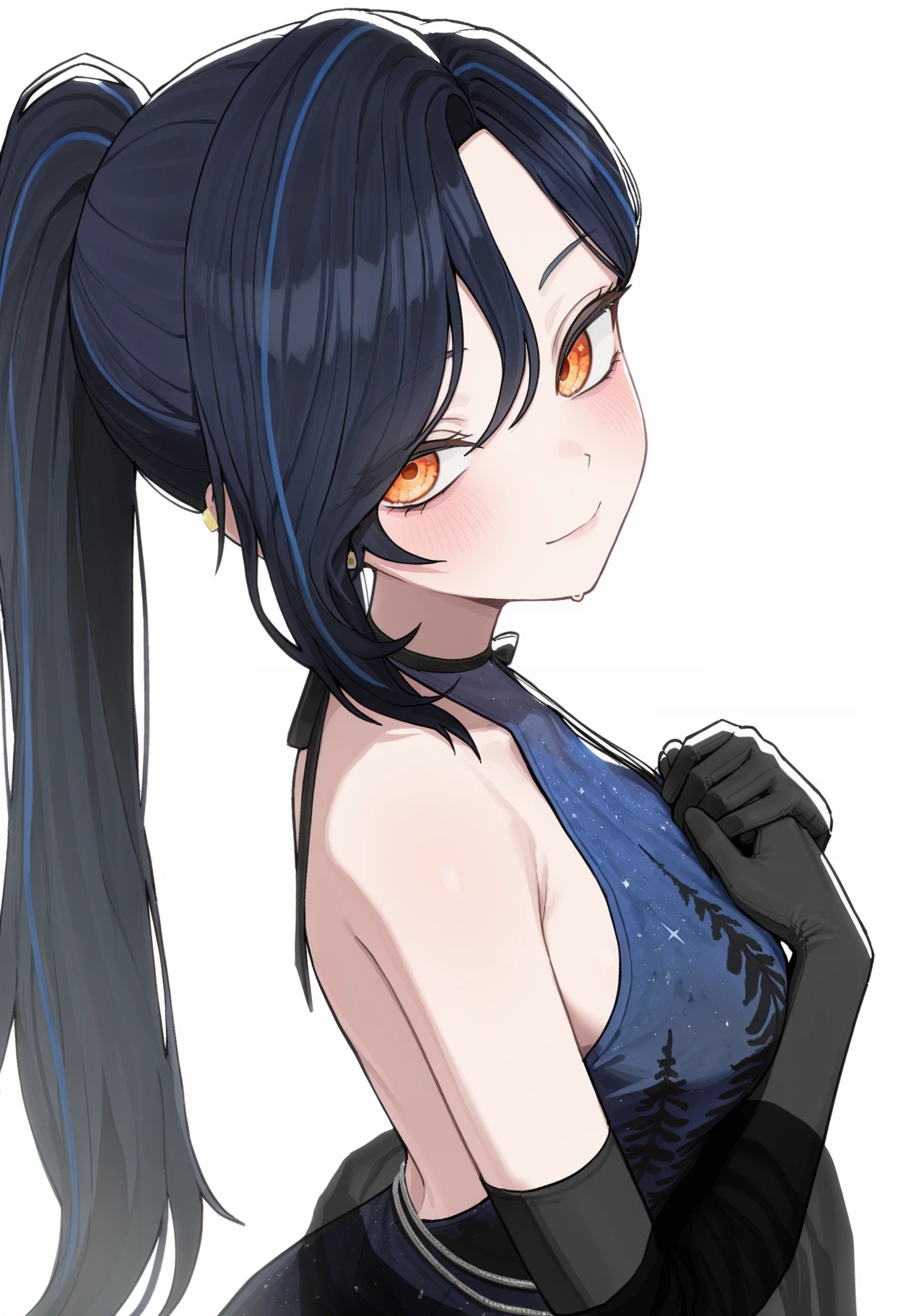 DRLP, orange eyes, multicolored eyes, dark blue hair, streaked hair, parted bangs, asymmetrical bangs, long hair, ponytail, ear piercing, stud earrings, ribbon choker, halterneck, sleeveless, blue dress, starry sky print, print dress, black dress, off-shoulder dress, backless dress, long dress, black shawl, black gloves, elbow gloves, belly chain, jewelry