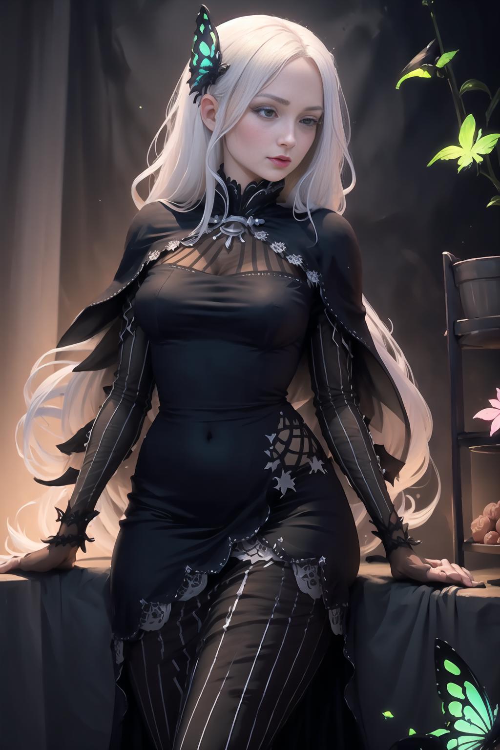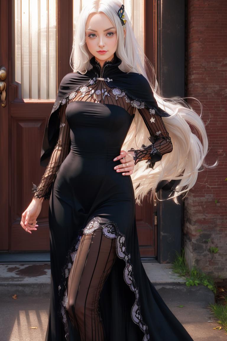 EchidnaRZM, colored eyelashes, long dress, black dress, vertical-striped dress - For her base outfit.