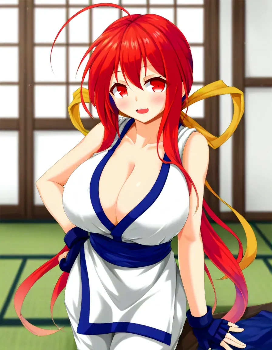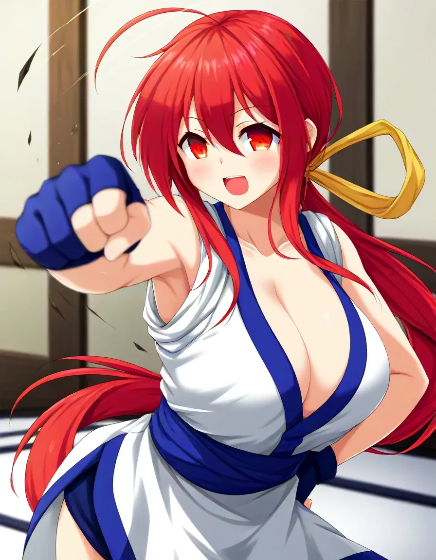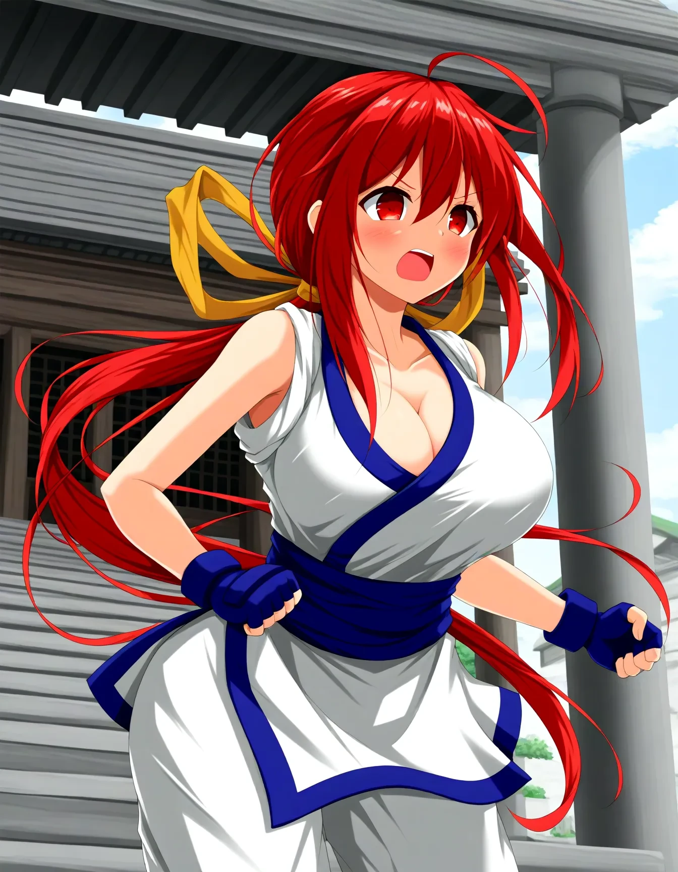 AKFG01, solo, long hair, breasts, large breasts, gloves, ribbon, cleavage, very long hair, ponytail, fingerless gloves, dougi, hair ribbon