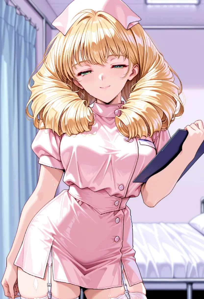 shinohara_emi, green eyes, blonde hair, drill hair, twin drills, large breasts