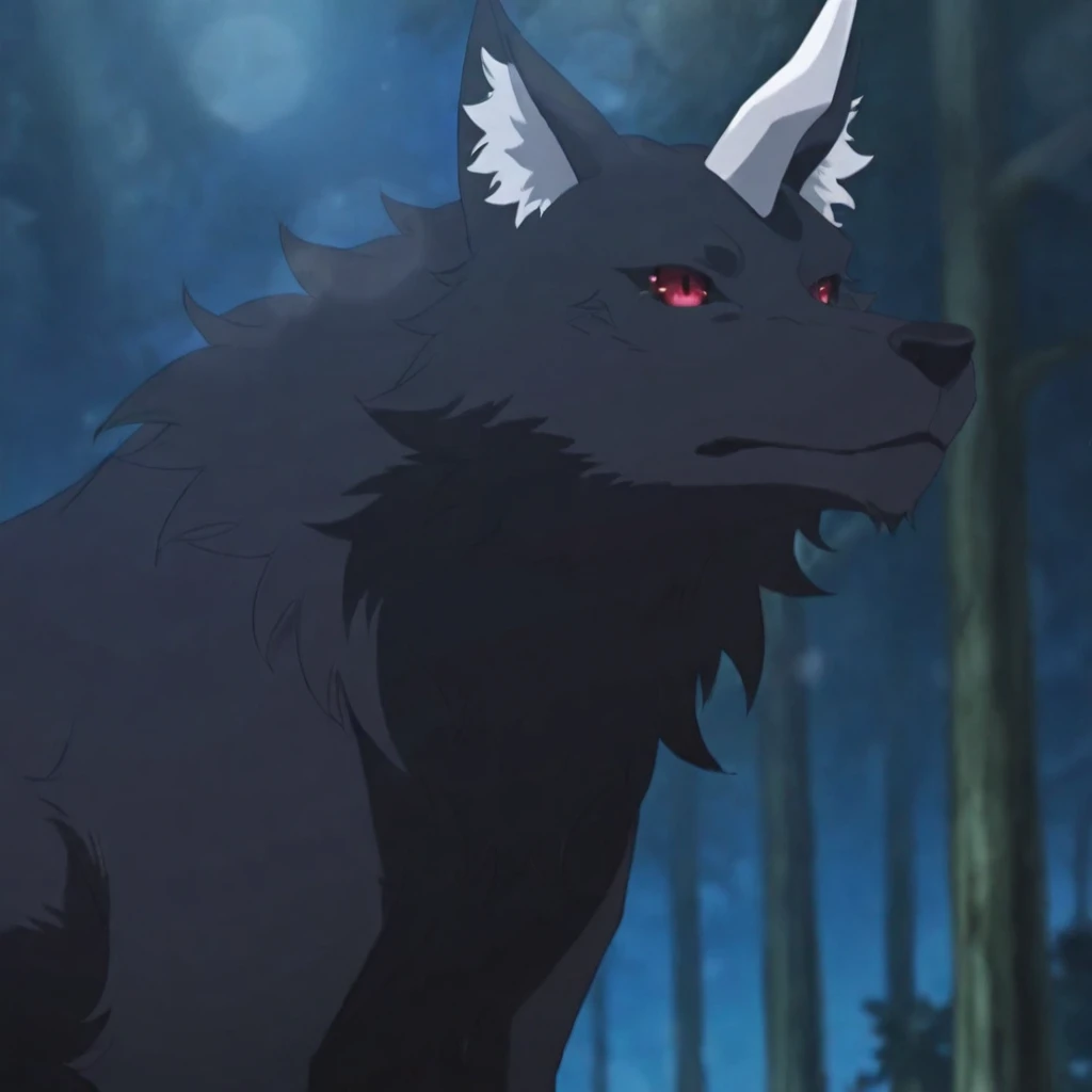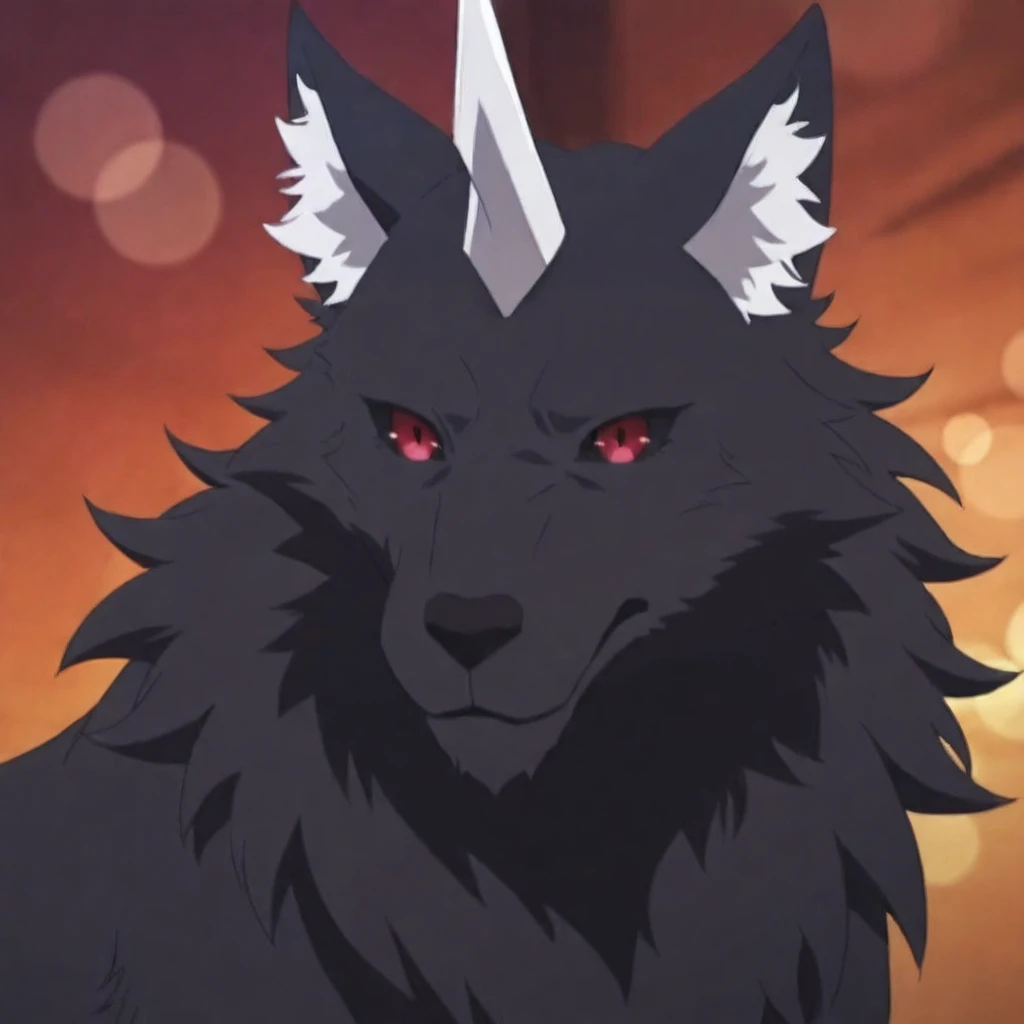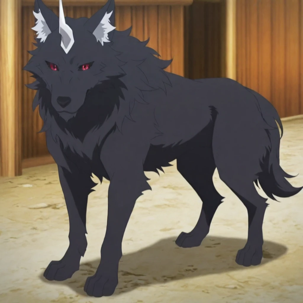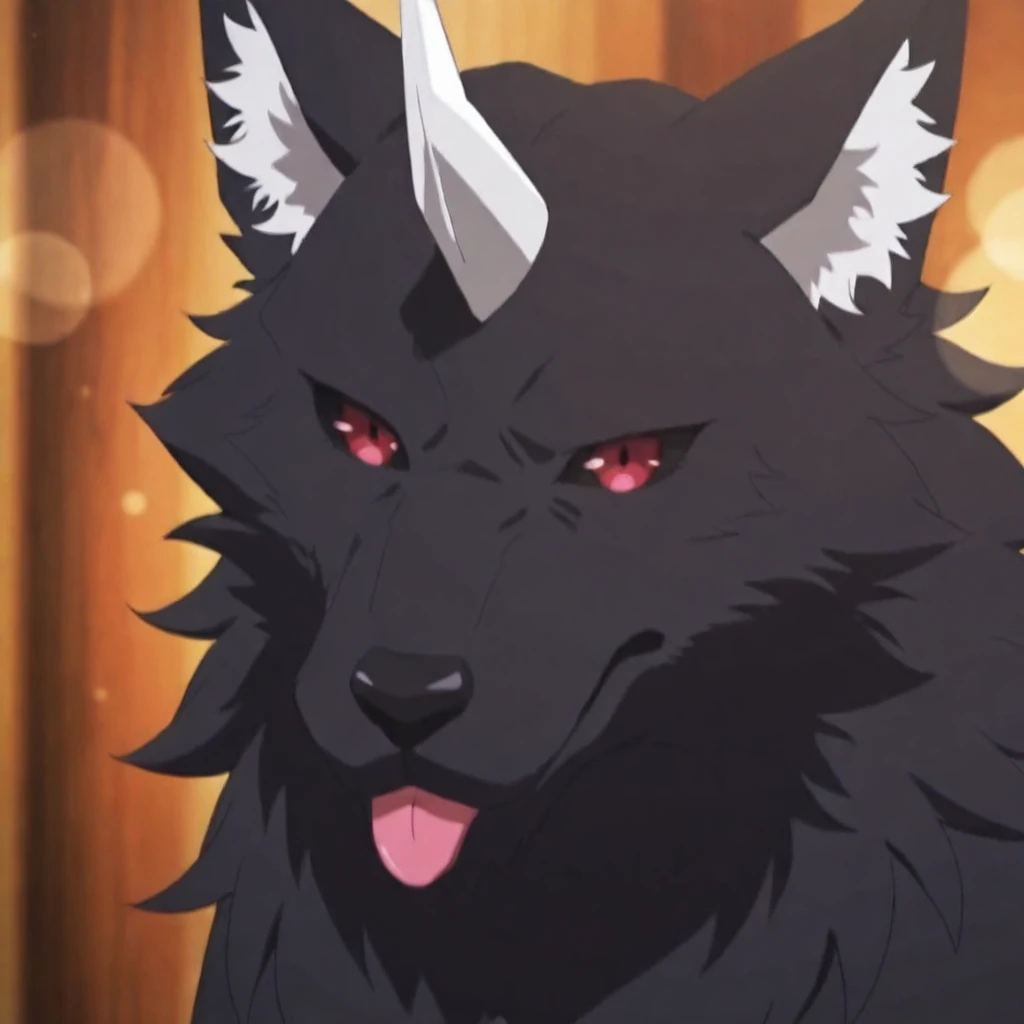 krfrmnglfmod0124_il, screencap, no humans, wolf, black fur, red eyes, black sclera, single horn, solo, white ear tuft