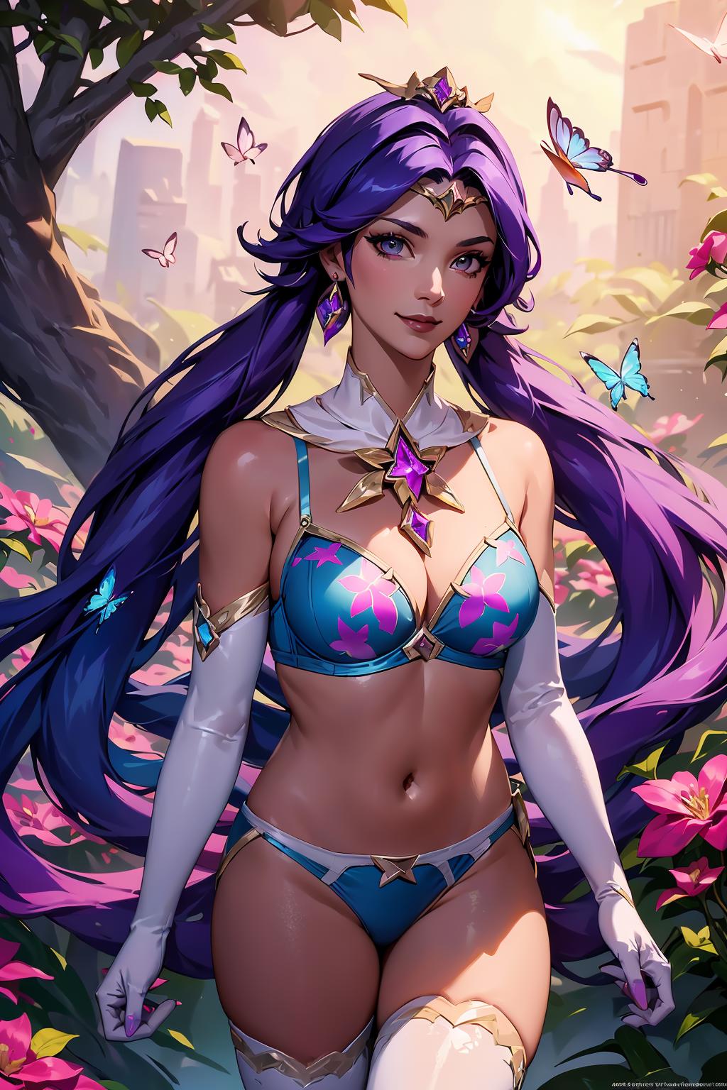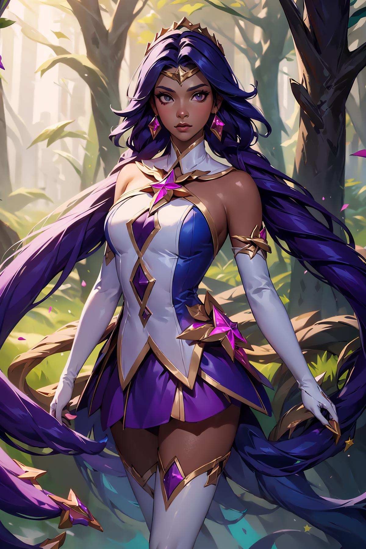 Tags: starguardiannilah, (white thighhighs, elbow gloves, hair ornament, star guardian \(league of legends\), chocker, long hair, purple hair, low twintails, chest jewel, star \(symbol\), tiara)
