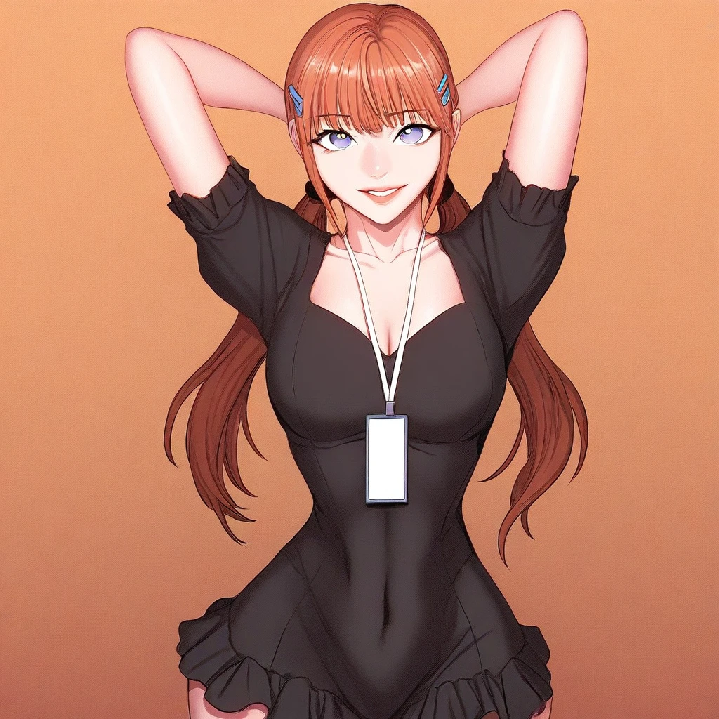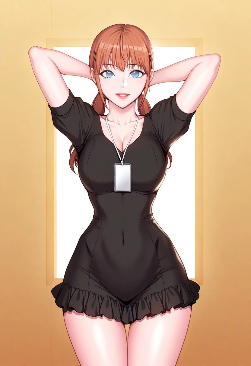6. ((beautiful sheer high-collar short-sleeves black dress with frills, cleavage, white id card holder with white lanyard, hair clips, ))