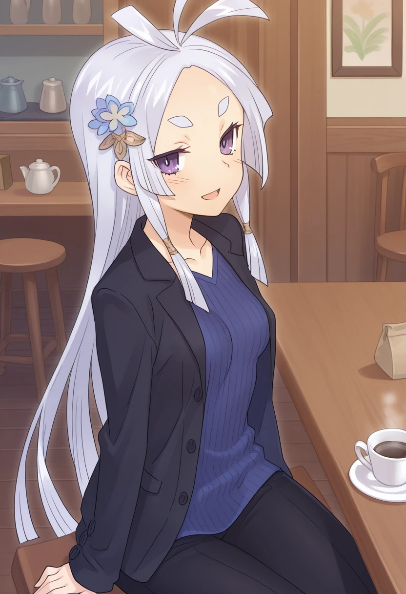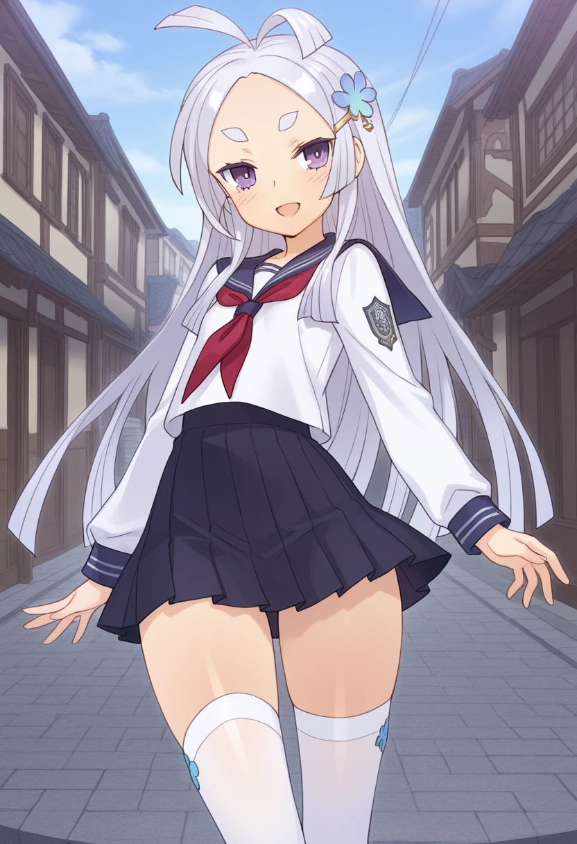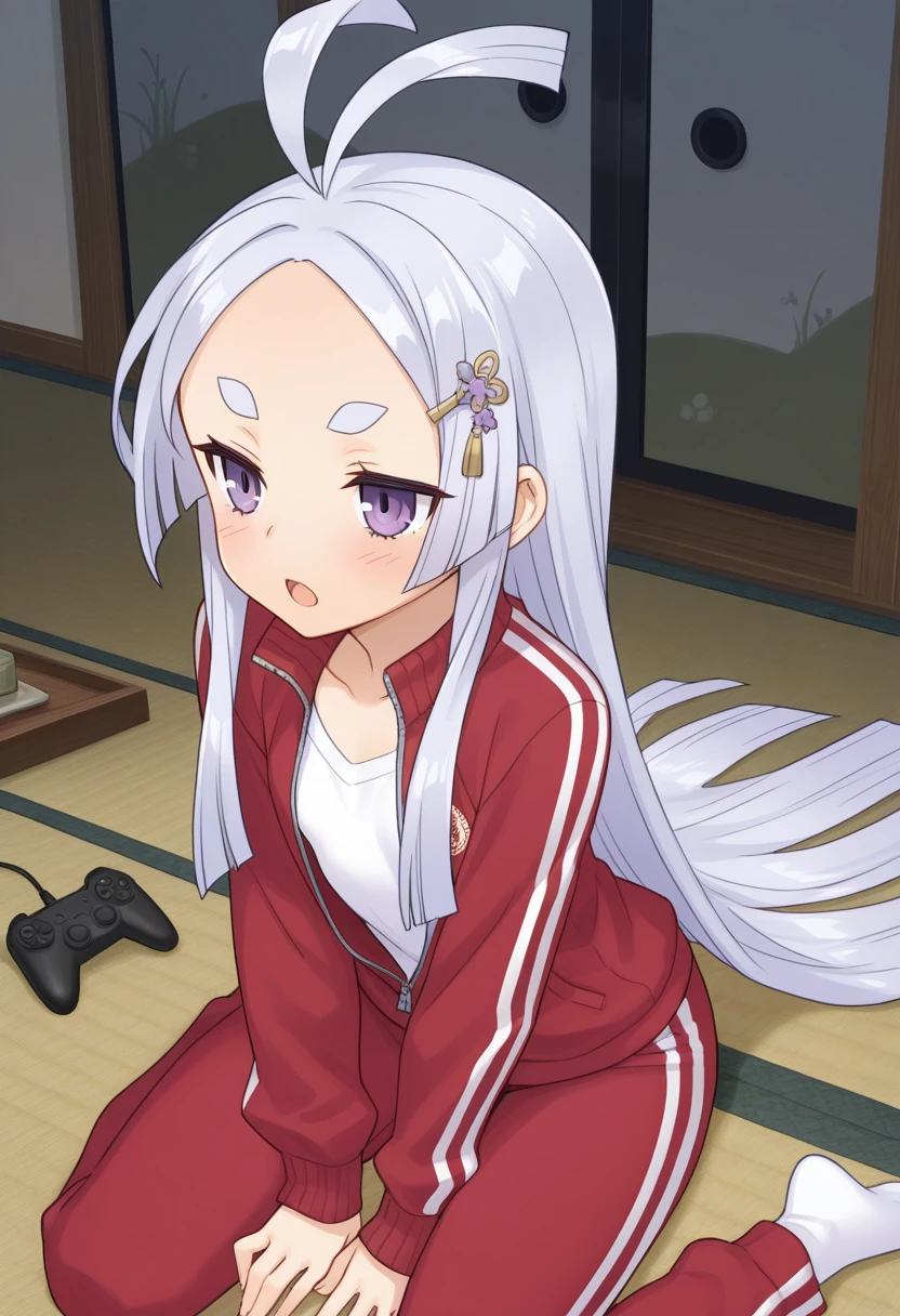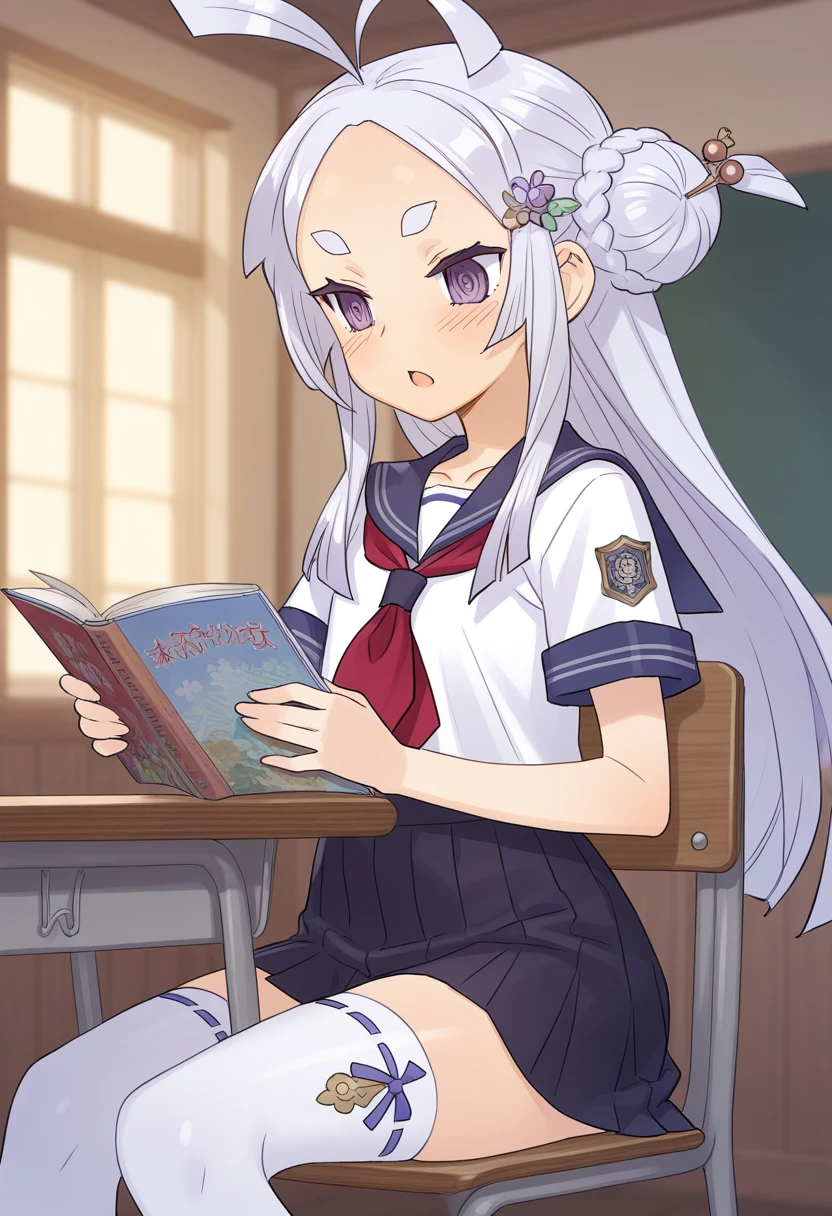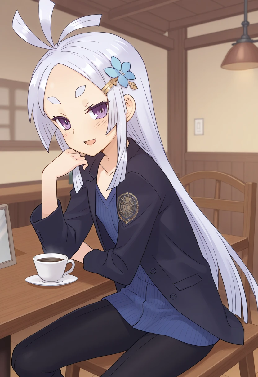 nobukatsu_muramasa, grey hair, long hair, straight hair, ahoge, thick eyebrows, hikimayu, purple eyes, flat chest