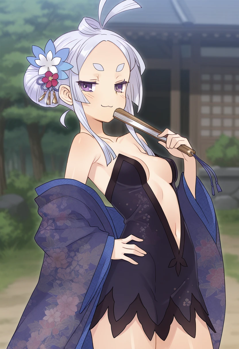 nobukatsu_muramasa, grey hair, long hair, single hair bun, ahoge, thick eyebrows, hikimayu, purple eyes, flat chest