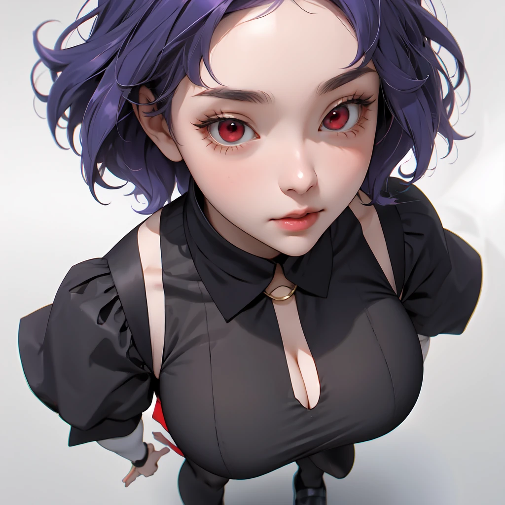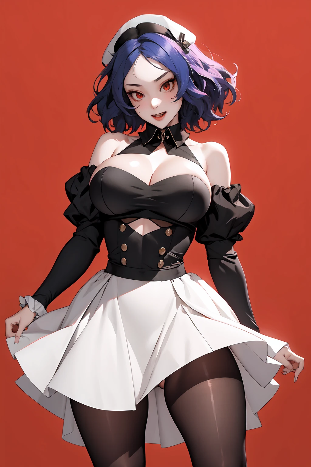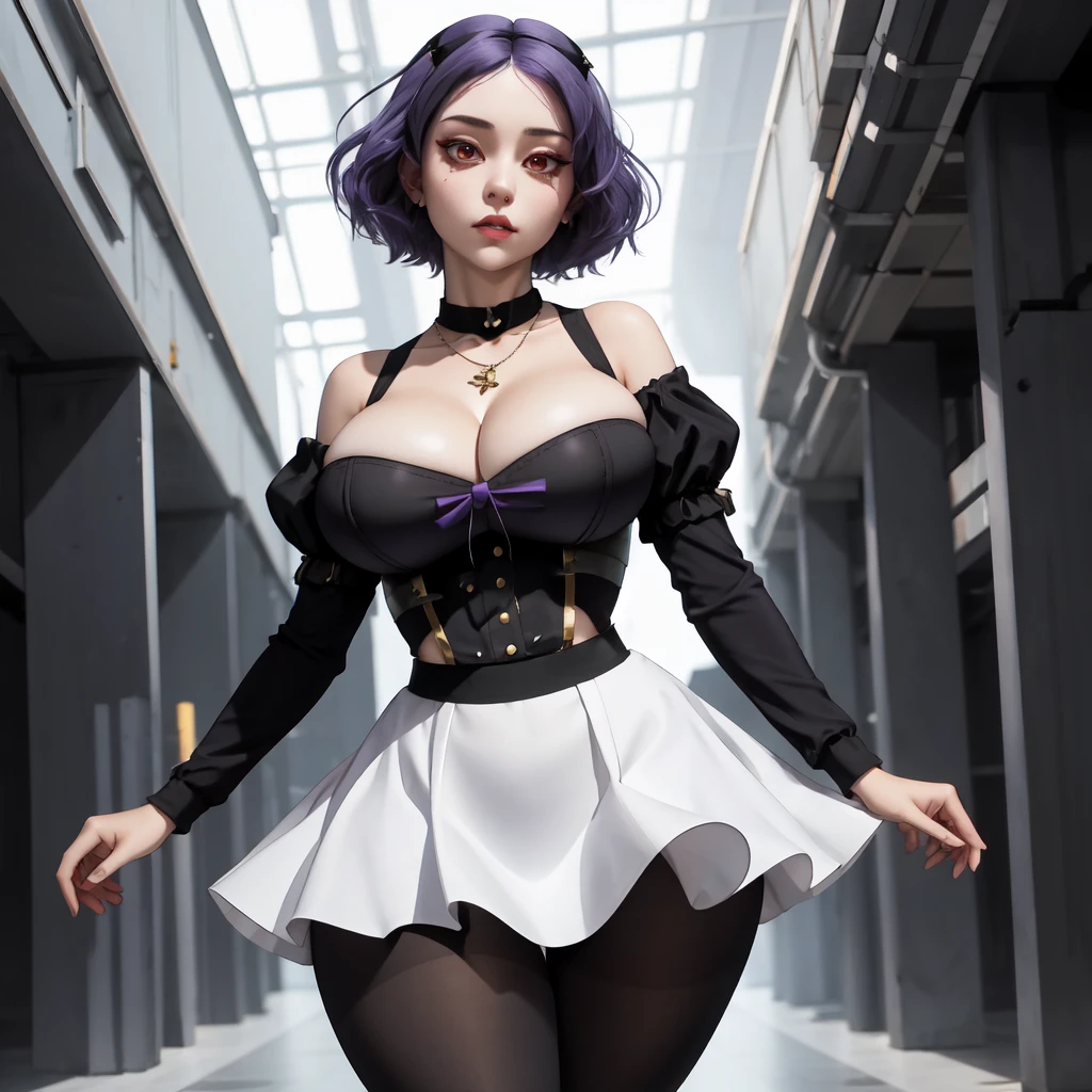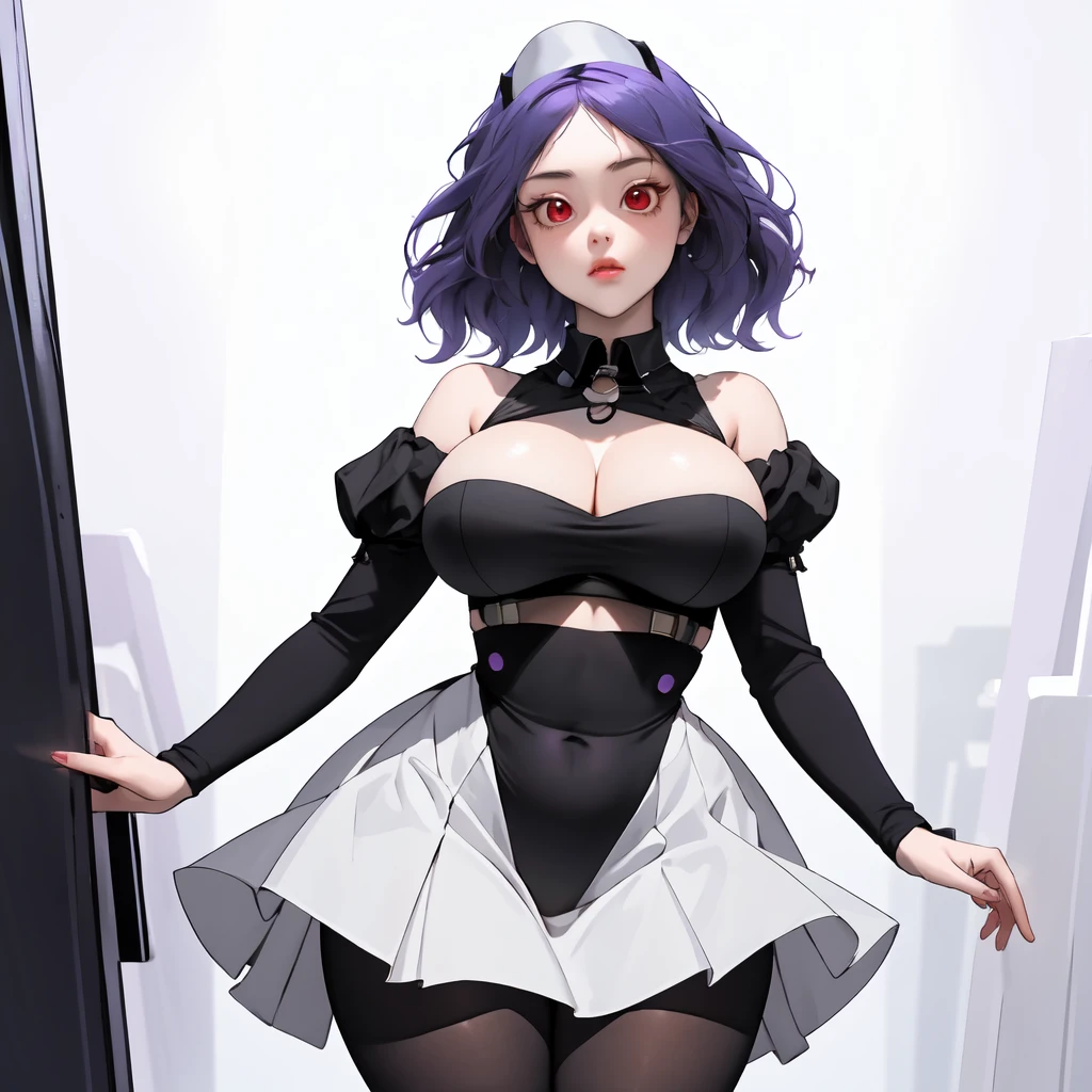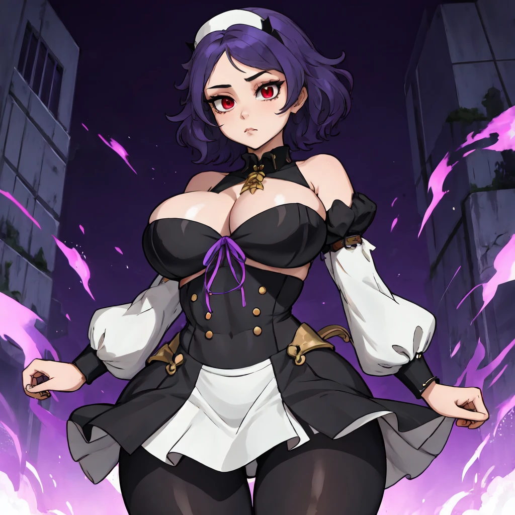Tags for default look: "red eyes, headdress, detached sleeves, skirt, dress, black pantyhose, short hair, purple hair"
