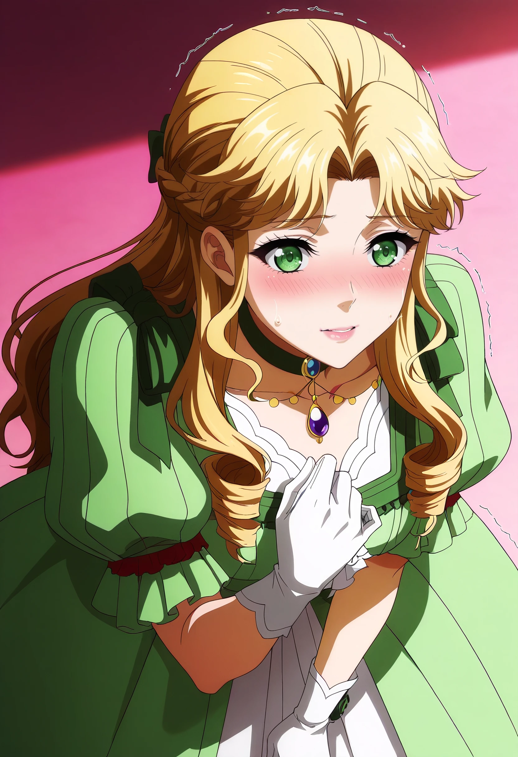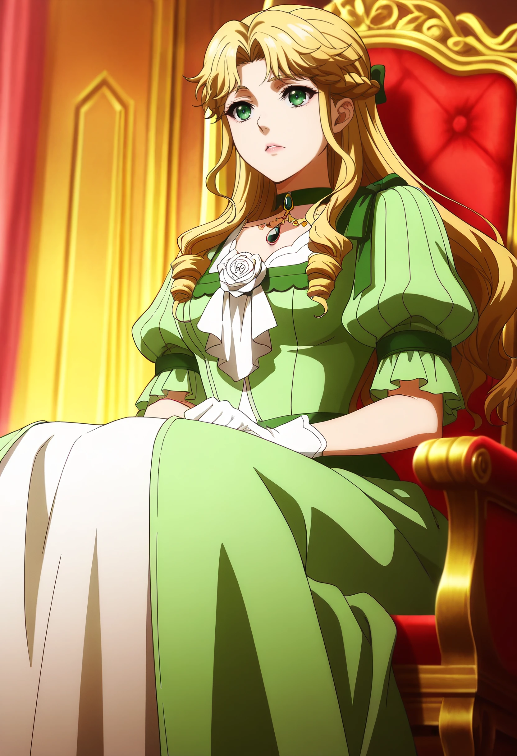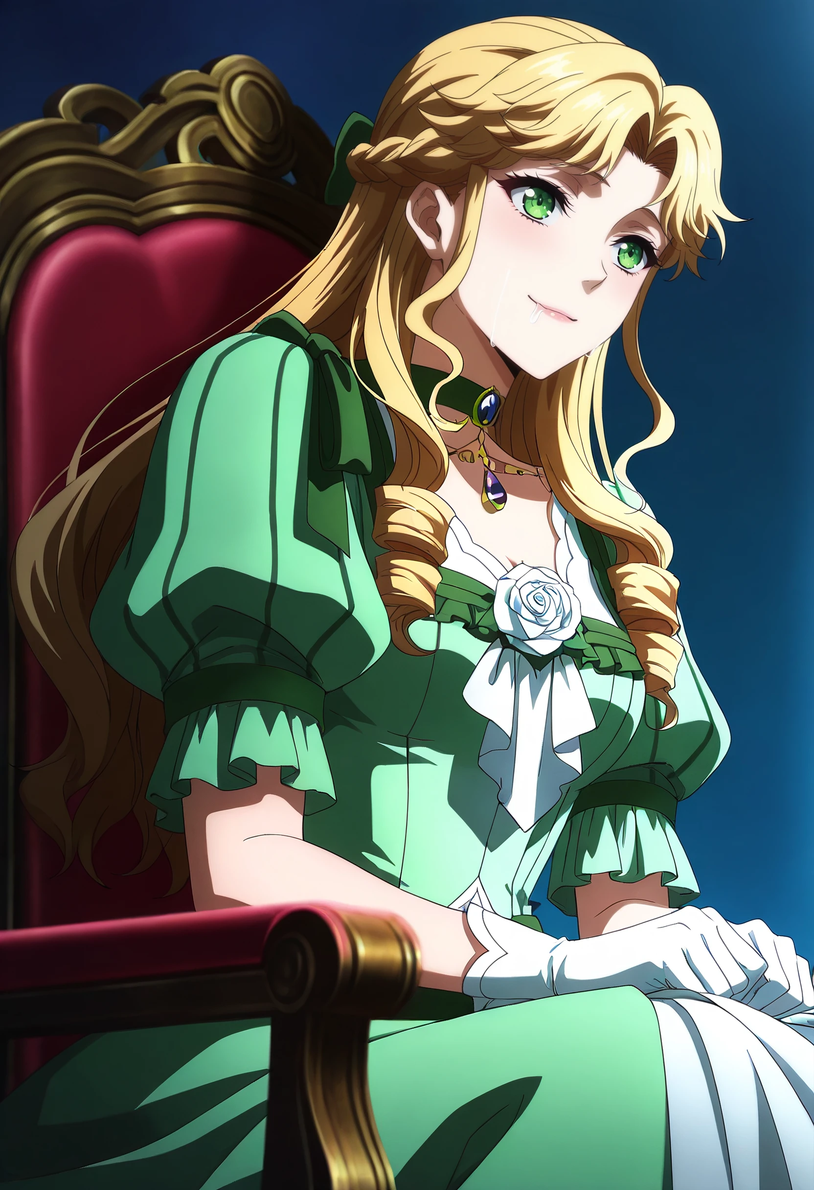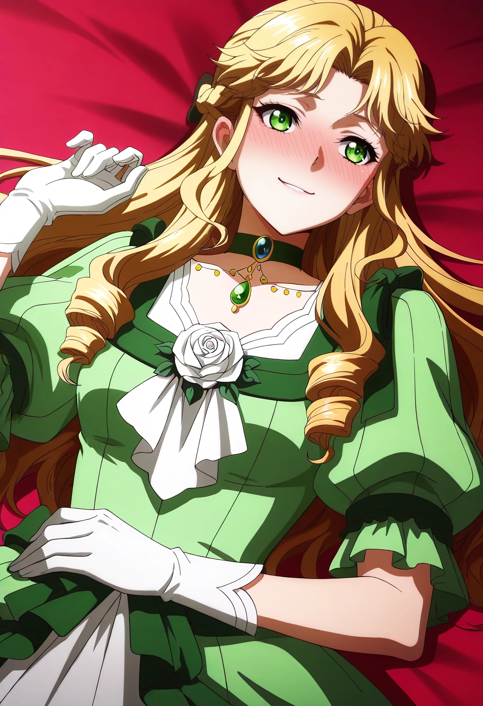 AudreyOutfit, green dress, dress, flower, rose, choker, puffy sleeves, jewelry, green choker, gem, bow, green gemstone, puffy short sleeves, gown, gloves, necklace, white gloves, victorian, long dress, frilled dress,